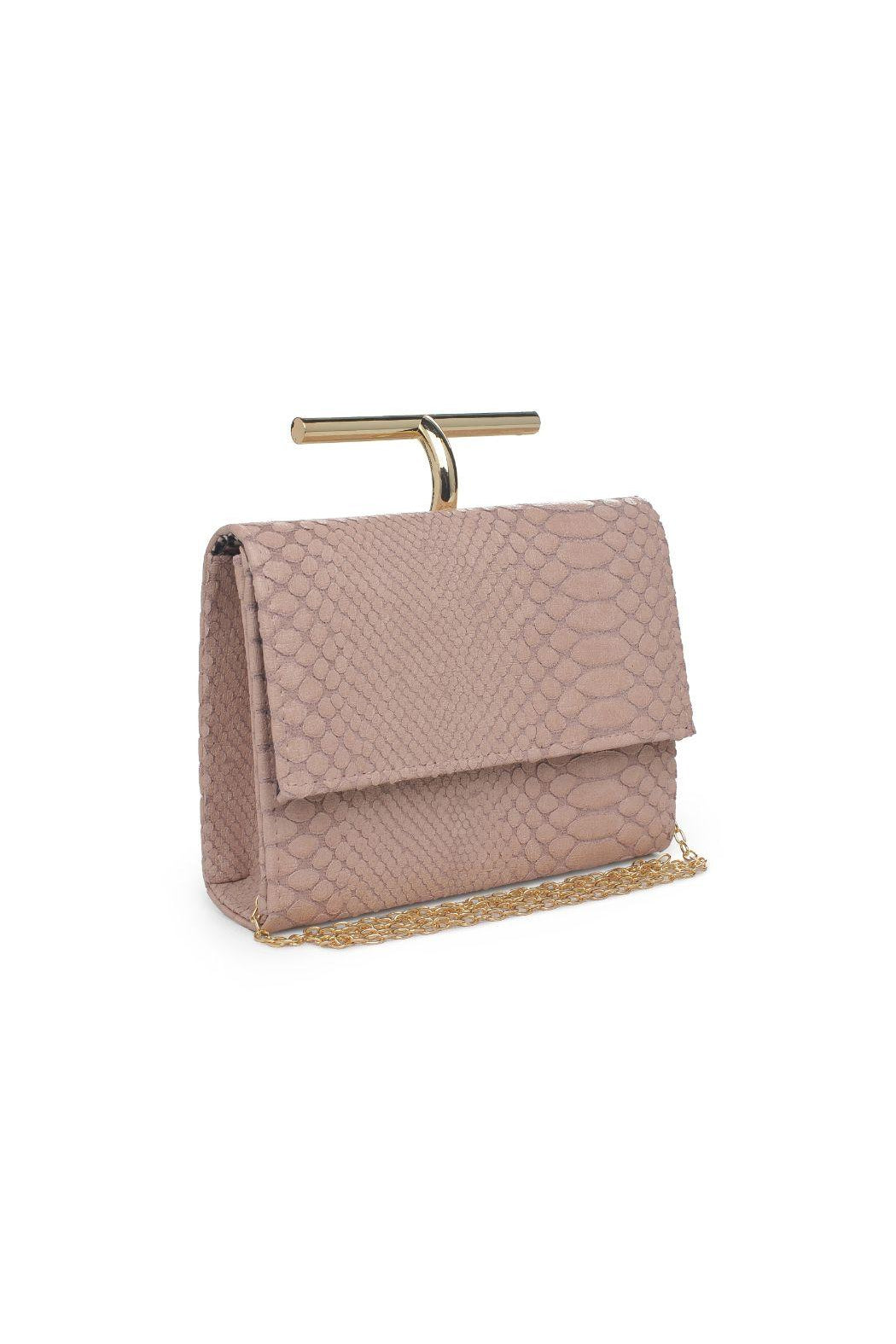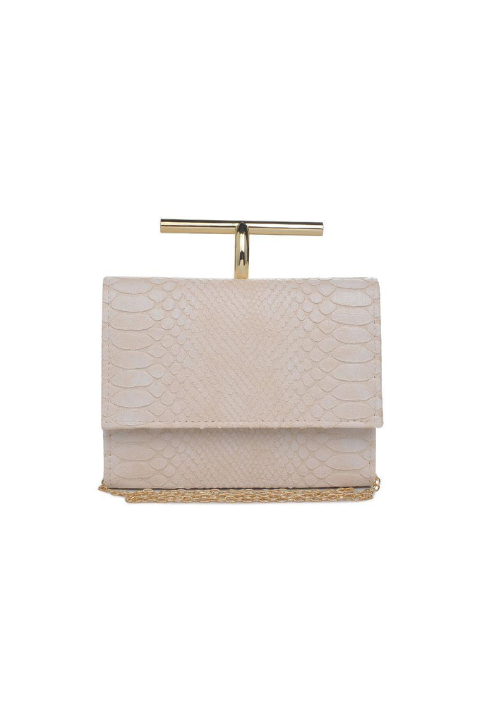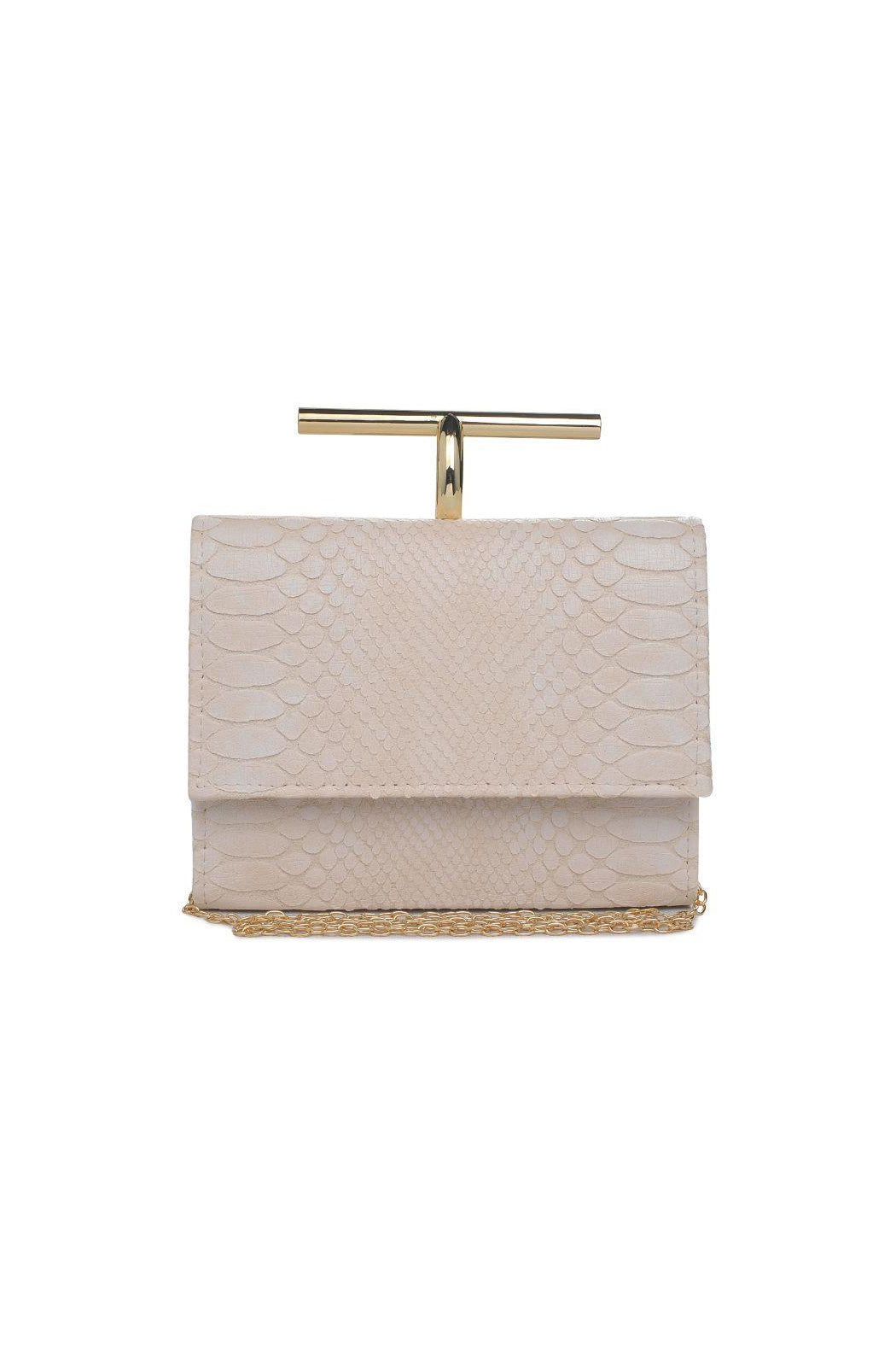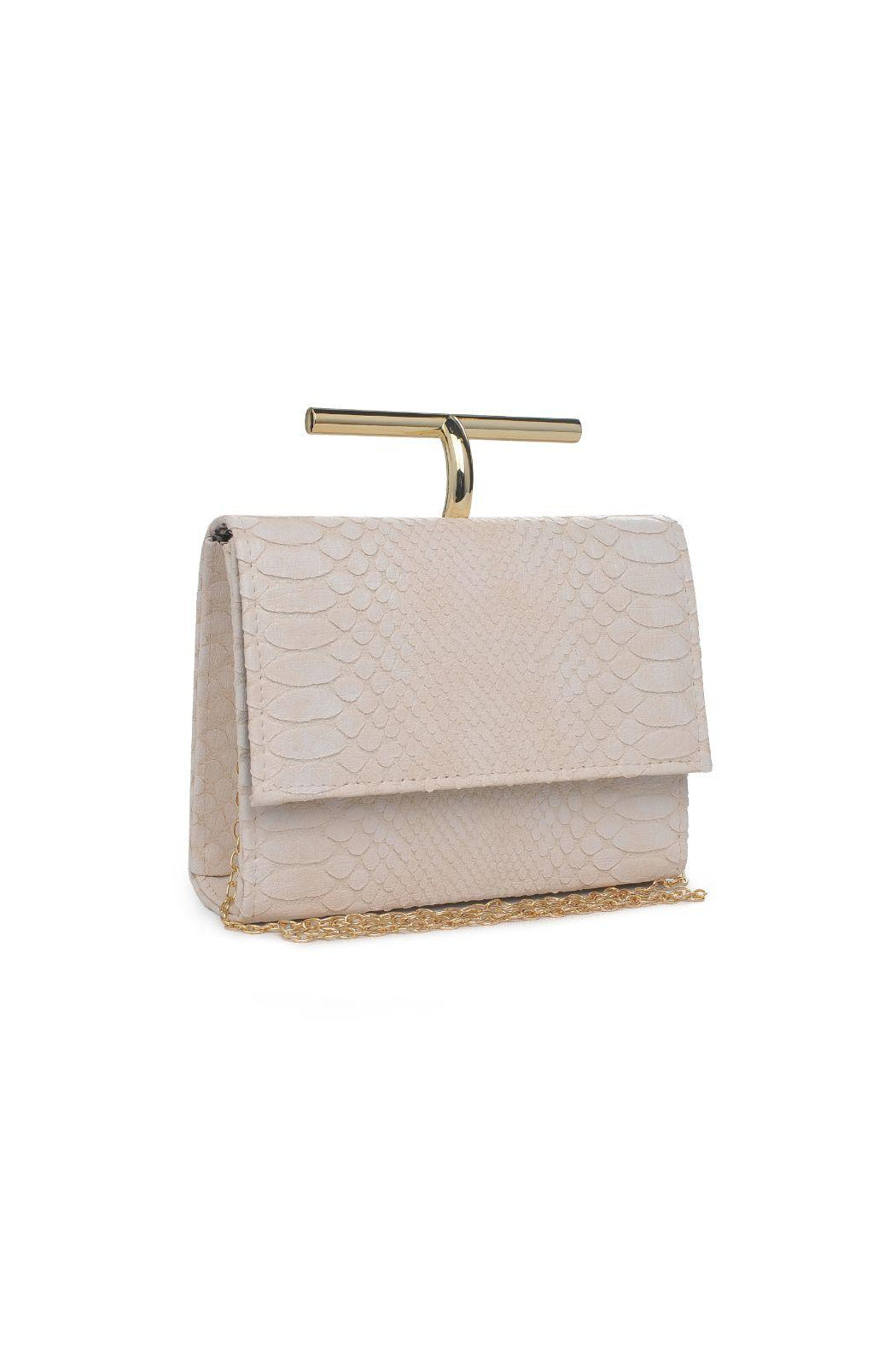 Exterior Details: Snakeskin pattern, gold t-shaped top handle, snap front flap