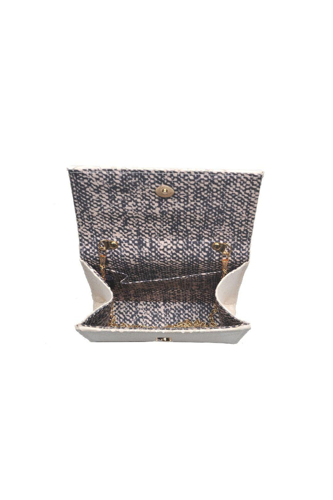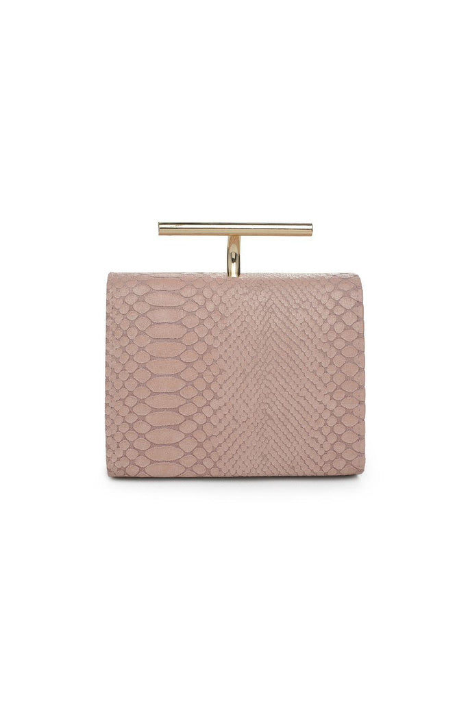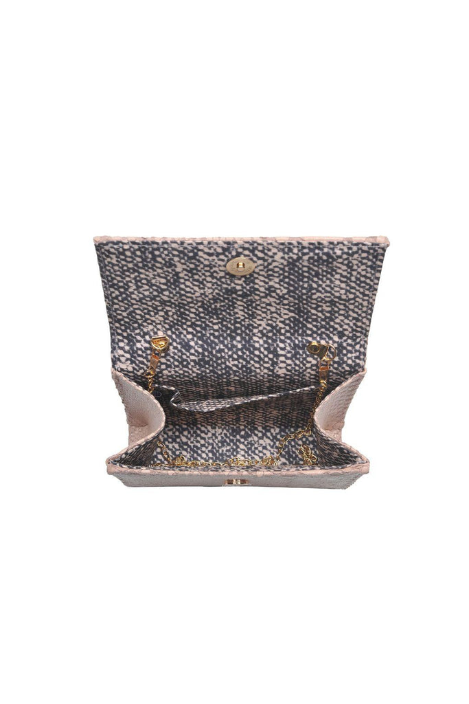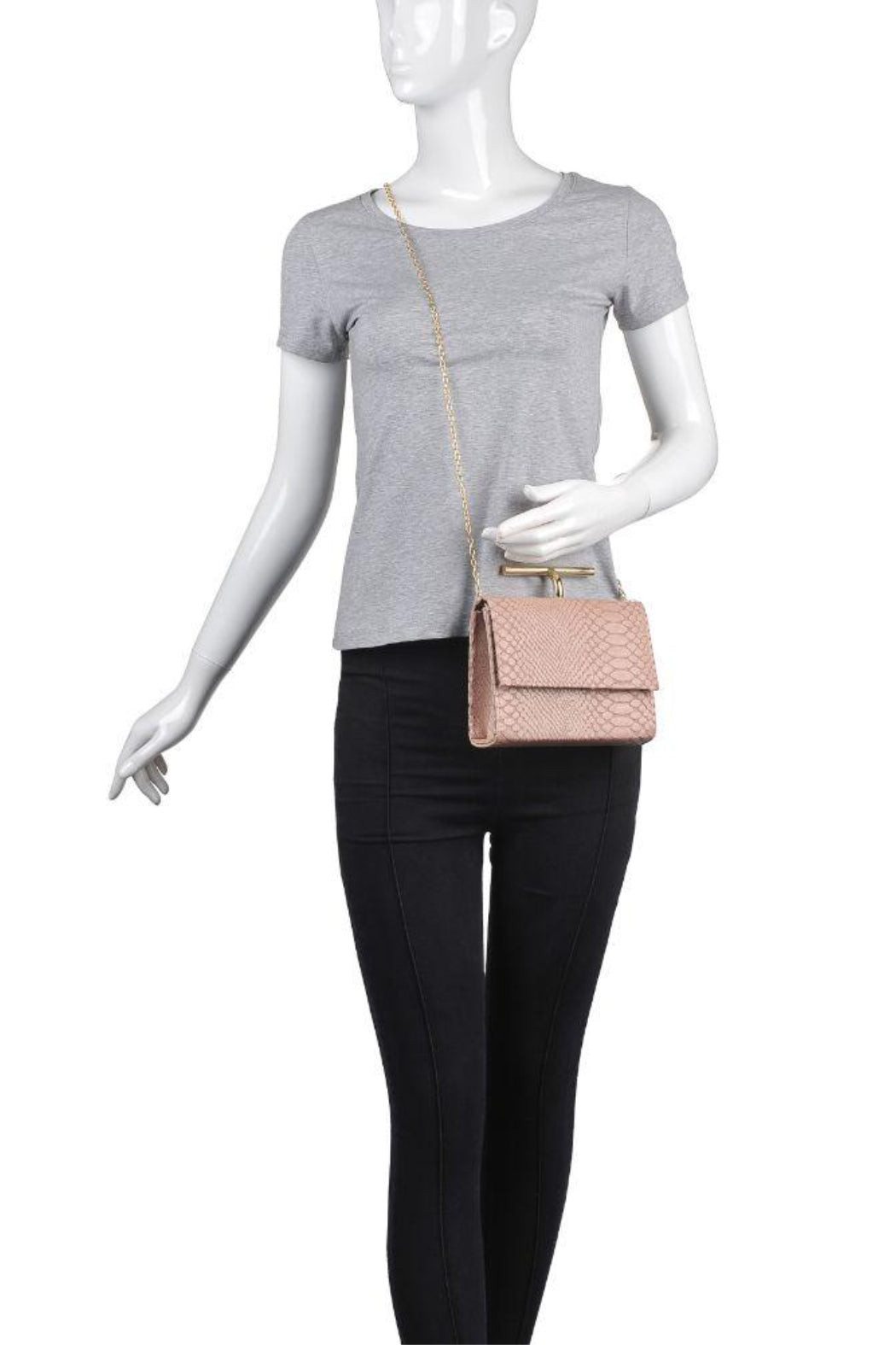 Exterior Details: Snakeskin pattern, gold t-shaped top handle, snap front flap