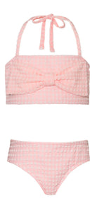 A kids bikini with halter straps and a bow on the front. Moms can match their daughters in one of PQ Swim's Paisley Coast sets for adults. PQ Swim's kids suits run small so we recommend sizing up if you are unsure.