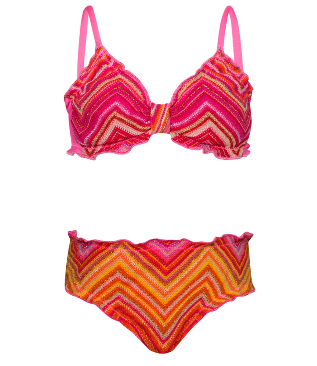 Get ready for picture-perfect poolside moments with your little girls' Gingham Lettuce Edge Bikini. This charming set pops in warm pinks and yellows, with a classic gingham checkered pattern that’s always in style. The top is cinched at the center to create a sweet, feminine shape, and the playful ripple of lettuce edge stitching adds a whimsical touch to the borders. It’s a sunny-day essential that blends timeless design with a fun twist, perfect for your little one's swim-time joy. Hand wash cold. Hang to dry