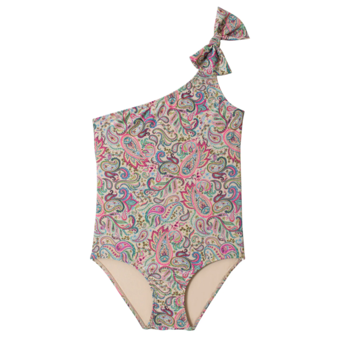 This kids one piece features a whimsical pattern, one shoulder strap, and a bow! Moms can match their daughters in one of PQ Swim's Paisley Coast sets for adults. PQ Swim's kids suits run small so we recommend sizing up if you are unsure.