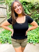 Exceptional quality meets I still have money for Starbies meets trendy 2000 nostalgia vibes = our newest luxury basic! Our lace trim tees will make you want to pop in your Britney Spears CD, throw on your fave low rise cargos, & hit the mall! The flattering ribbed fabric is classy, the buttery soft ultra stretch feel makes her comfy, & the adorable lace trim with front bow details makes her stinking cute. Versatile for any age, any season, & outfit! Why choose one color when you can get all for a steal?!