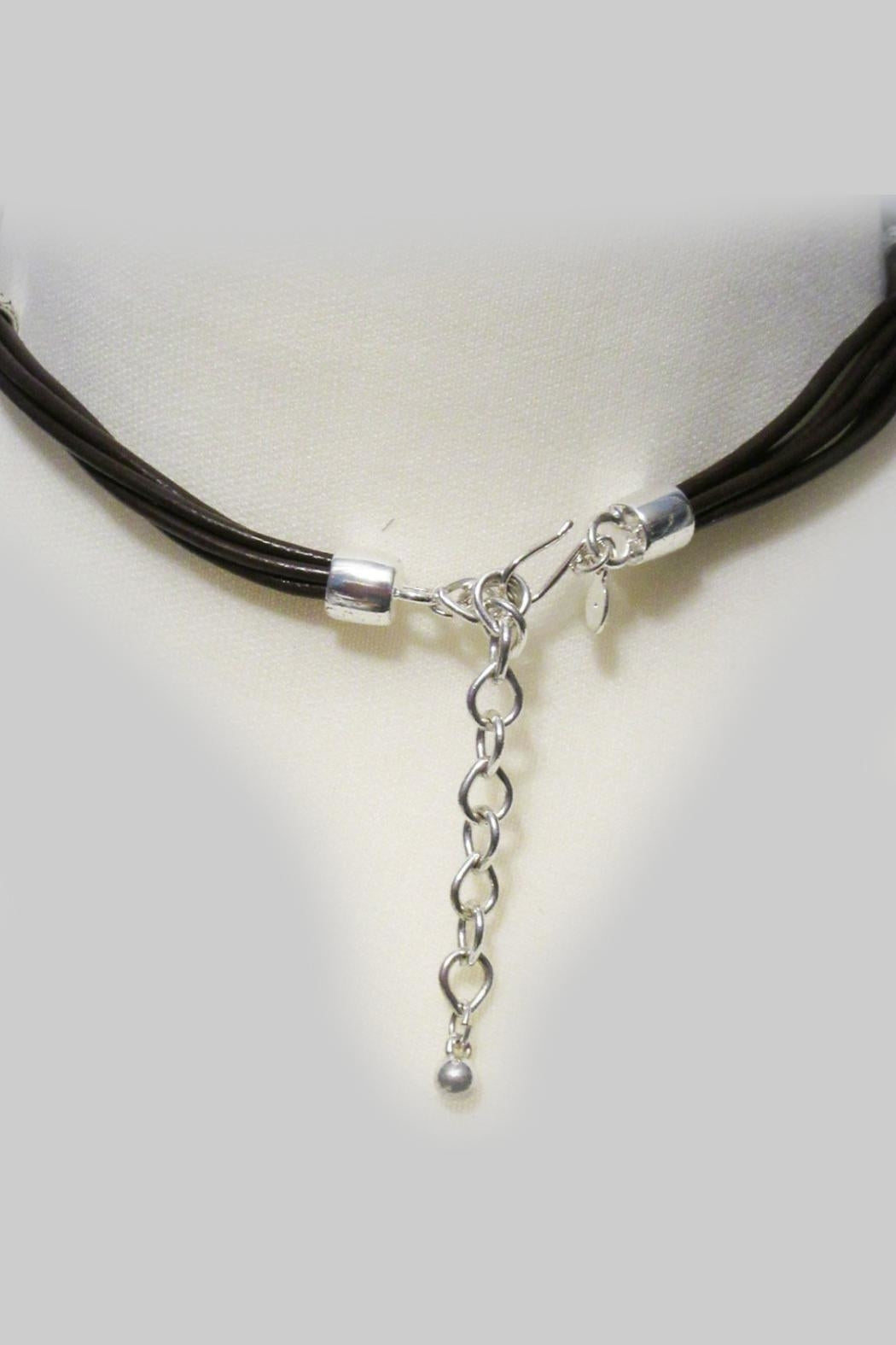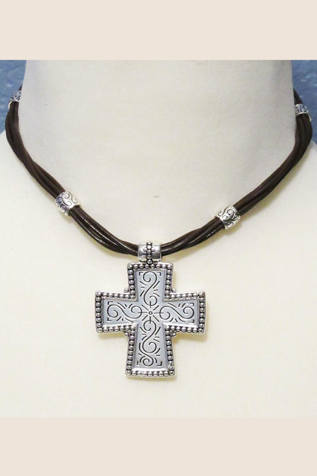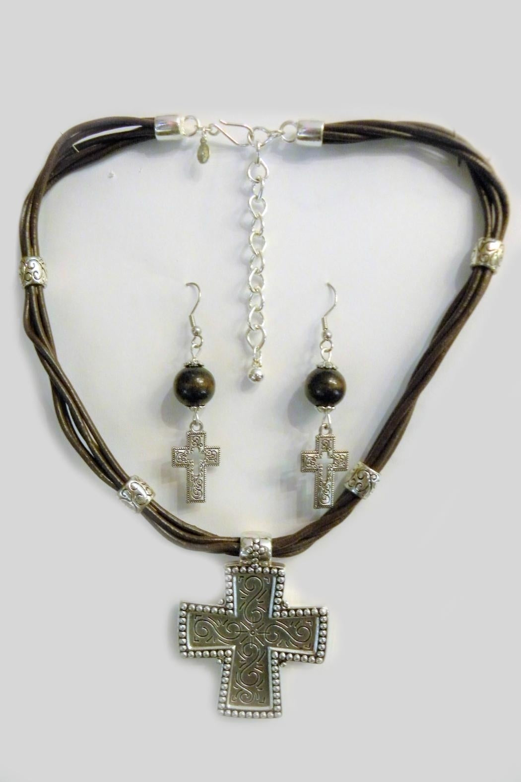 This is the Premier Designs Cheyenne Necklace. A silver plated cross pendant hangs at the end of a group of five brown leather cords. Cross is approximately 1.6" at it's widest point and 1.75" at it's longest. The leather cords are about 16" long plus a 3" extender. We made matching cross earrings to include, with fish hook ear wires and wooden beads that match the leather cord. Earrings are about 2.25" from the top of the hook to bottom. This is the perfect set to wear on those days you want to be reminded of your faith. Shipped in boutique gift box. Find more moderately priced jewelry on the "Mimi's Gift Gallery" boutique page.