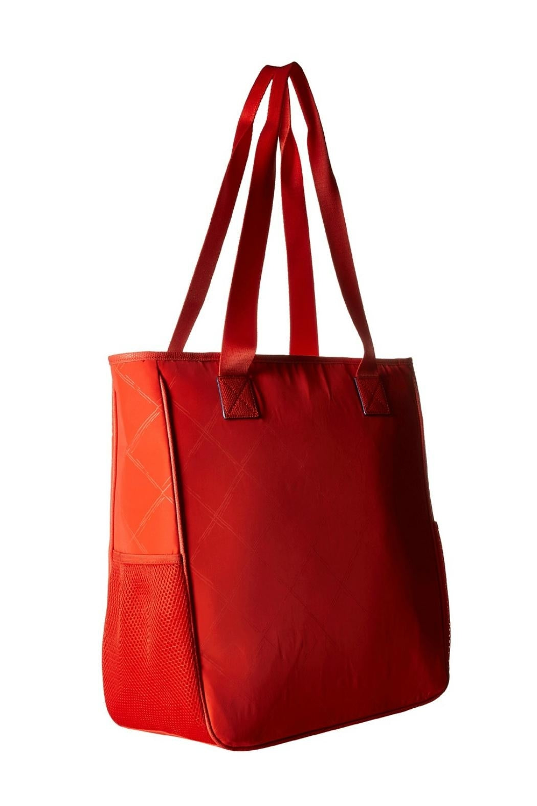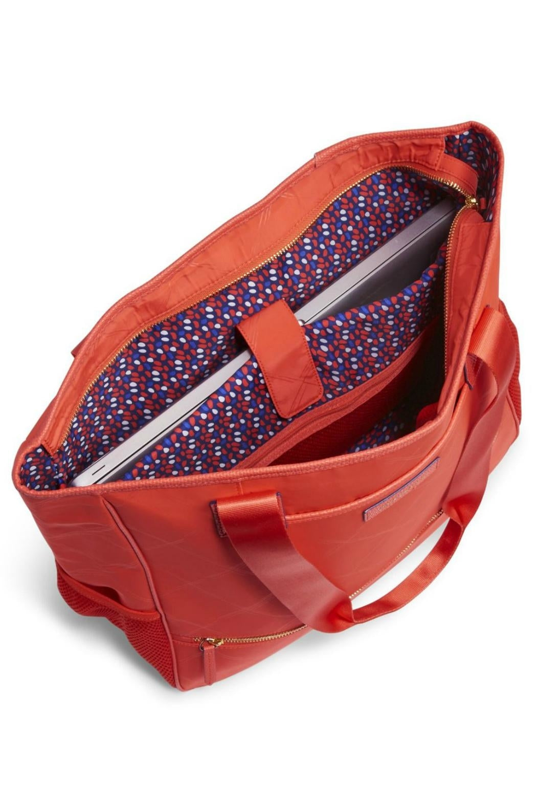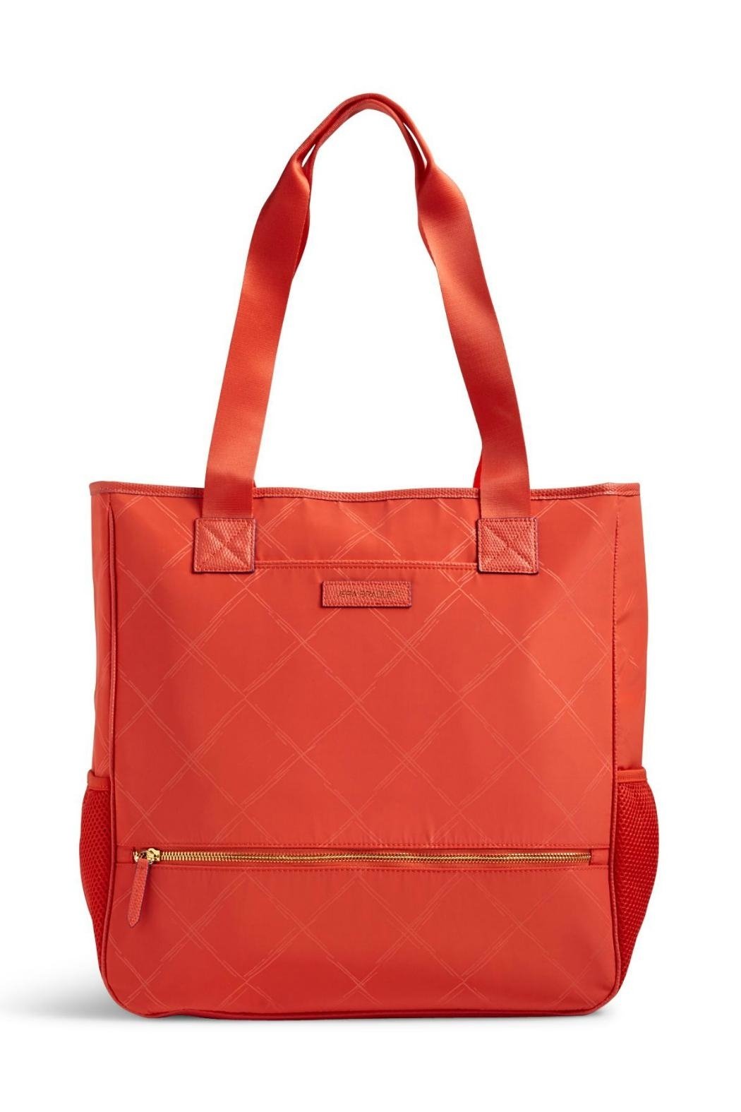 Let us introduce you to the Vera Bradley Preppy Poly NoSo Tote in the color orange! This heavy duty tote transitions flawlessly from work to gym without missing a beat. A large zip pocket near the bottom is perfect for shoes, and there's a padded compartment for your laptop. Preppy Poly fabrication is lightweight and water-repellent. Front zip compartment extends to back seam to carry larger items. Exterior features two side mesh slip pockets, a front slip pocket, and a large zip pocket. Inside features two mesh slips and a zip pocket in addition to a padded laptop compartment. Odor-resistant lining. Zip closure with gold tone hardware. Spot clean. Find many other Vera Bradley Preppy Poly accessories on the "Mimi's Gift Gallery" boutique page. Dimensions are 13 ½" wide x 15 ½" high x 6" deep with a 12" strap drop.