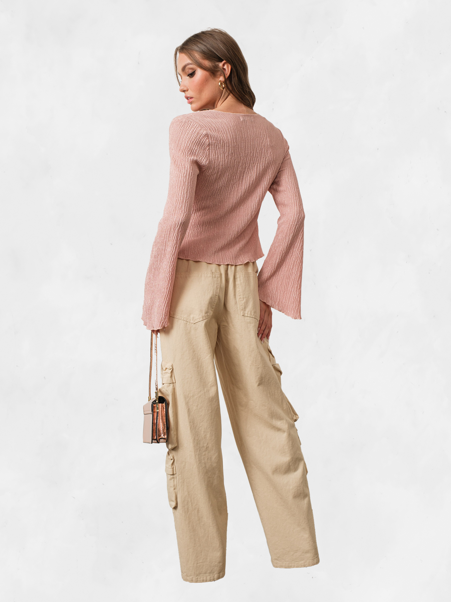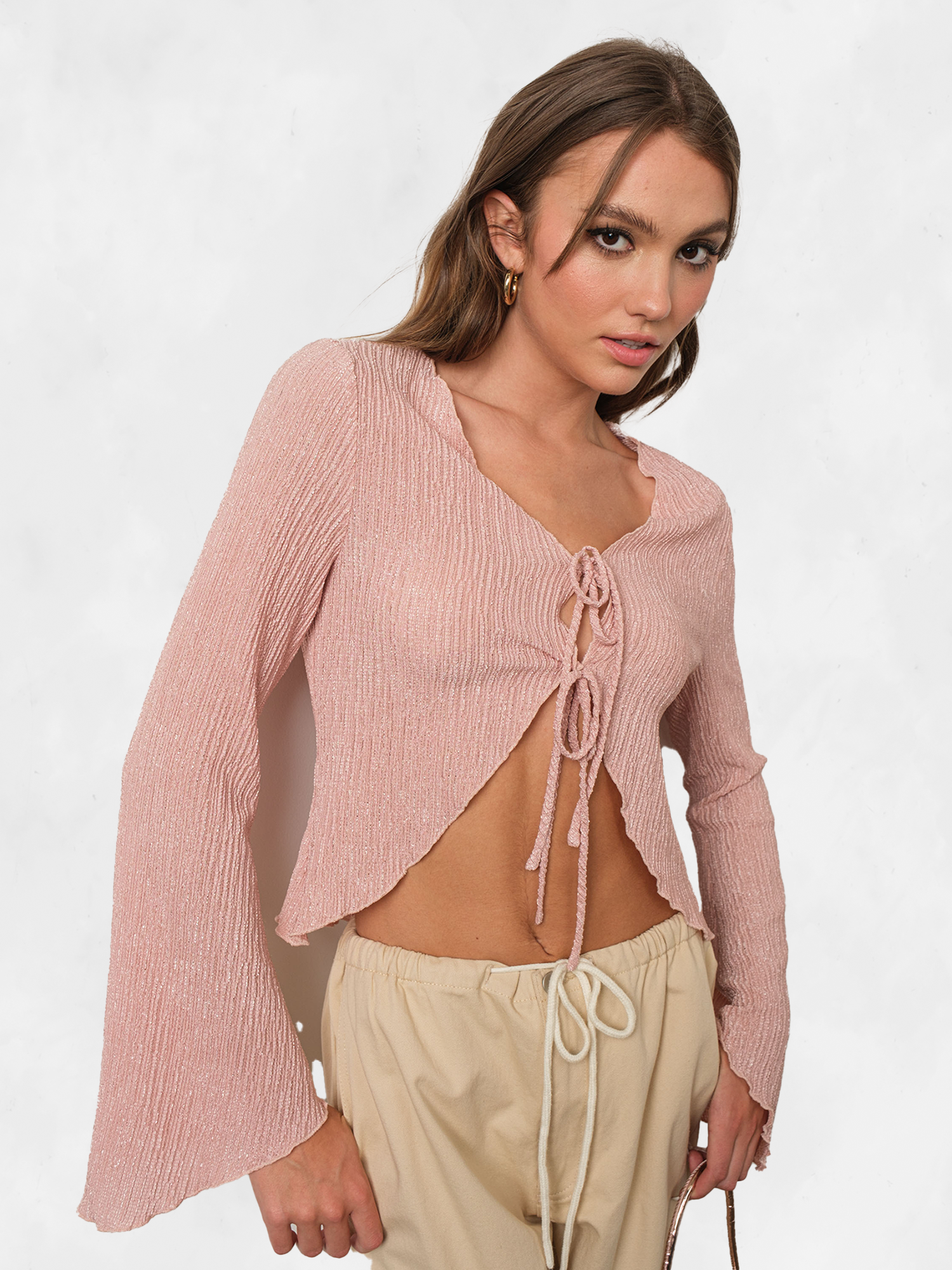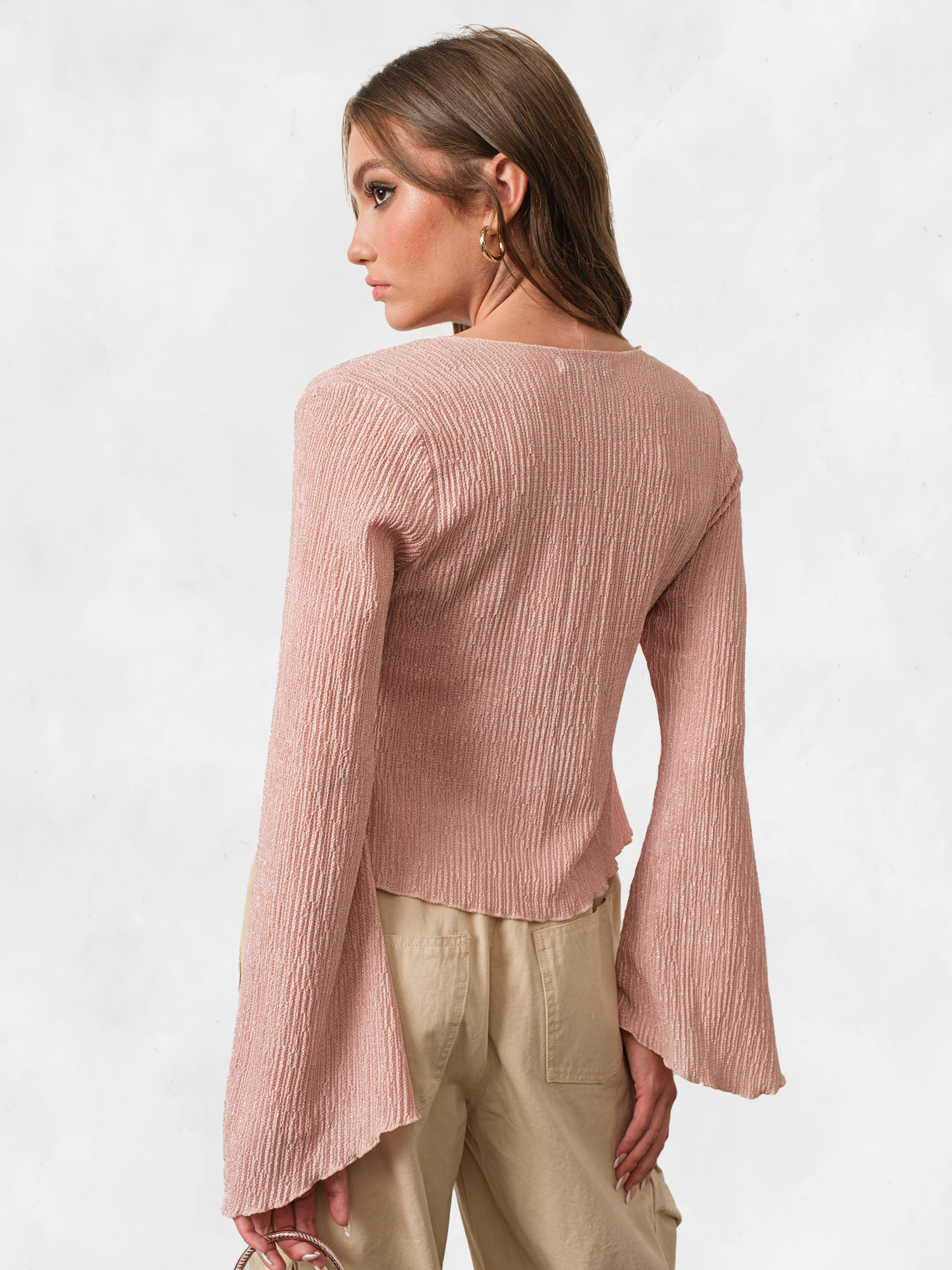 Description - Elevate your style with our Pretty Garbage Pink Textured Bell Sleeve Top. Its delicate bell sleeves add a touch of elegance, while the textured fabric exudes sophistication. Perfect for both casual outings and special occasions. Embrace effortless chic with this must-have piece.