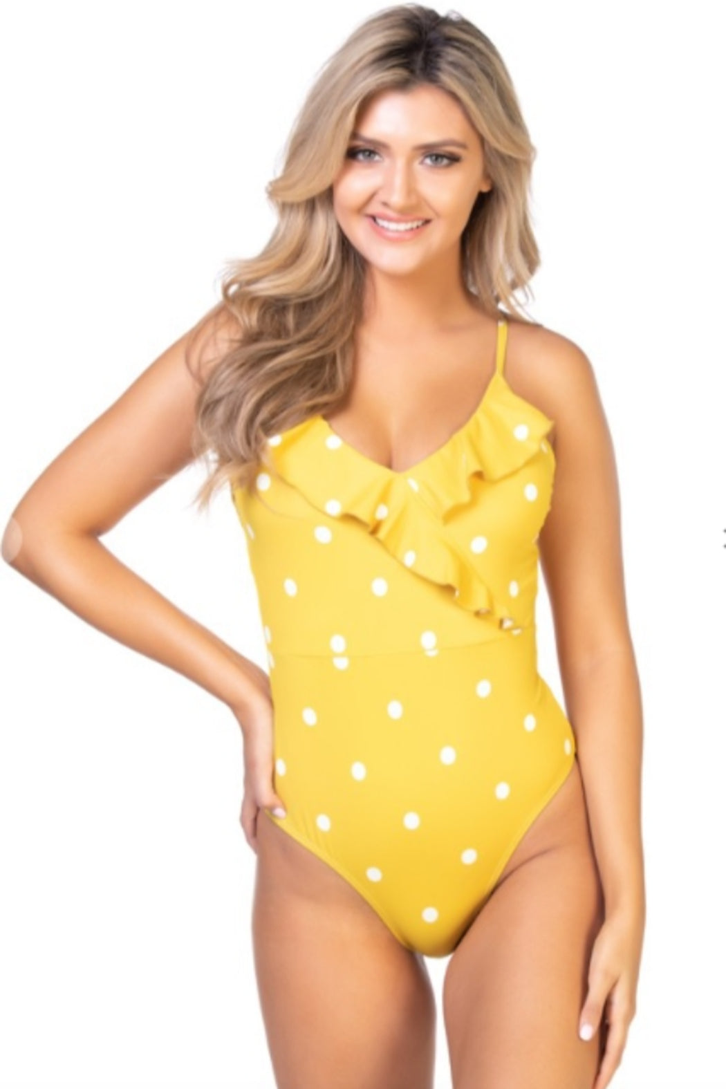 Pretty Yellow Polka Dot One-Piece. Ruffled neckline detail. Features adjustable spaghetti straps; 2" back tie with keyhole back. Removable cups. Full coverage bottom. Imported.