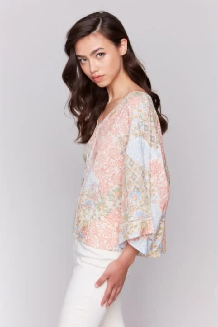 Printed 3/4 Wide Sleeve Blouse w/ Ladder Stitch Detail