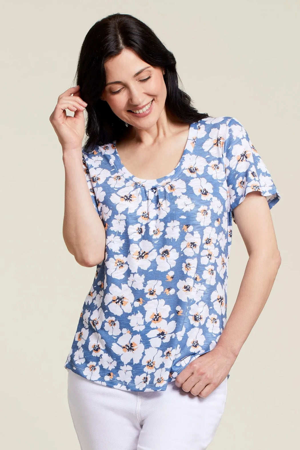 We know you'll love this flirty blouse as much as we do. Flutter sleeves and a U-shaped neckline add to neck shirring and a curved hem. The soft printed knit keeps thing slight and flowy.