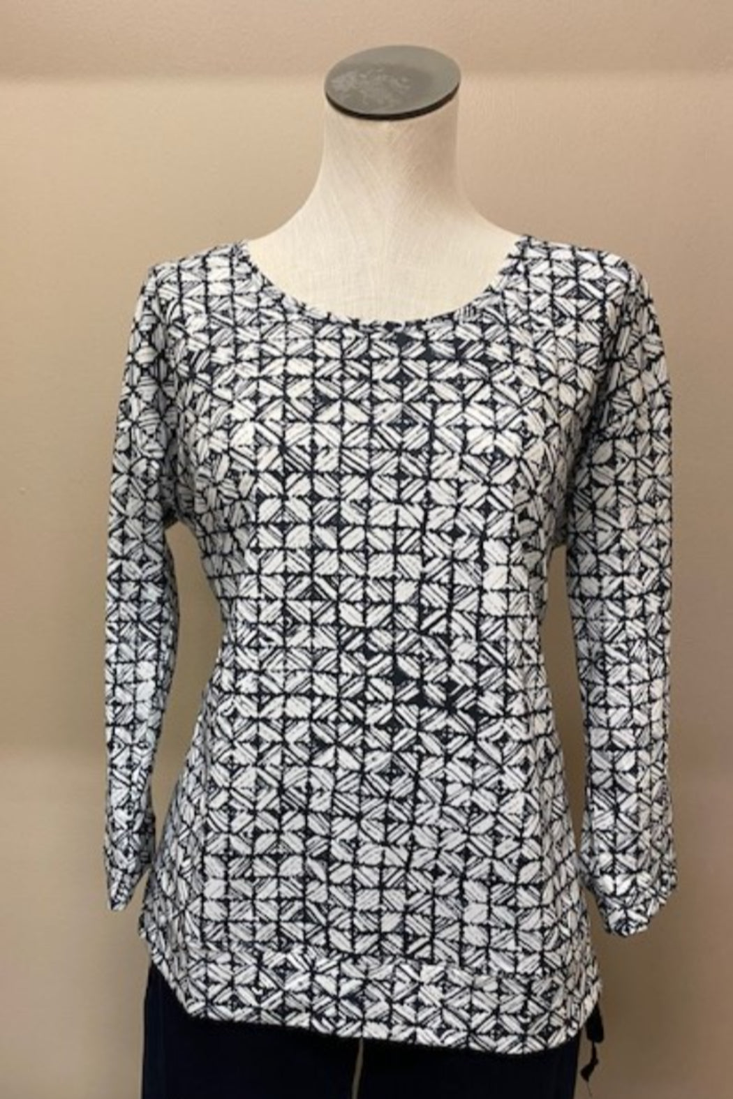 Stretch fabric and flattering side tie make this a fun option to spice up your warm weather wardrobe. Rounded neck and mid length cut.