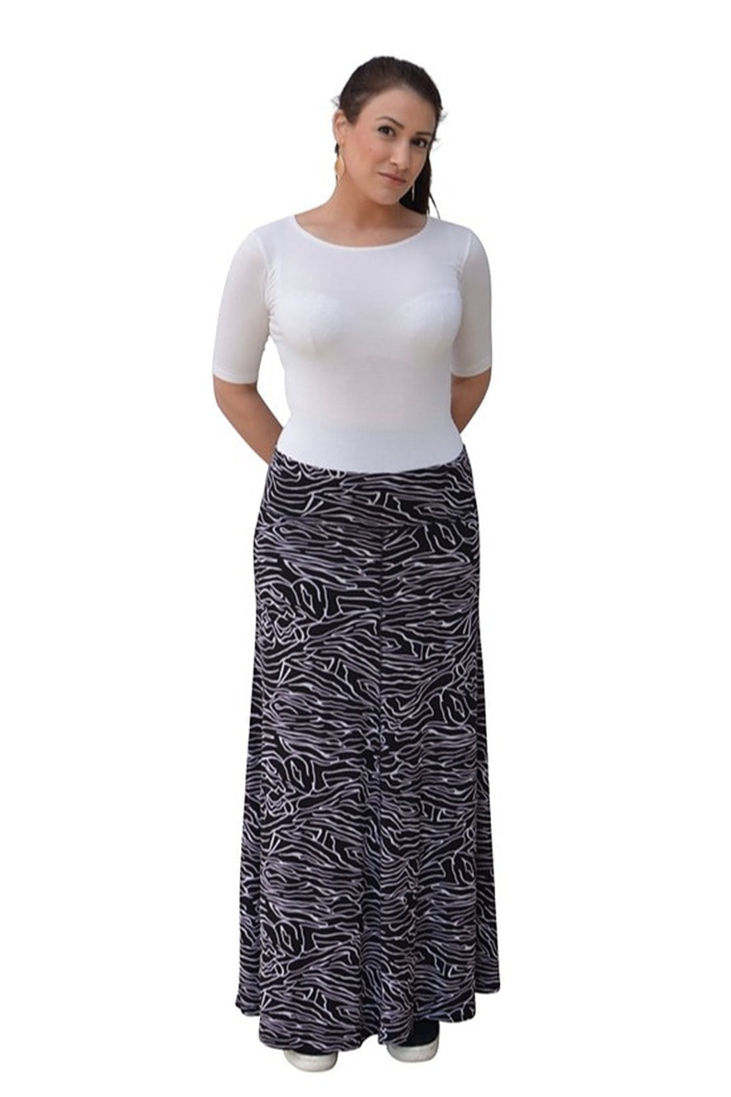 Printed Maxi A-line skirt. Four panel skirt. Comfortable 4" waistband. Lightweight flowing fabric. Flat stitch trim on all seams. Machine washable.