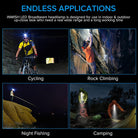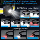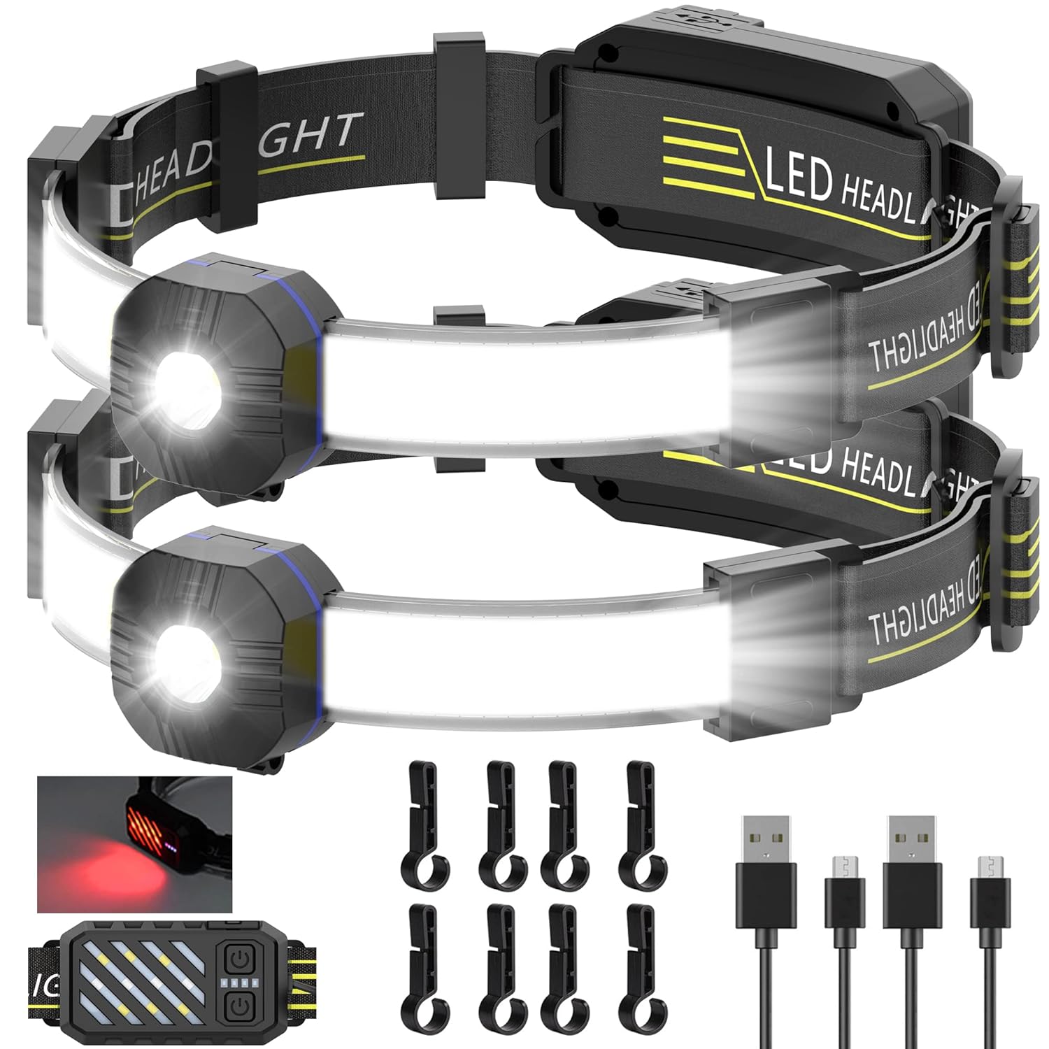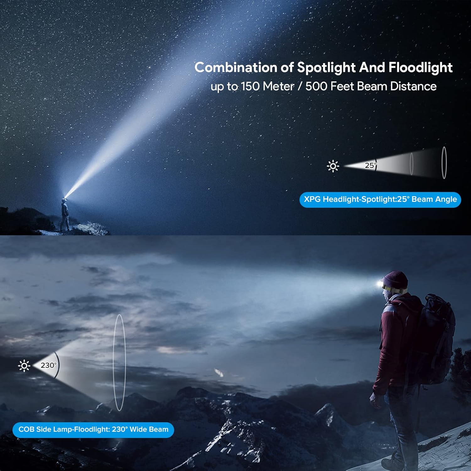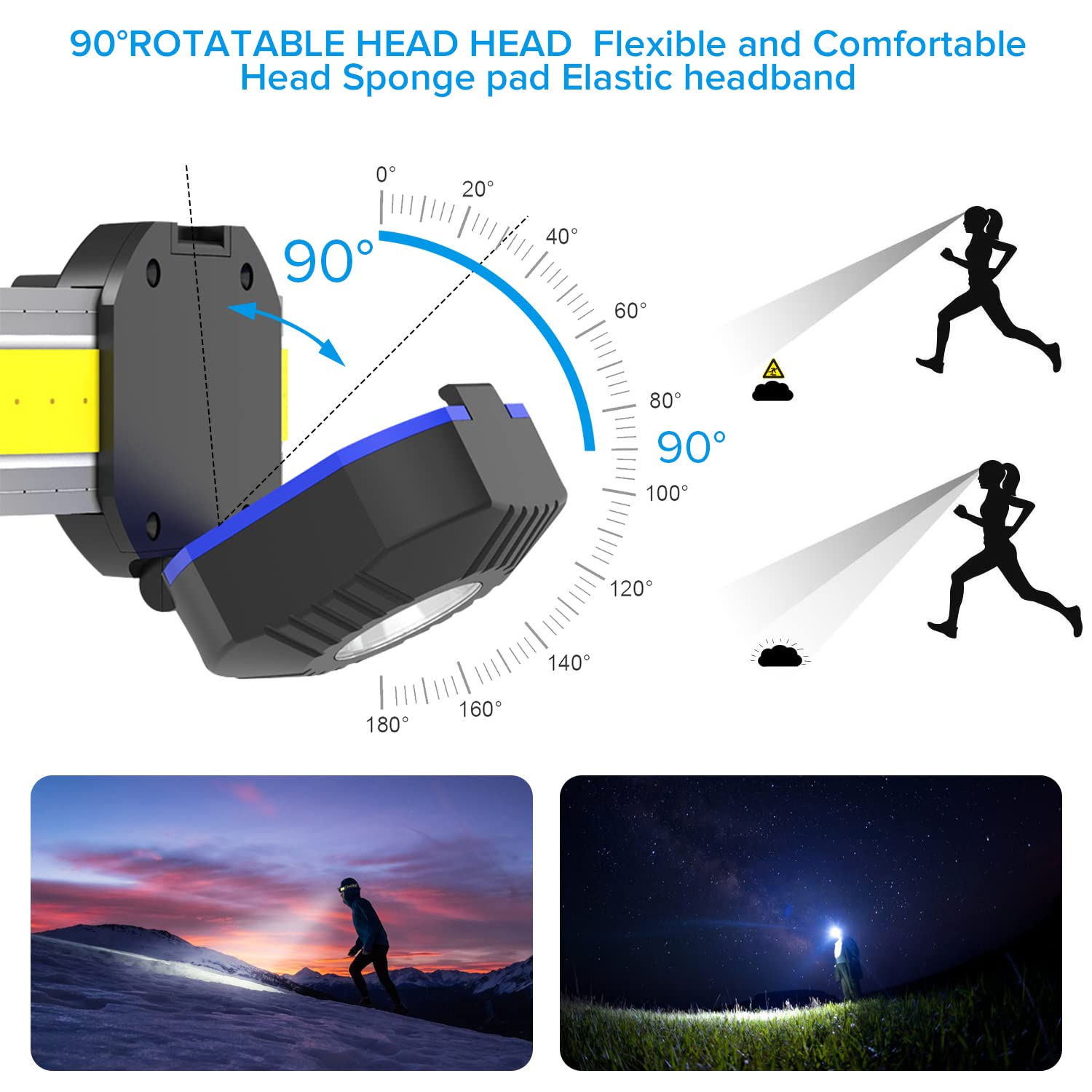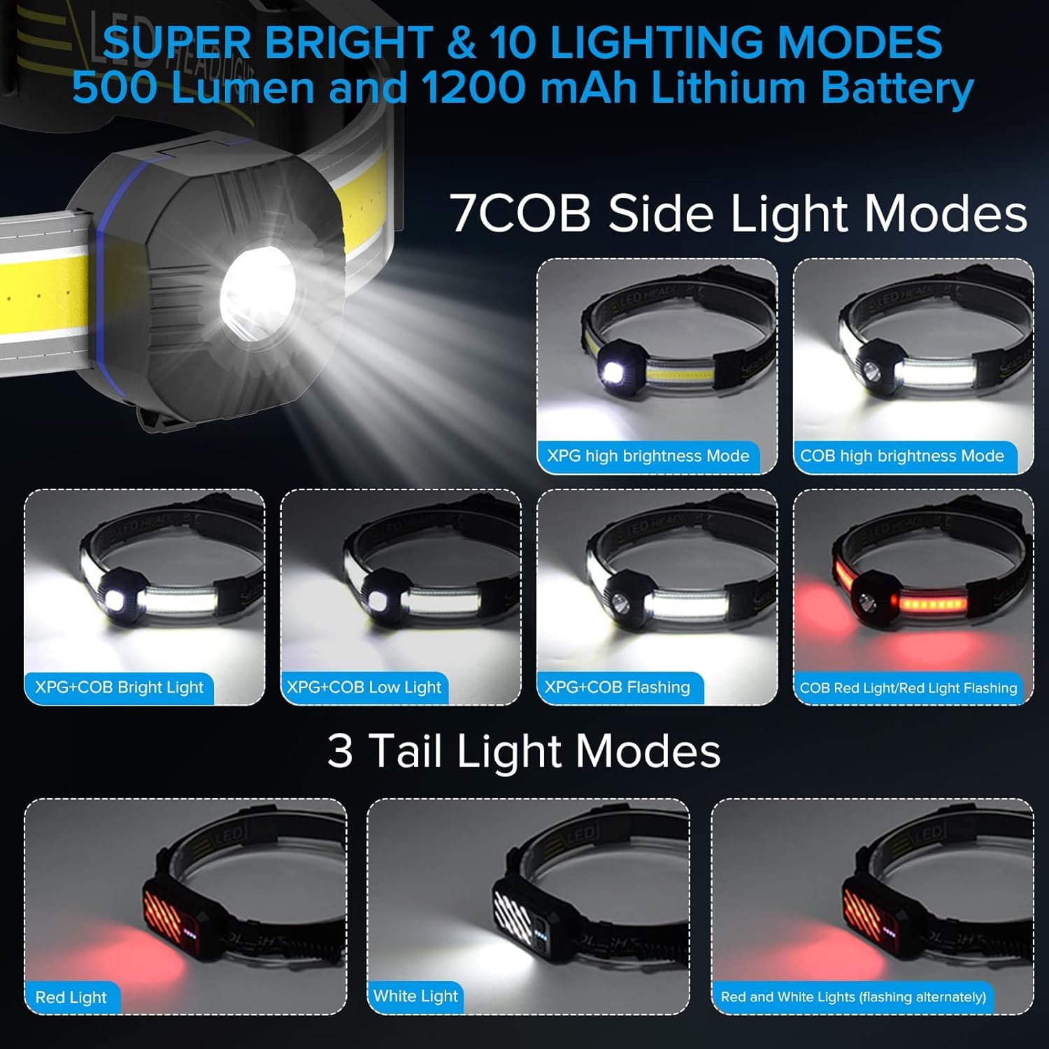 - 10 Lighting Modes Headlamp: Upgraded COB light strip +LED light, 7 headlight modes and 3 taillight modes. The headlight mode and taillight mode can be turned on at the same time, and double switches can control two lights respectively, so it is easy to switch modes. The 7 headlight modes can completely liberate your hands, and the taillights can make your trip safer. outdoors headlamps are very suitable for outdoor activities such as work, camping, running, and hiking.