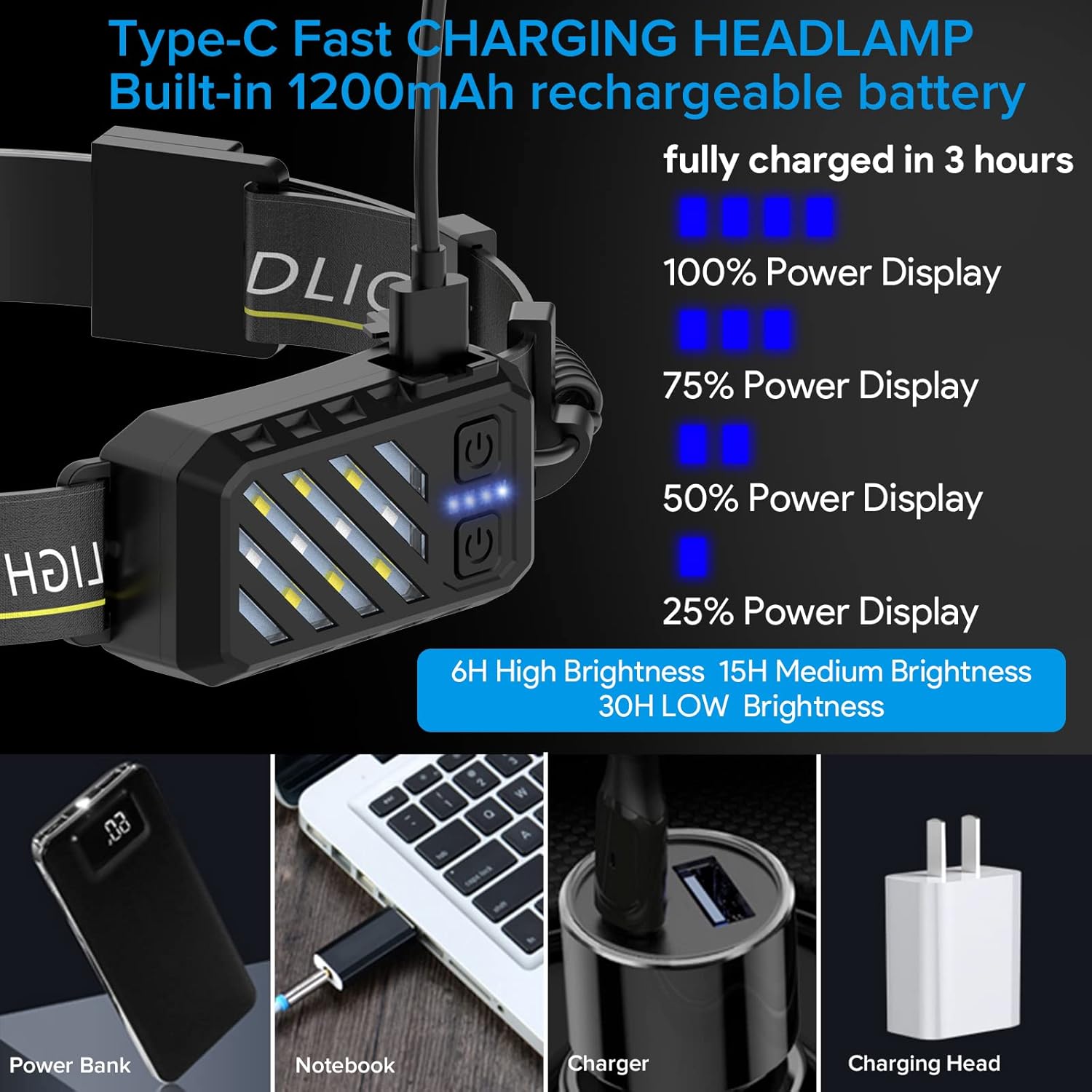 - Headlamp Rechargeable: Headlamp rechargeable has a built-in 1200mAh lithium battery and can be charged by included micro USB-cable, such as computer, mobile power, car charger, etc. We pay attention to environmental protection, and you don't need to replace batteries. After fast charging, the rechargeable headlamp can meet your all daylighting needs, Its indicator light shows the battery charge, which can remind you to charge and ensure that you can charge the headlights in time.
