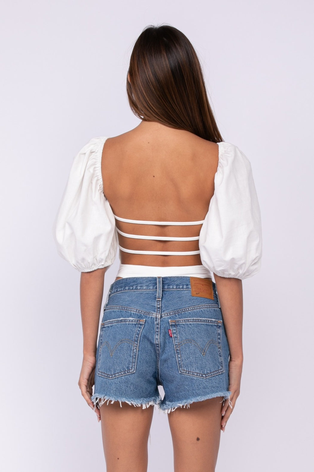 Open back puff sleeve bodysuit -Solid -Bell-Sleeve -U-NECK -Body Suit -true to size 95%RAYON,5%SPANDEX/100%POLY Model Info: Height: 5_8'' Bust: 34B Waist 24 Hips 34