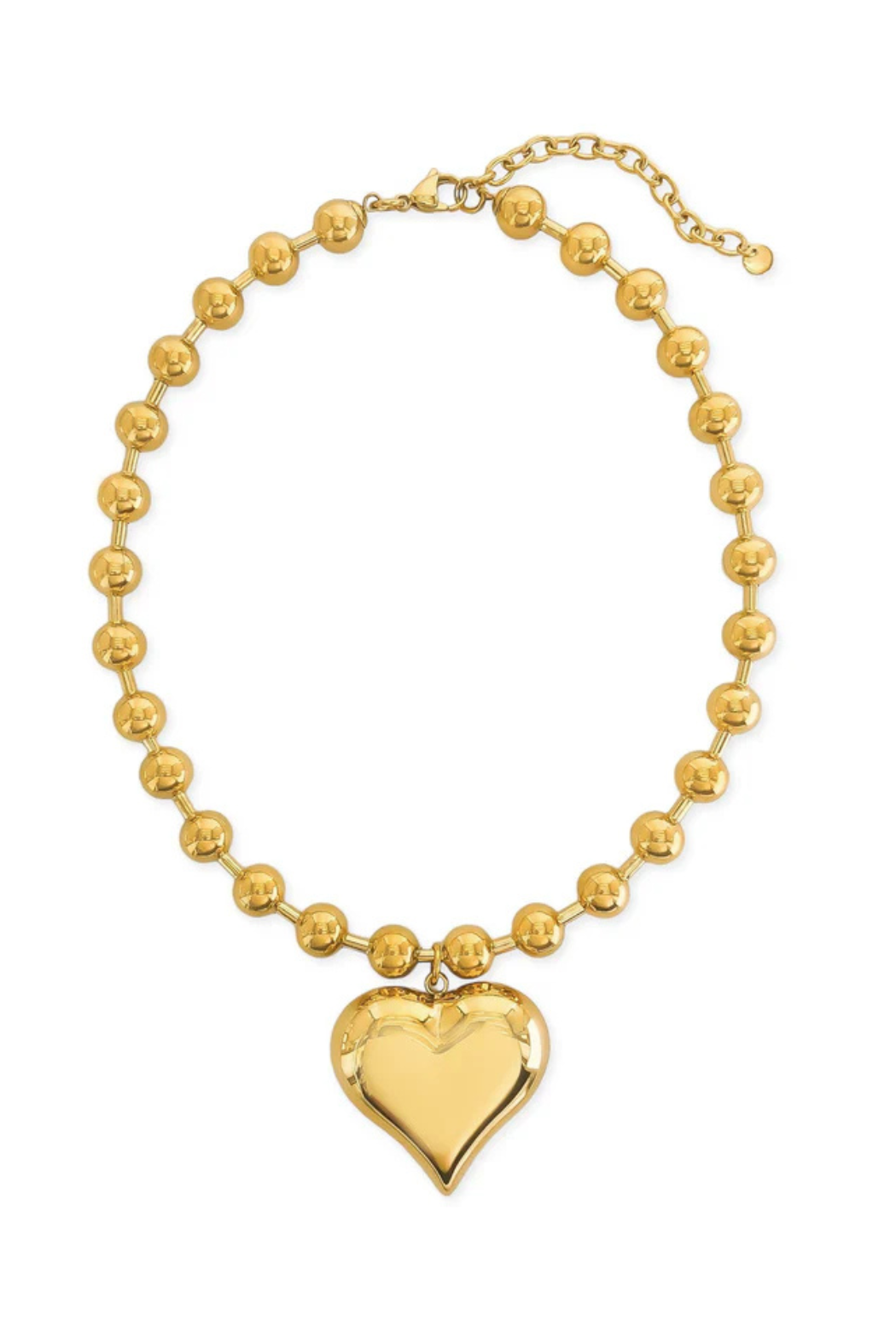 This bold Water Resistant necklace features large 10mm beads and a striking puffy heart pendant, making it a statement piece that adds a touch of whimsy and elegance to any outfit.