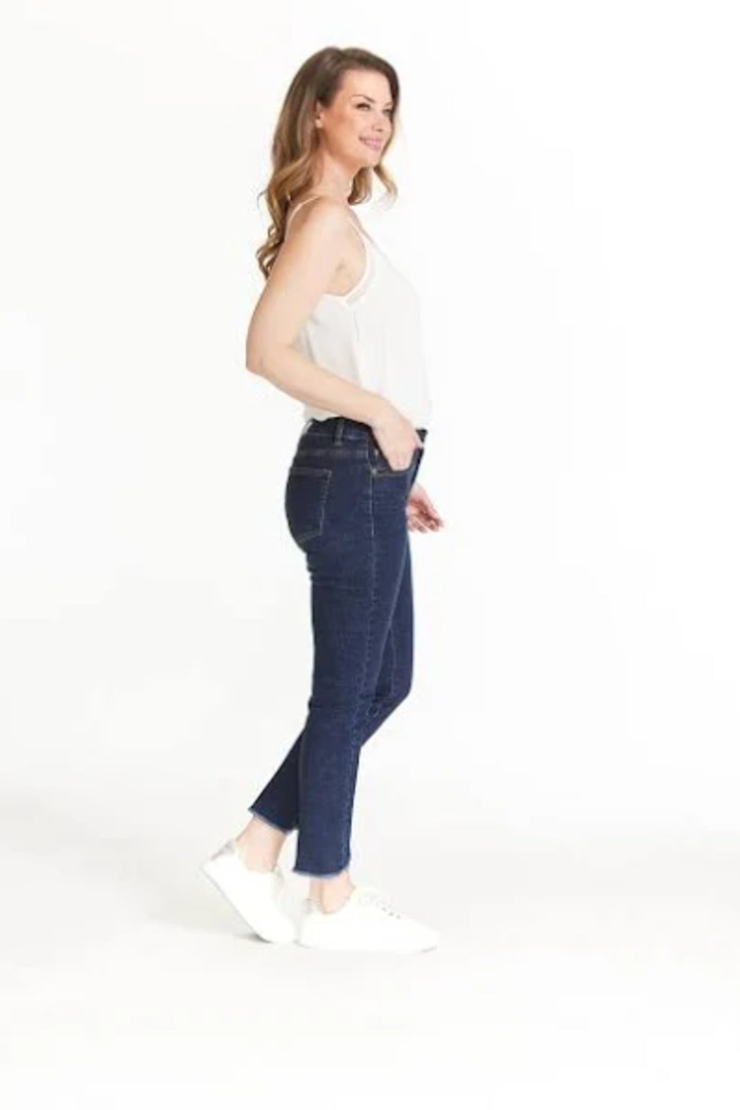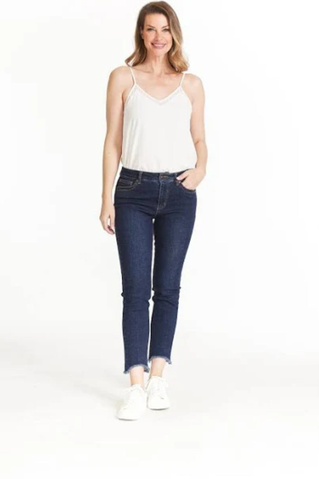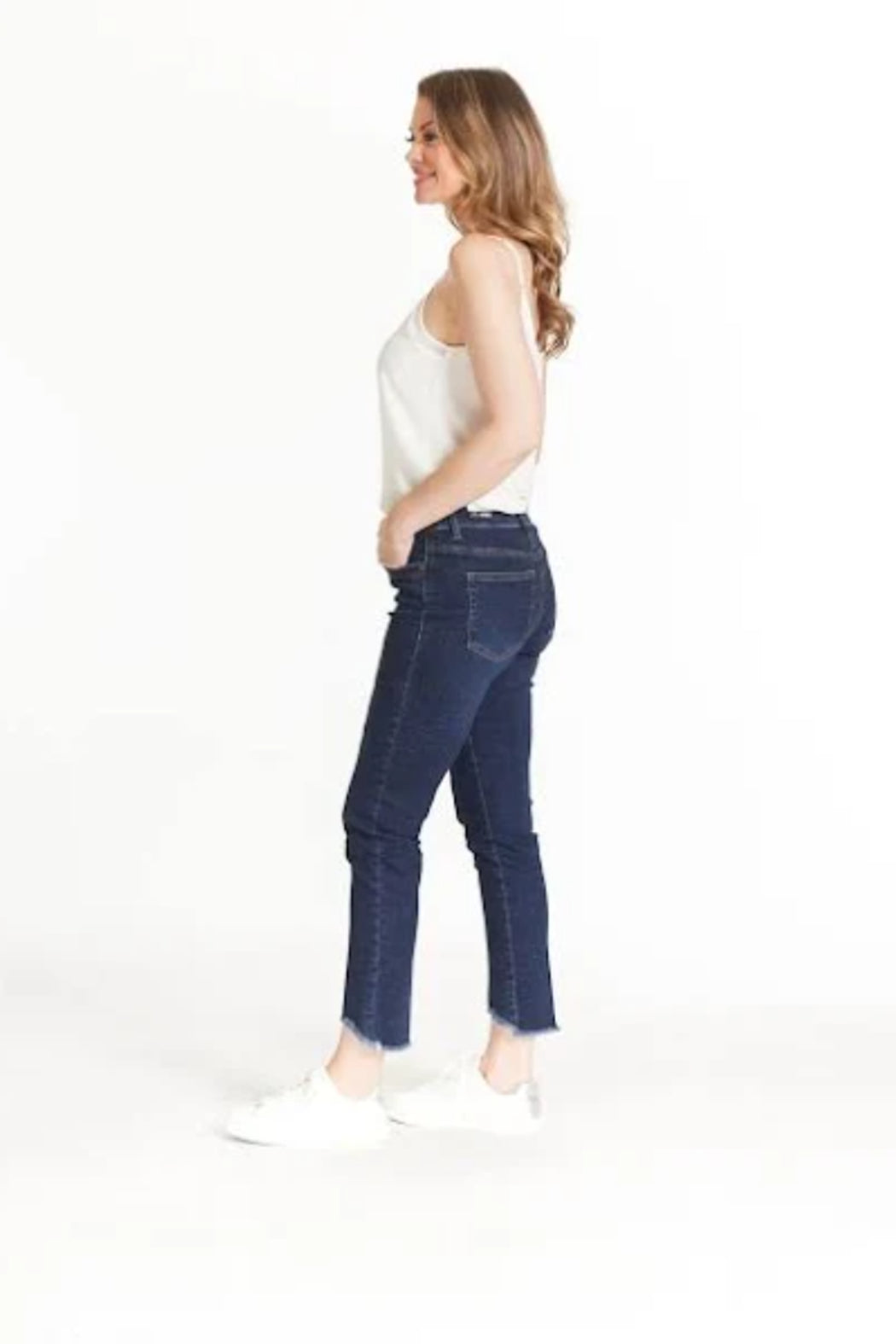 PULL ON 5 PKT HI-LO FRINGE HEM ANKLE JEAN