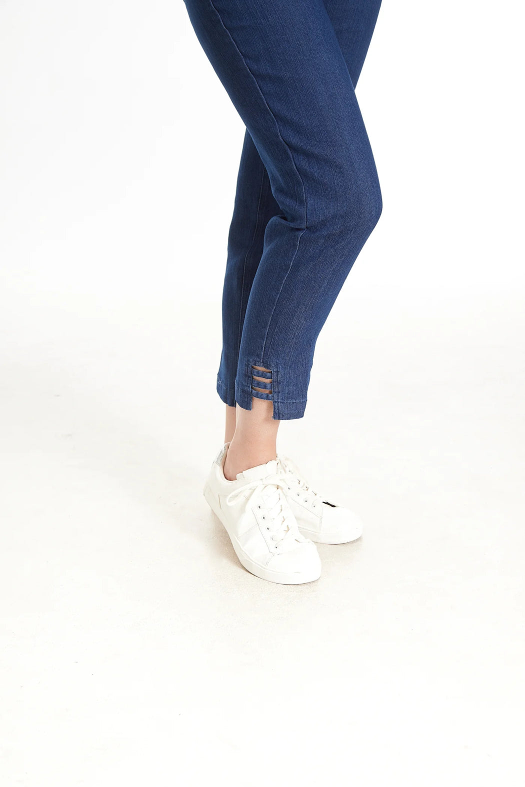 This pull on ankle pant features a unique and stylish ladder strap hem vents.