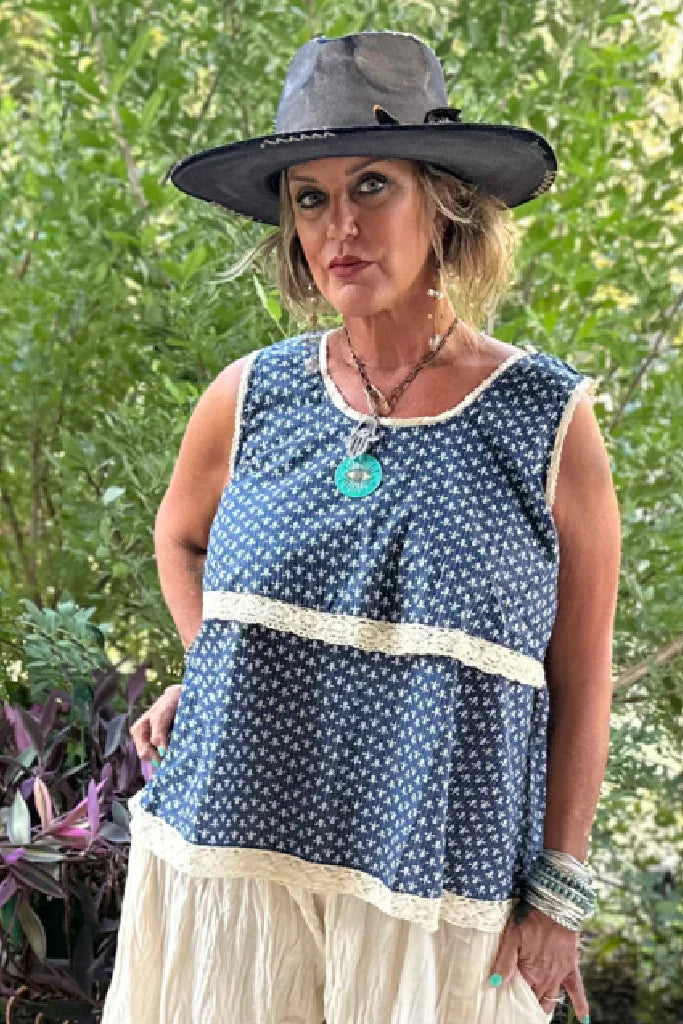 Get ready to circle back around to this must-have tank! Made with 100% premium cotton, this navy blue tank features a playful ditzy print and delicate ecru lace trim. Its unstructured, flowy fit makes it perfect for any occasion. Trust us, you'll love this Jaded Gypsy creation (and so will your wardrobe)! Don't miss out!