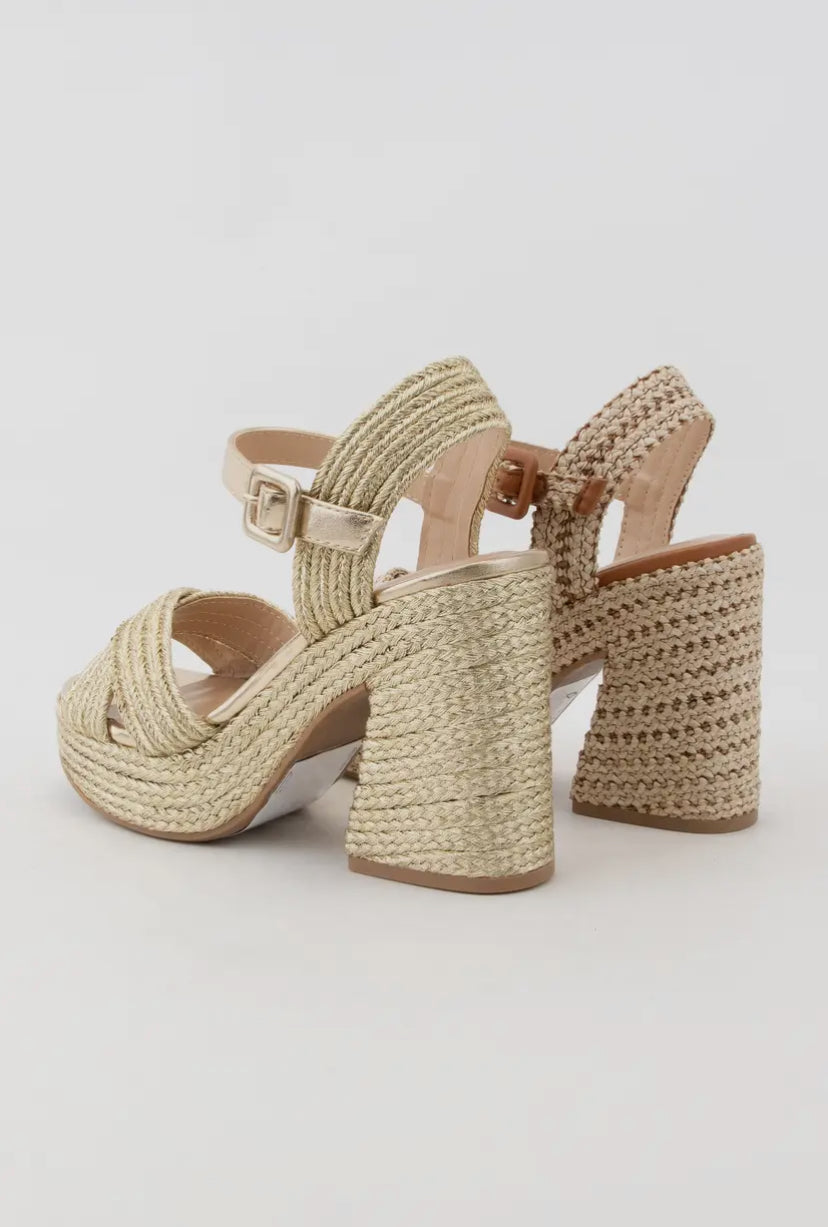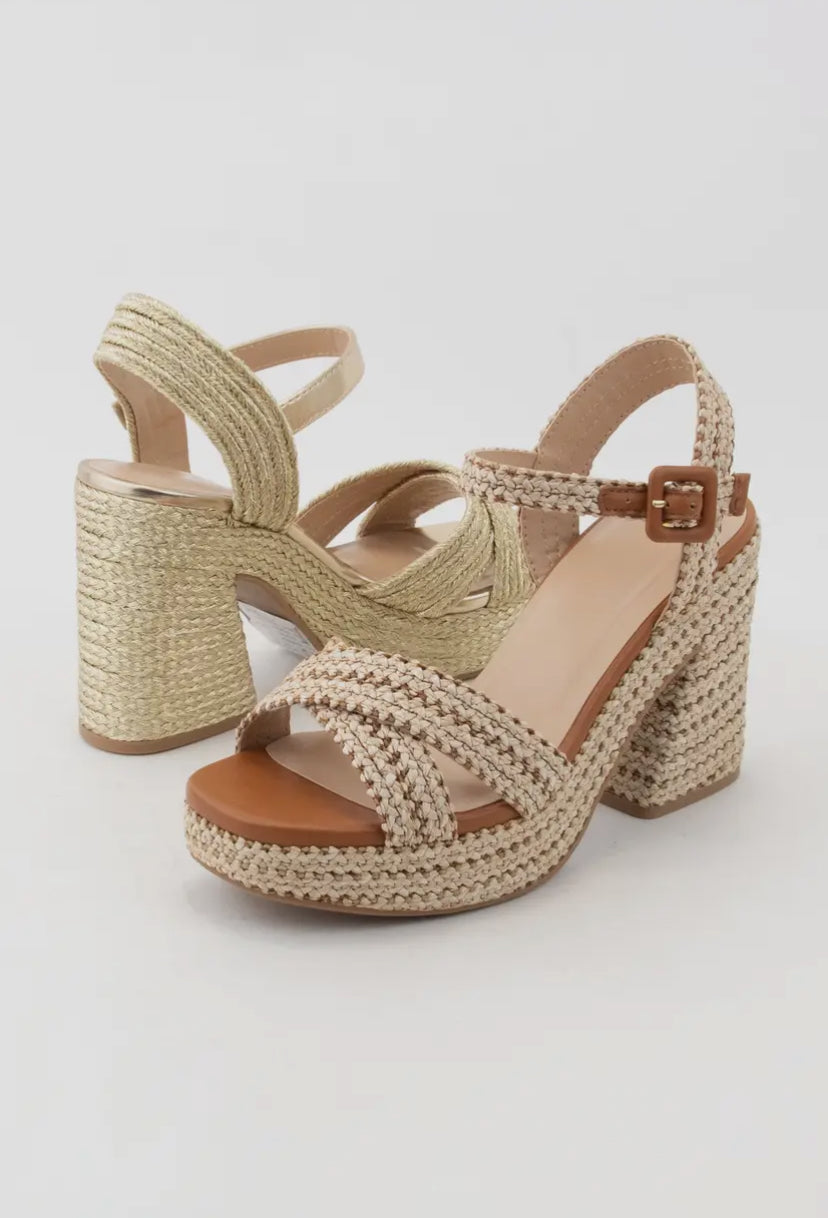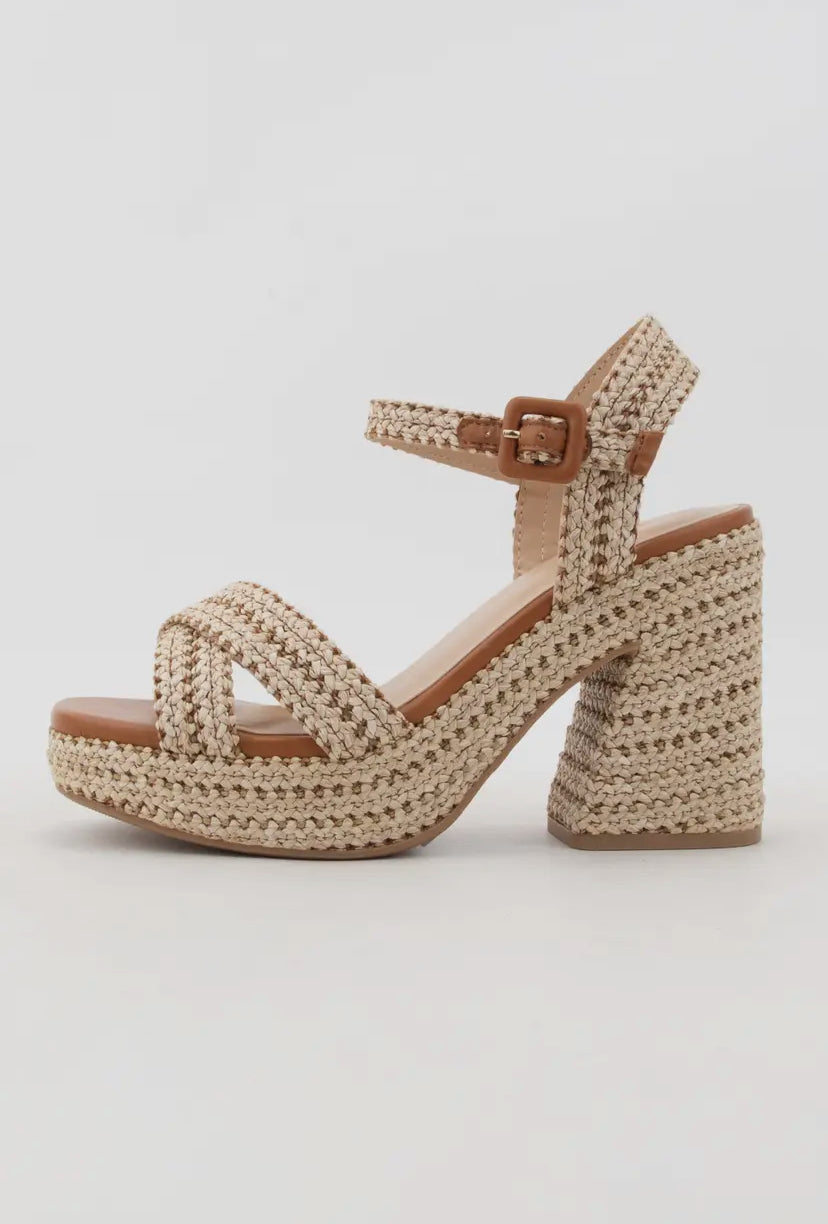 - Raffia Woven Cross Strap Chunky Platform Heeled Sandal