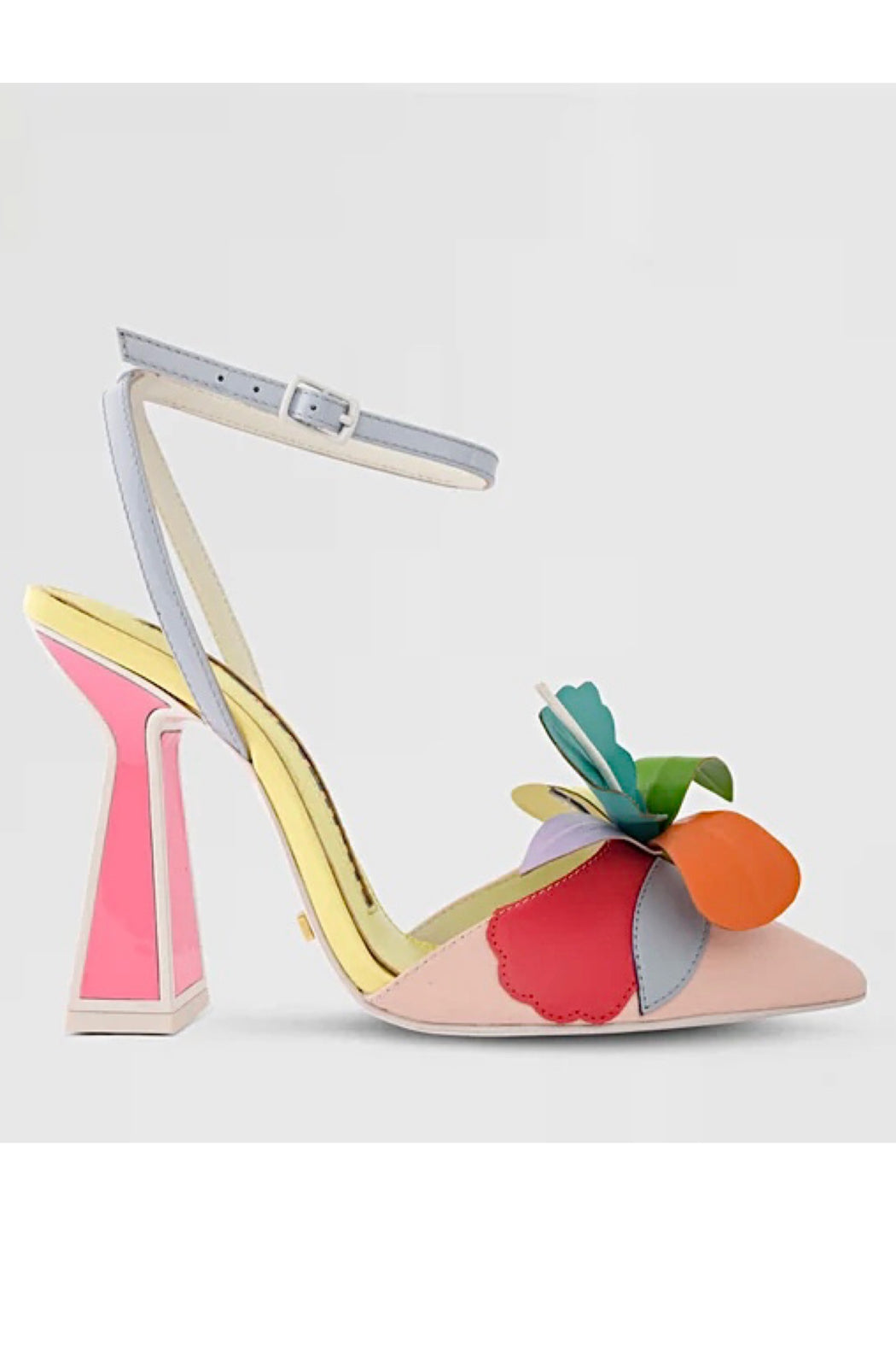 Designed for holiday season antics, this Rafi heel has 3D petals at the toe crafted from multibrights leather. With a pointed toe and high heel, this style is already throwing your parties for you.