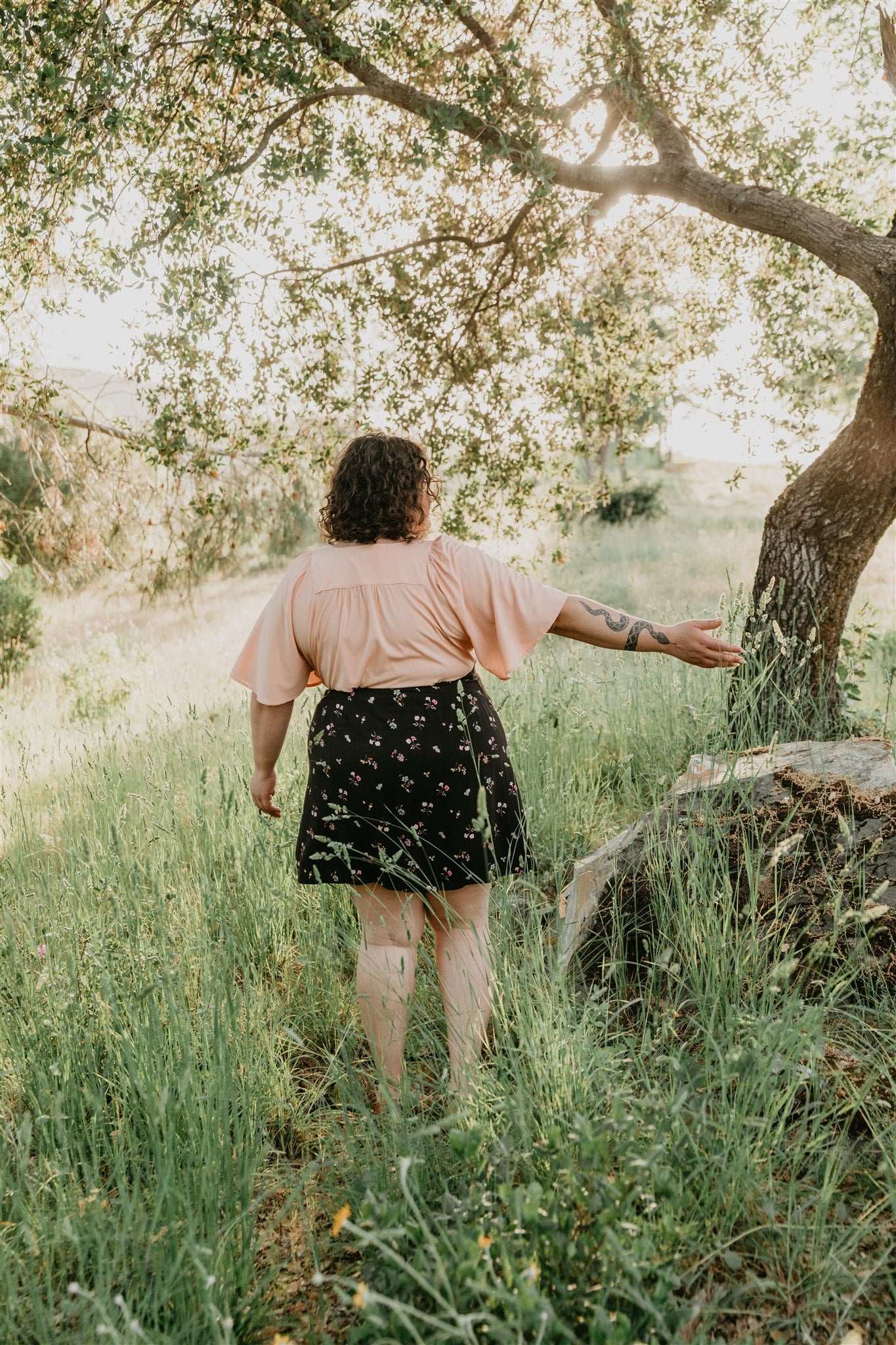This classic and easy to wear skirt that goes with any crop top or french tuck with a longer top. Short skirt that is smocked in the back with elastic thread for maximum comfort. Fits snug without binding or pinching the waist. Interfaced waistband with 8 functional vintage brass buttons for closure. Chevron shaped patch pockets that fit even the largest phones.