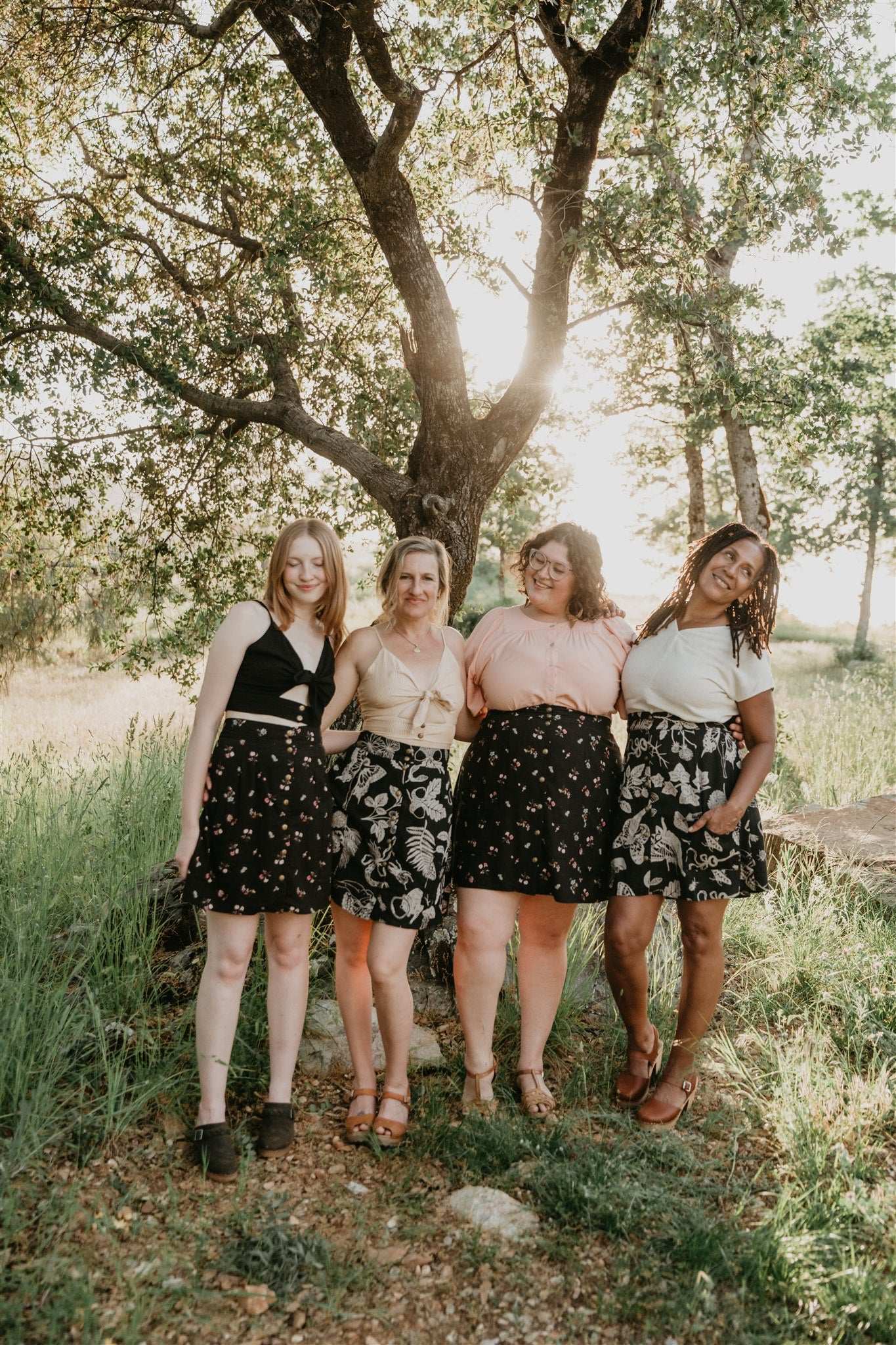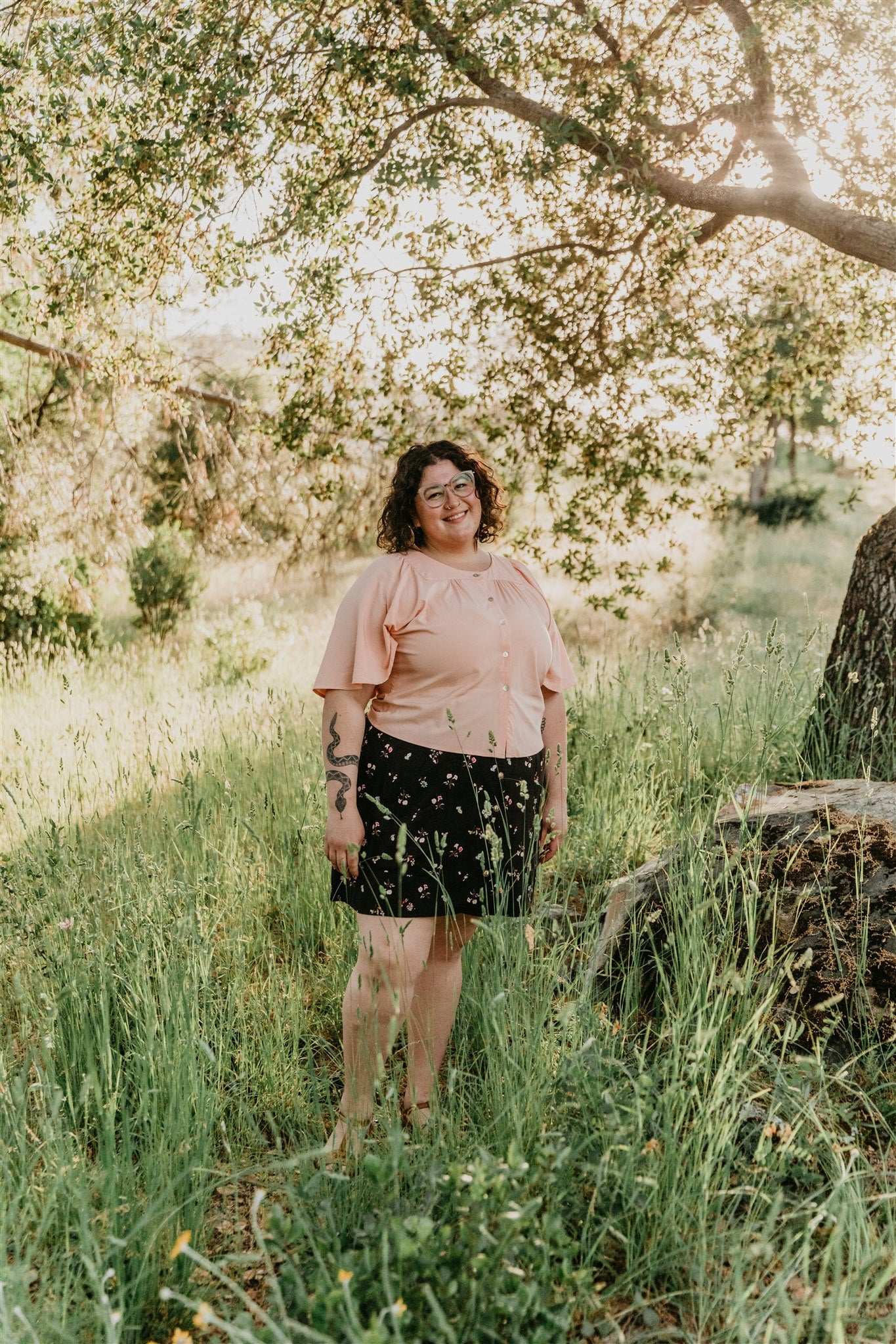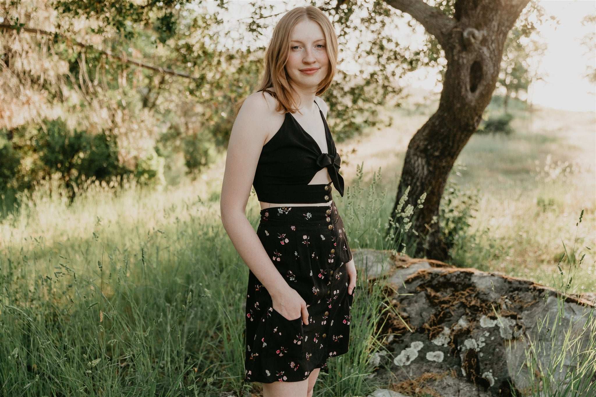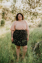 This classic and easy to wear skirt that goes with any crop top or french tuck with a longer top.  Short skirt that is smocked in the back with elastic thread for maximum comfort.  Fits snug without binding or pinching the waist.  Interfaced waistband with 8 functional vintage brass buttons for closure.  Chevron shaped patch pockets that fit even the largest phones.