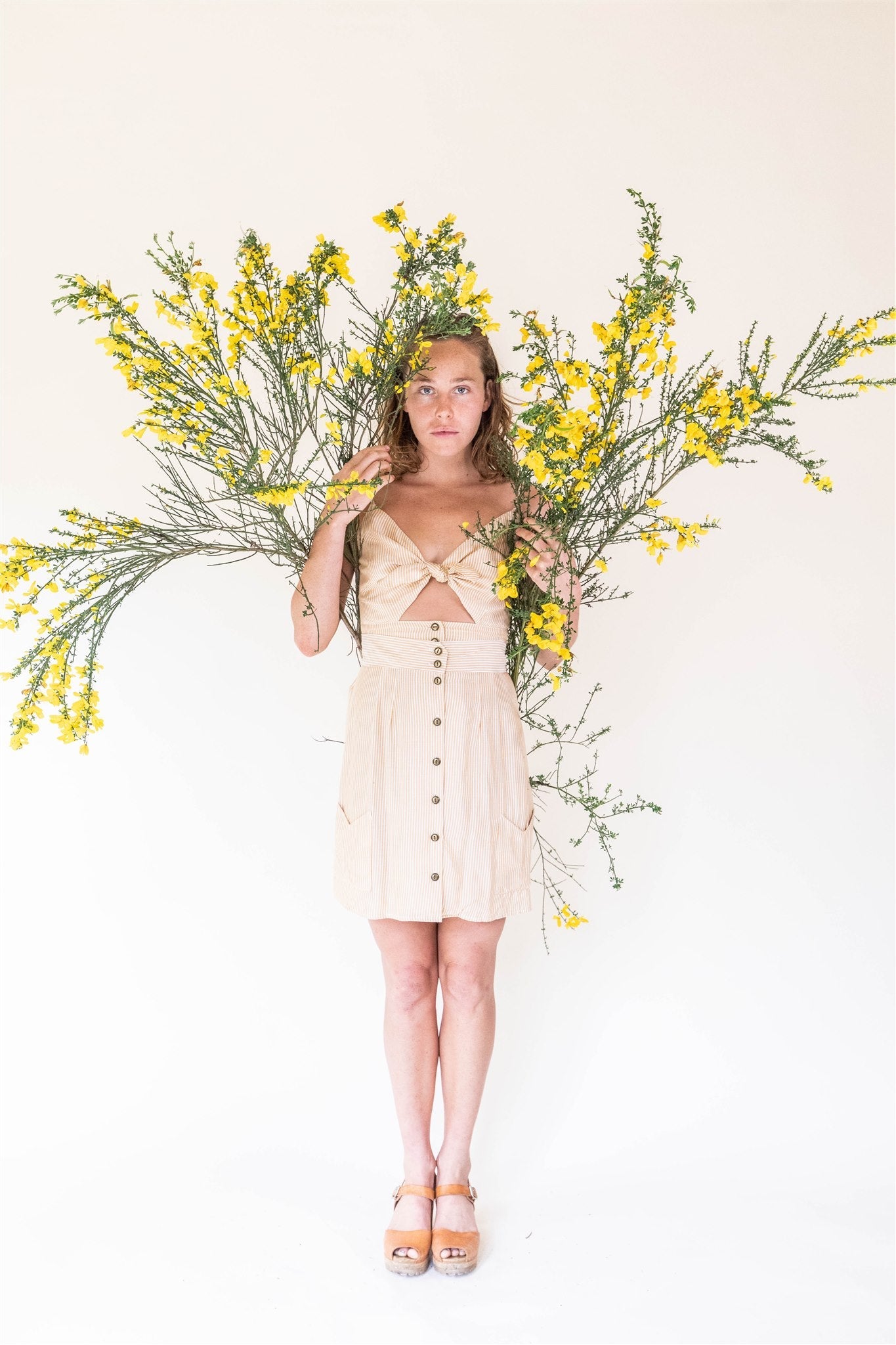 Made from a deadstock light weight cotton sheeting in a cream and white stripe.