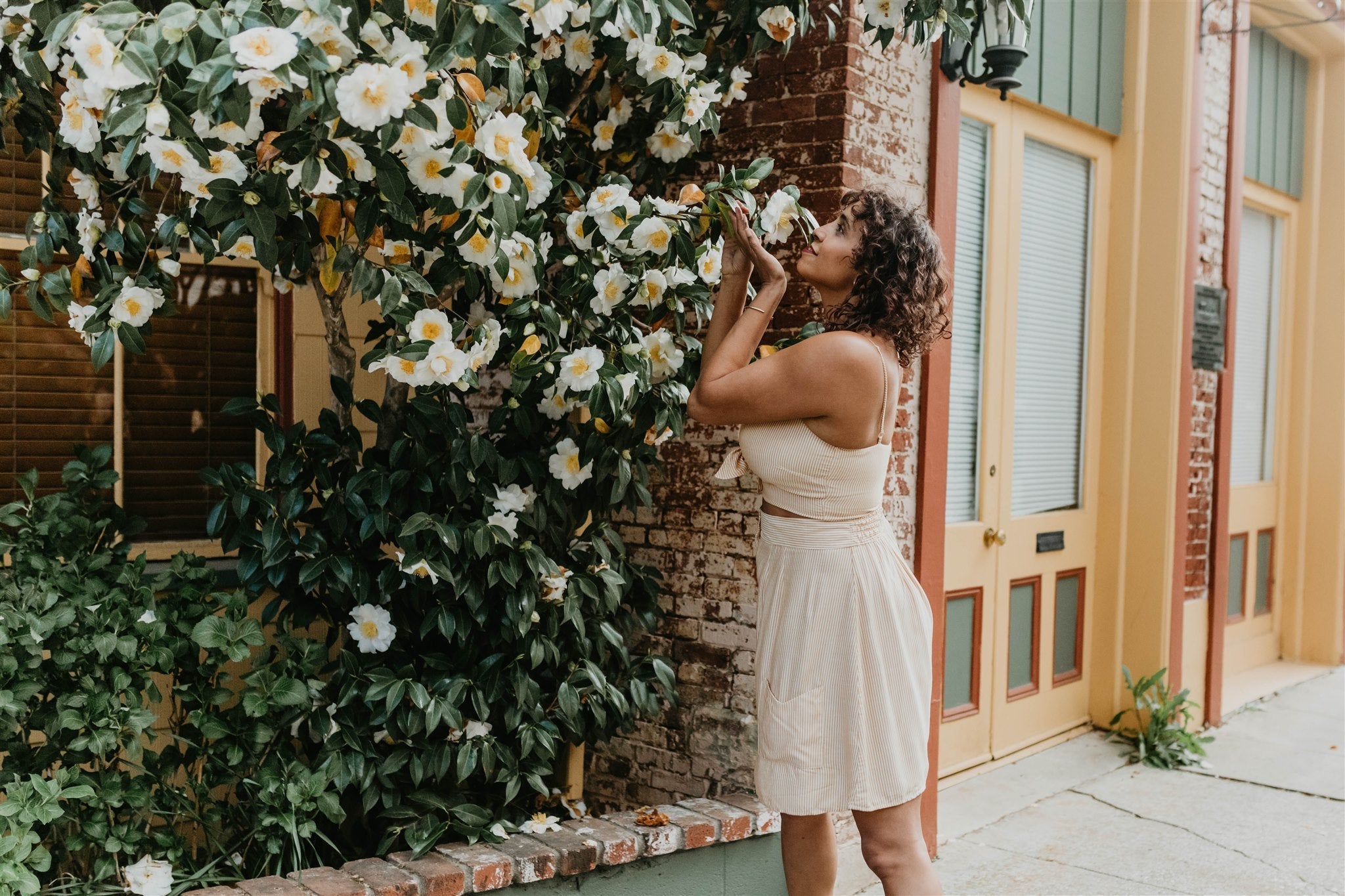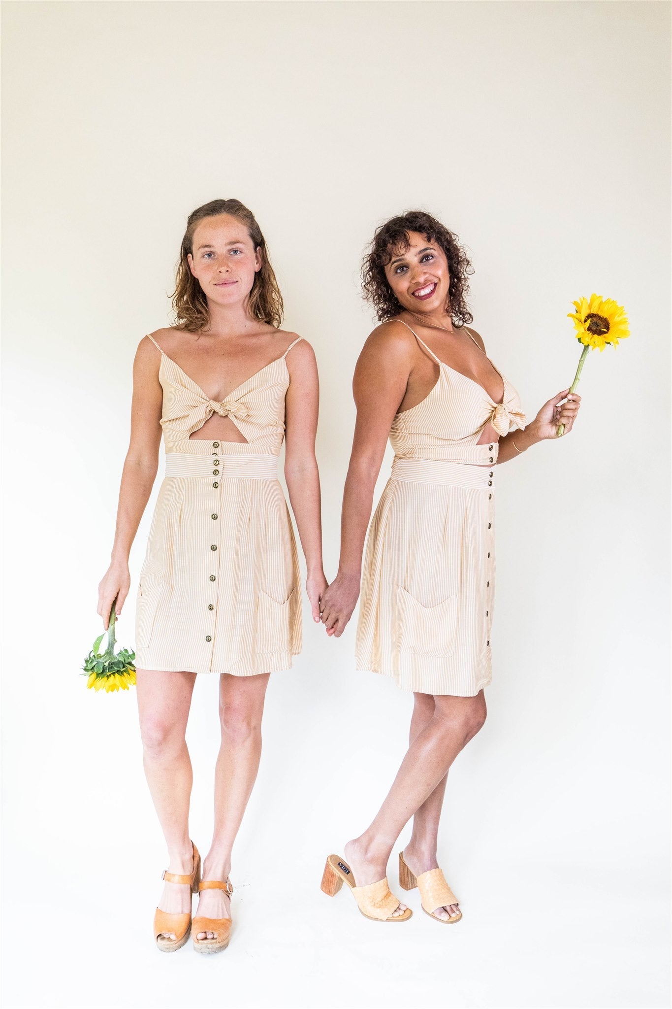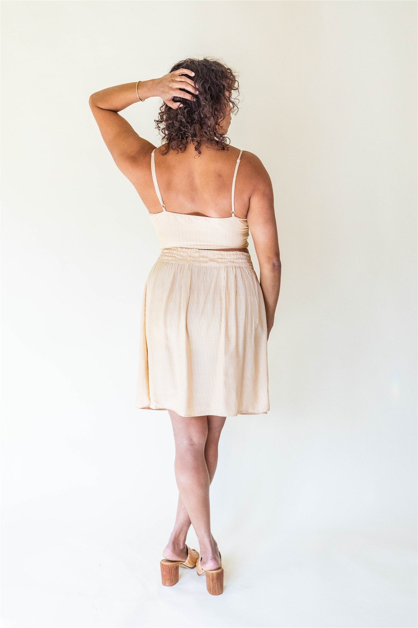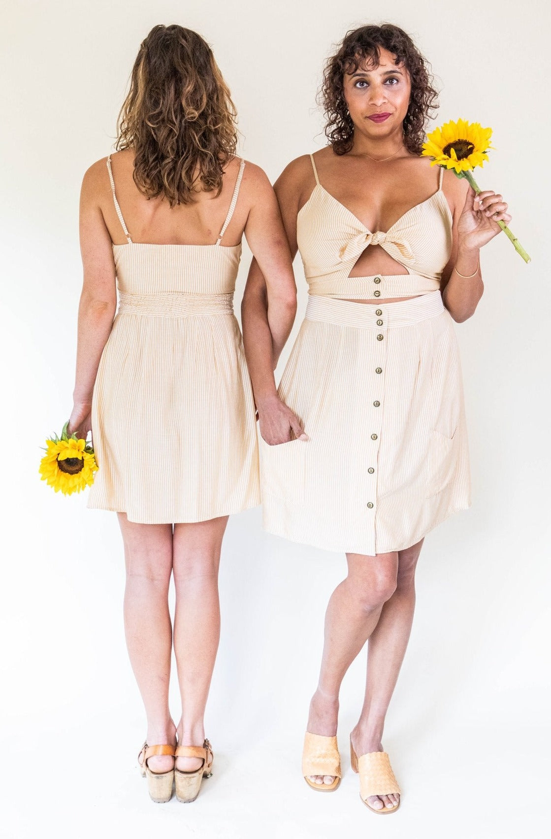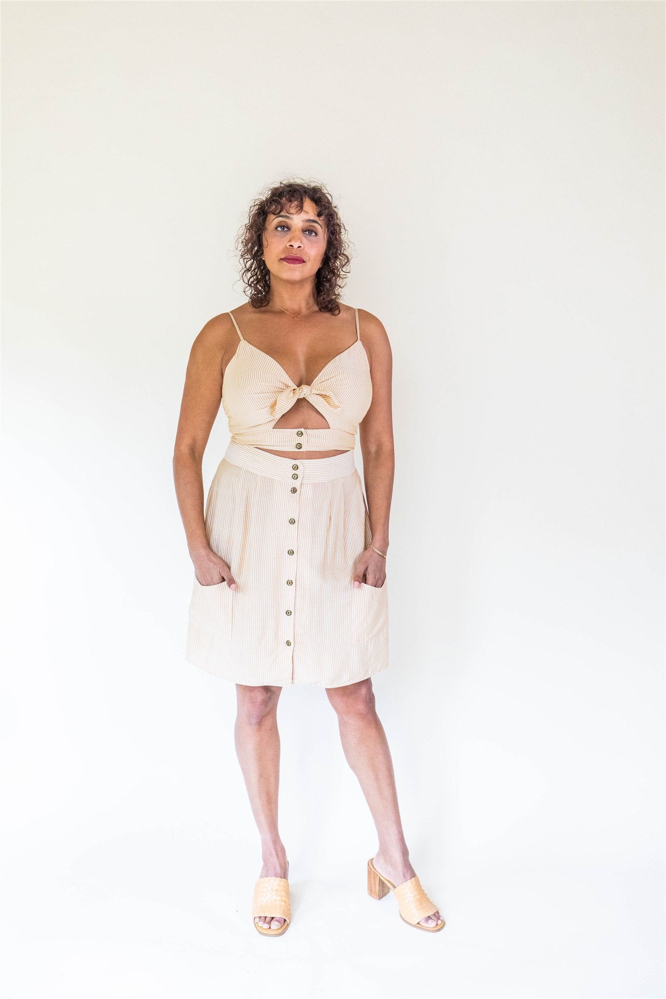 This classic and easy to wear skirt that goes with any crop top or french tuck with a longer top. Short skirt that is smocked in the back with elastic thread for maximum comfort. Fits snug without binding or pinching the waist. Interfaced waistband with 8 functional vintage brass buttons for closure. Chevron shaped patch pockets that fit even the largest phones.