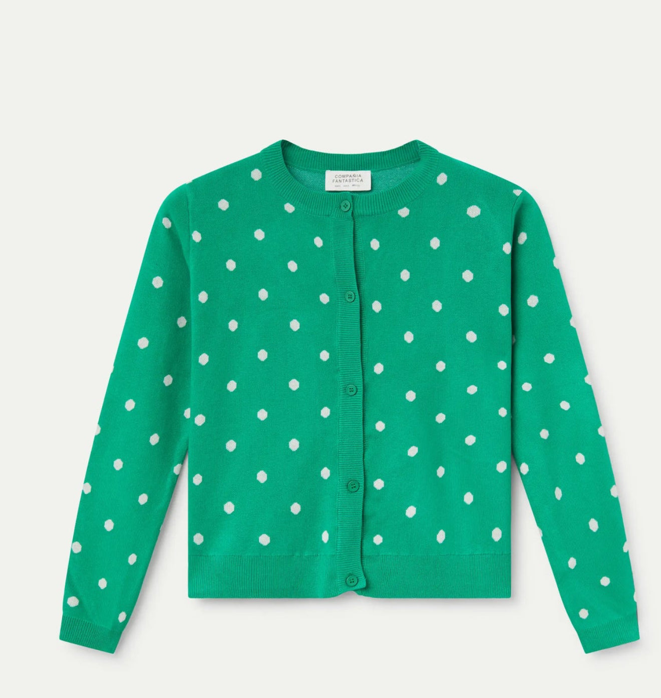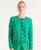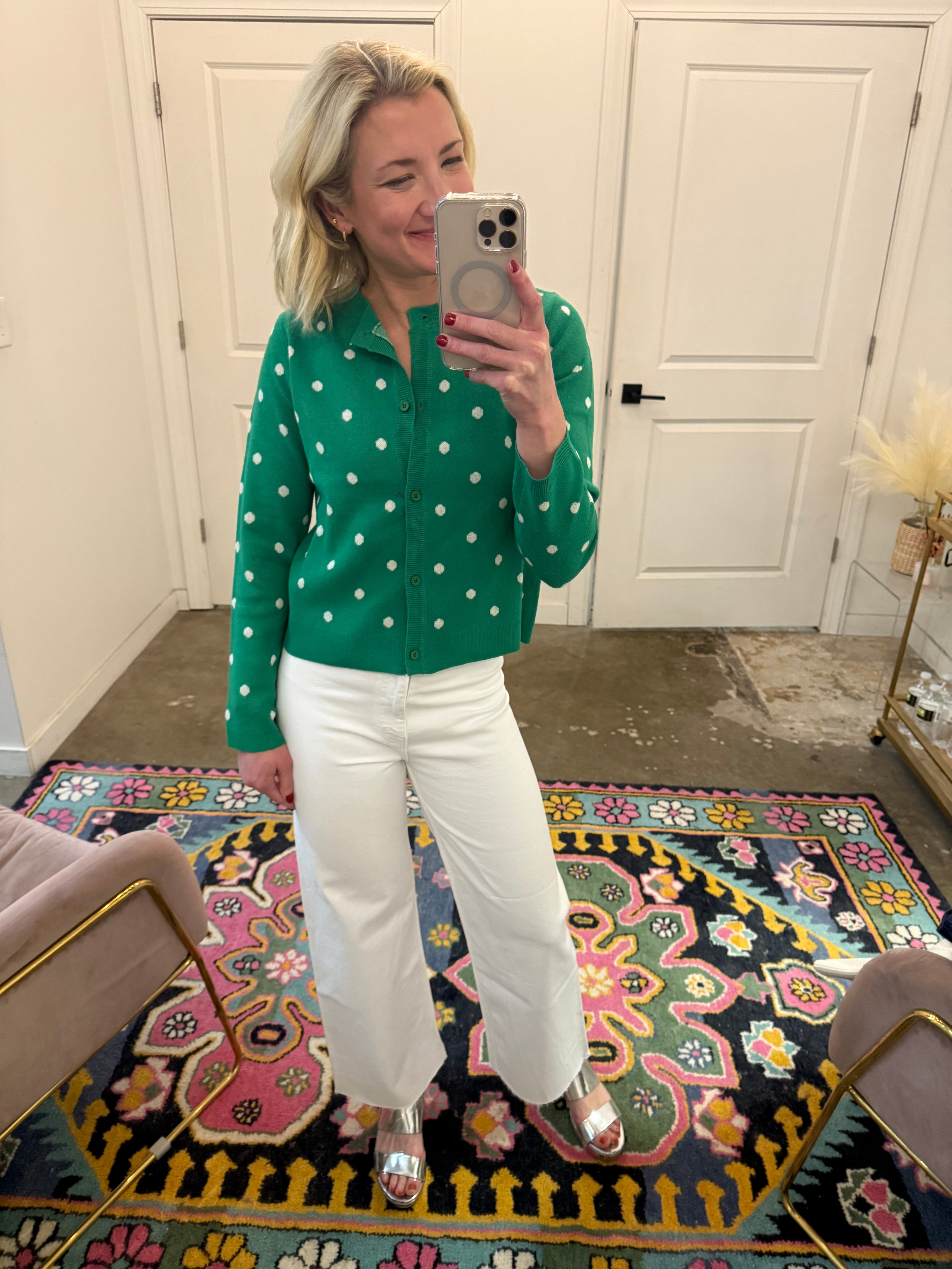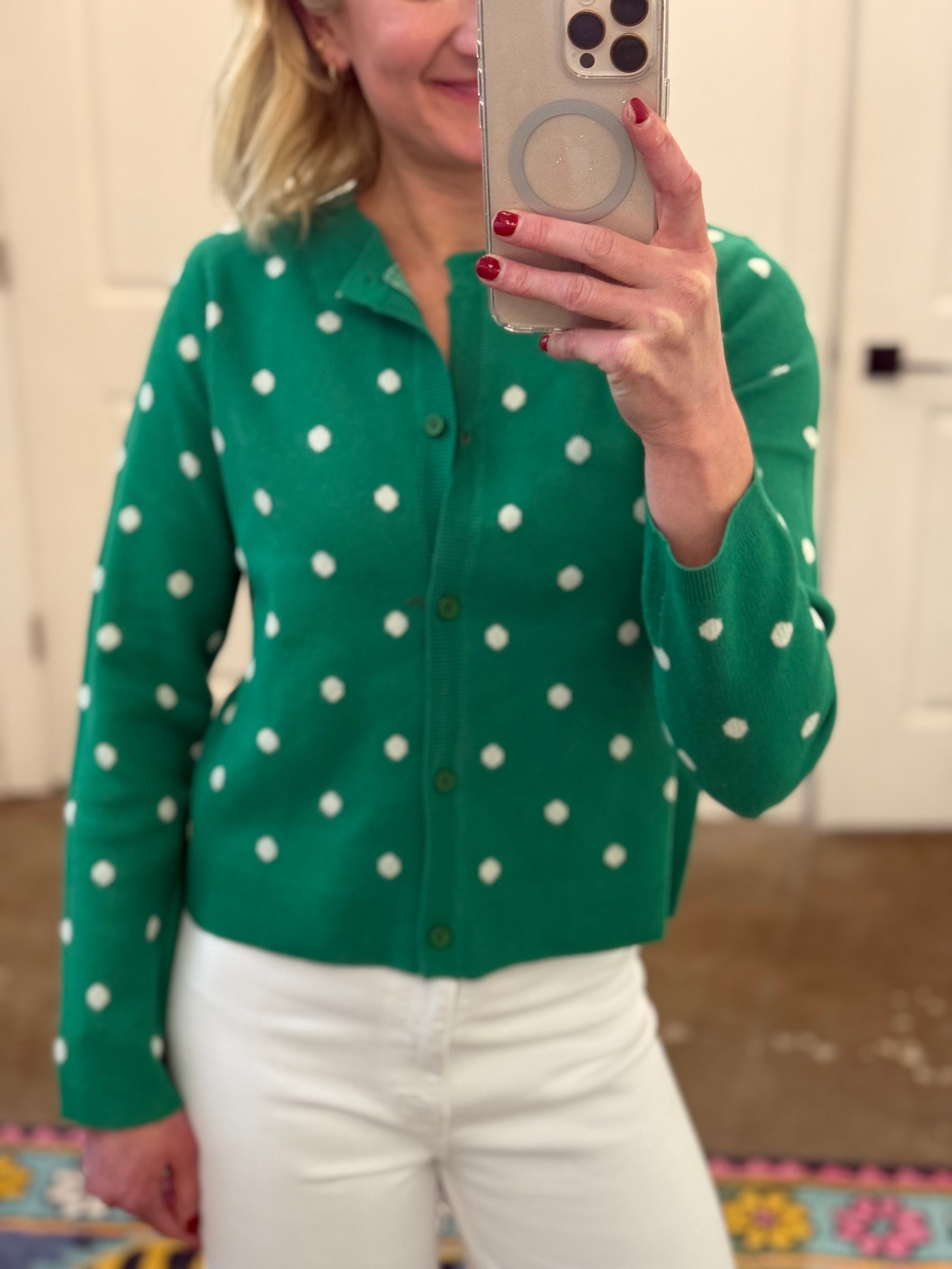 This cute button up cardigan features a fun green and white polka dot print! Pair with your favorite denim this Spring! Runs true to size. Sarah shown in a size small.