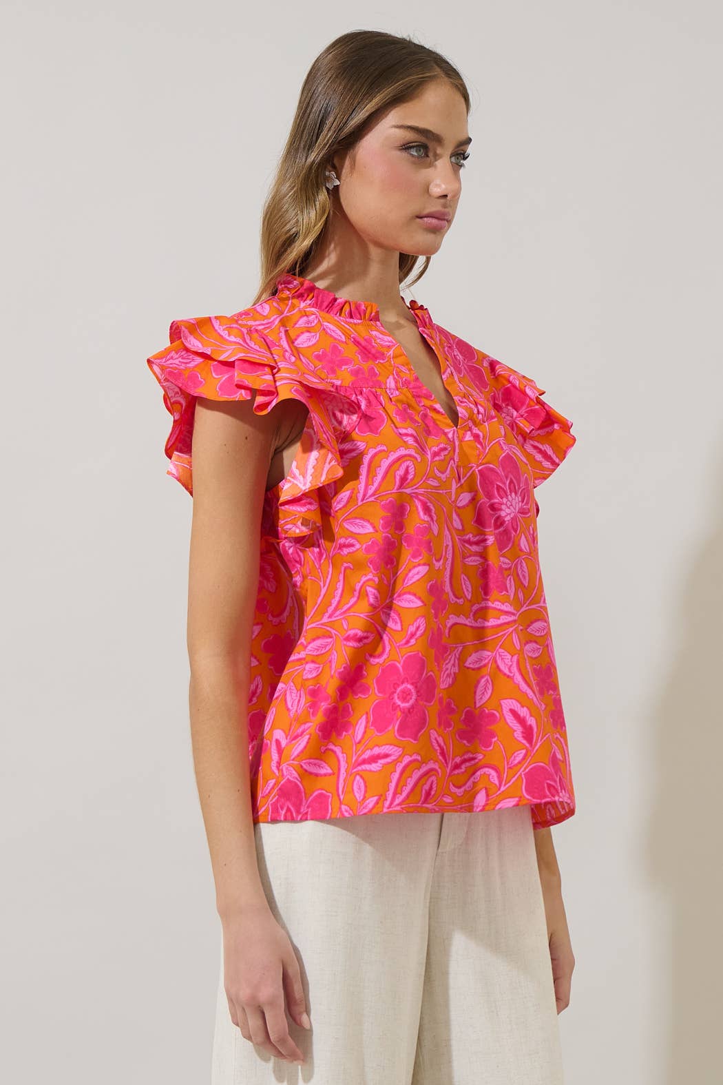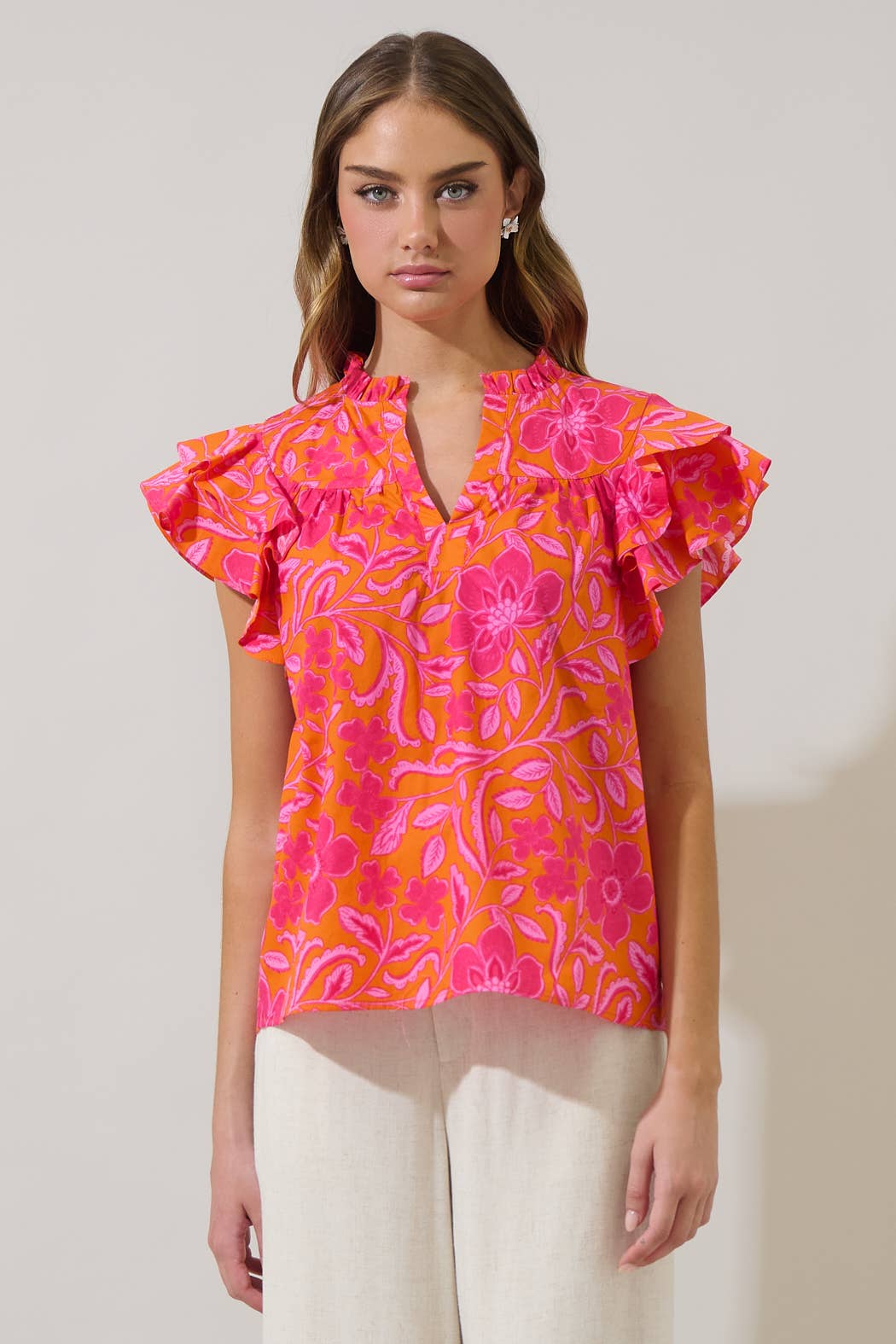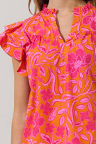 Put together a cute and casual outfit along with the Rea Floral Emery Split Neck Top. You will love the ruffle short sleeves followed by more ruffles around the neckline. It has a split neck and a relaxed fit that can be worn tucked into any pants or shorts.
