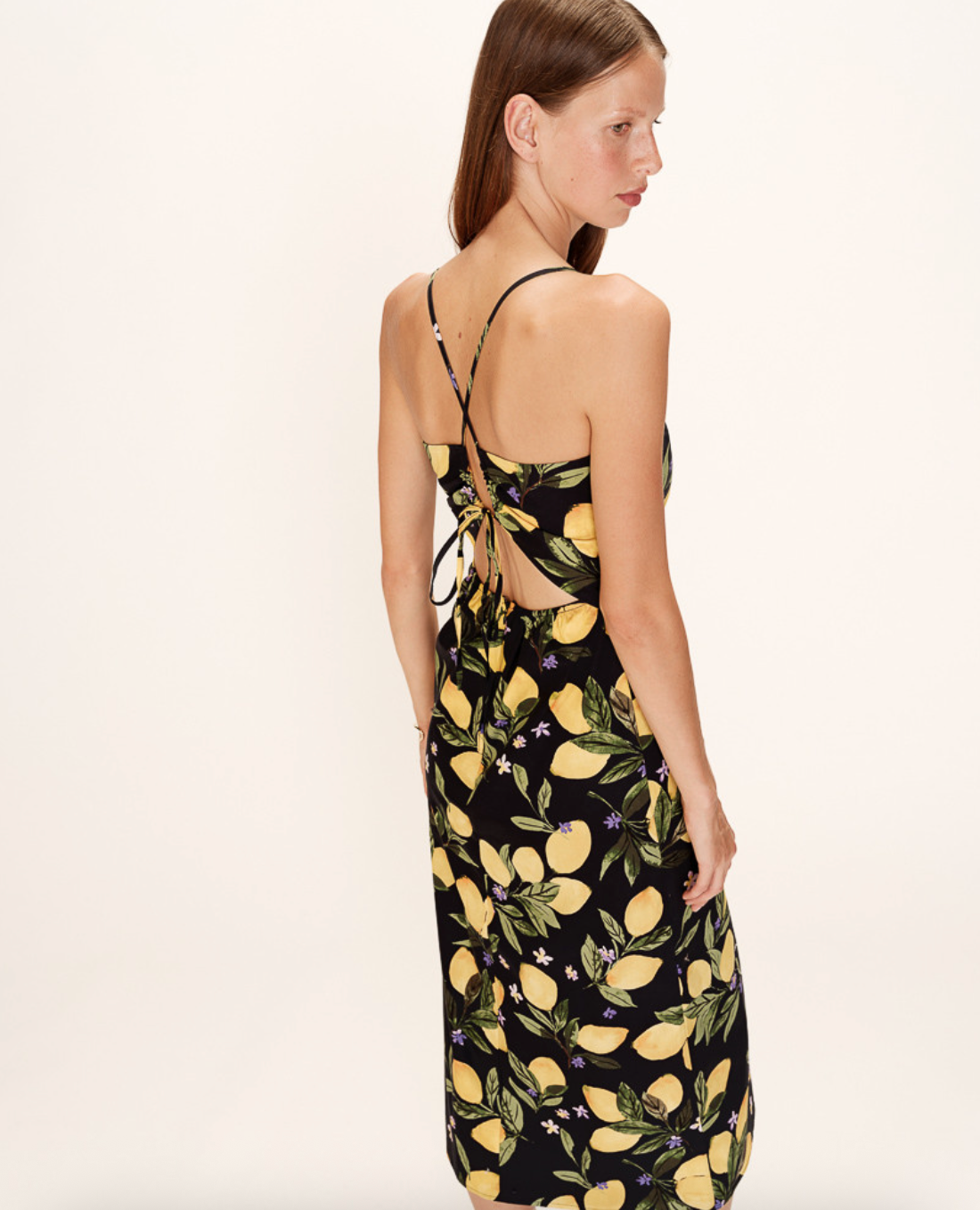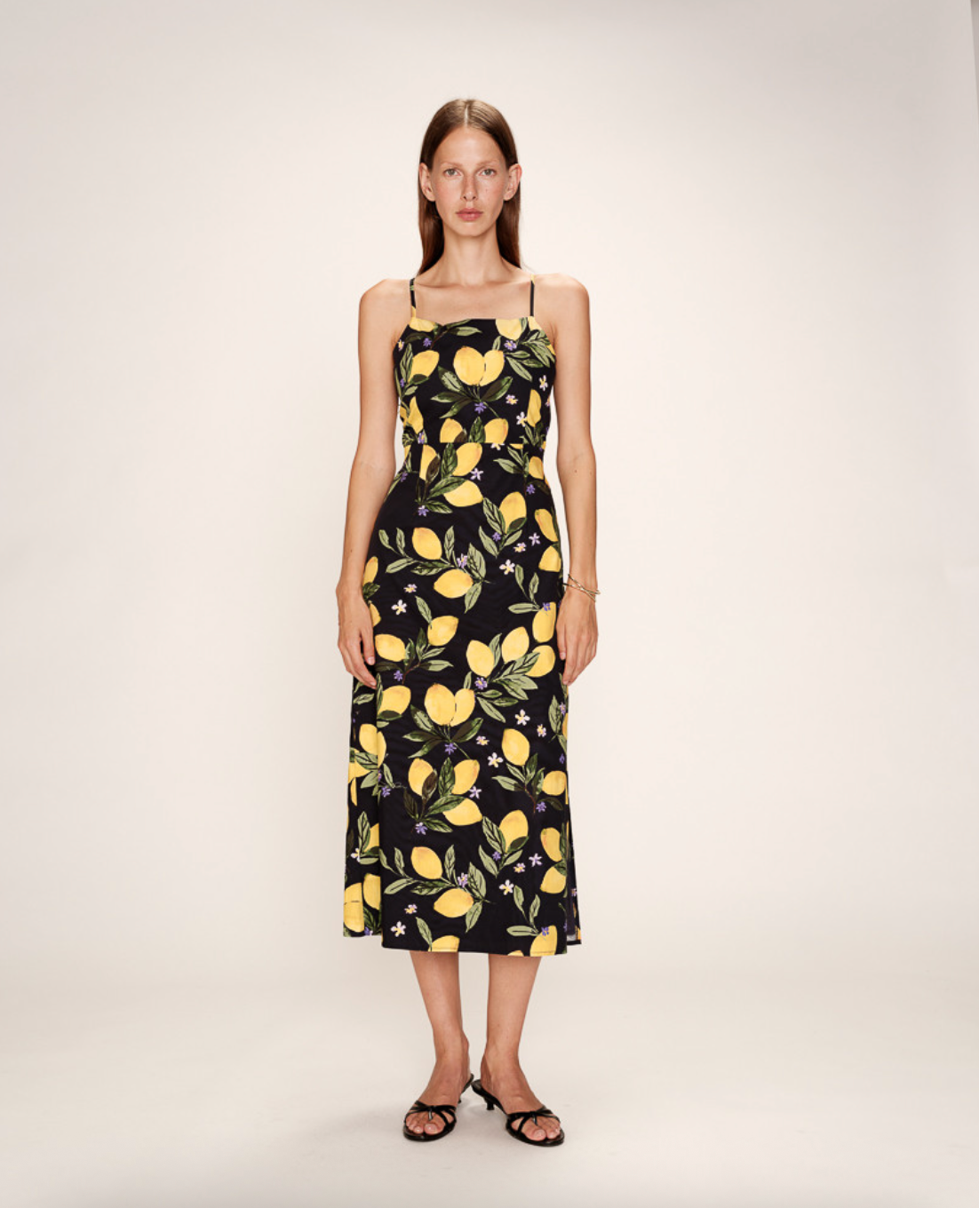 The Rebecca dress offers a modern and minimalist silhouette with its straight cut, square neckline, and thin straps that tie at the back. Made from natural fiber fabric and available in an exclusive lemon print or solid red, this dress is a perfect addition to any wardrobe.