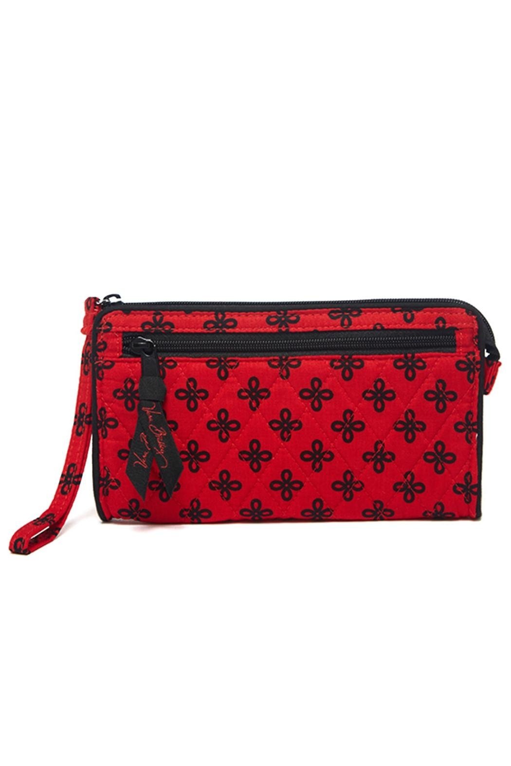Meet the Vera Bradley Front Zip Wristlet in the Red/Black Mini Concerto pattern. Perfect for a girls’ night out or shopping with friends, this chic wristlet has just enough room for all the essentials. The main zippered compartment offers six card slots and one bill pocket with enough room for your phone, while the front zip pocket is just the right size for stowing keys. It has a zip-top closure. Find hundreds of Vera Bradley Wristlets on the Mimi's Gift Gallery boutique page. Dimensions are 7 ½" Wide x 4 ½" High x 1" Deep with a 6" wrist strap.
