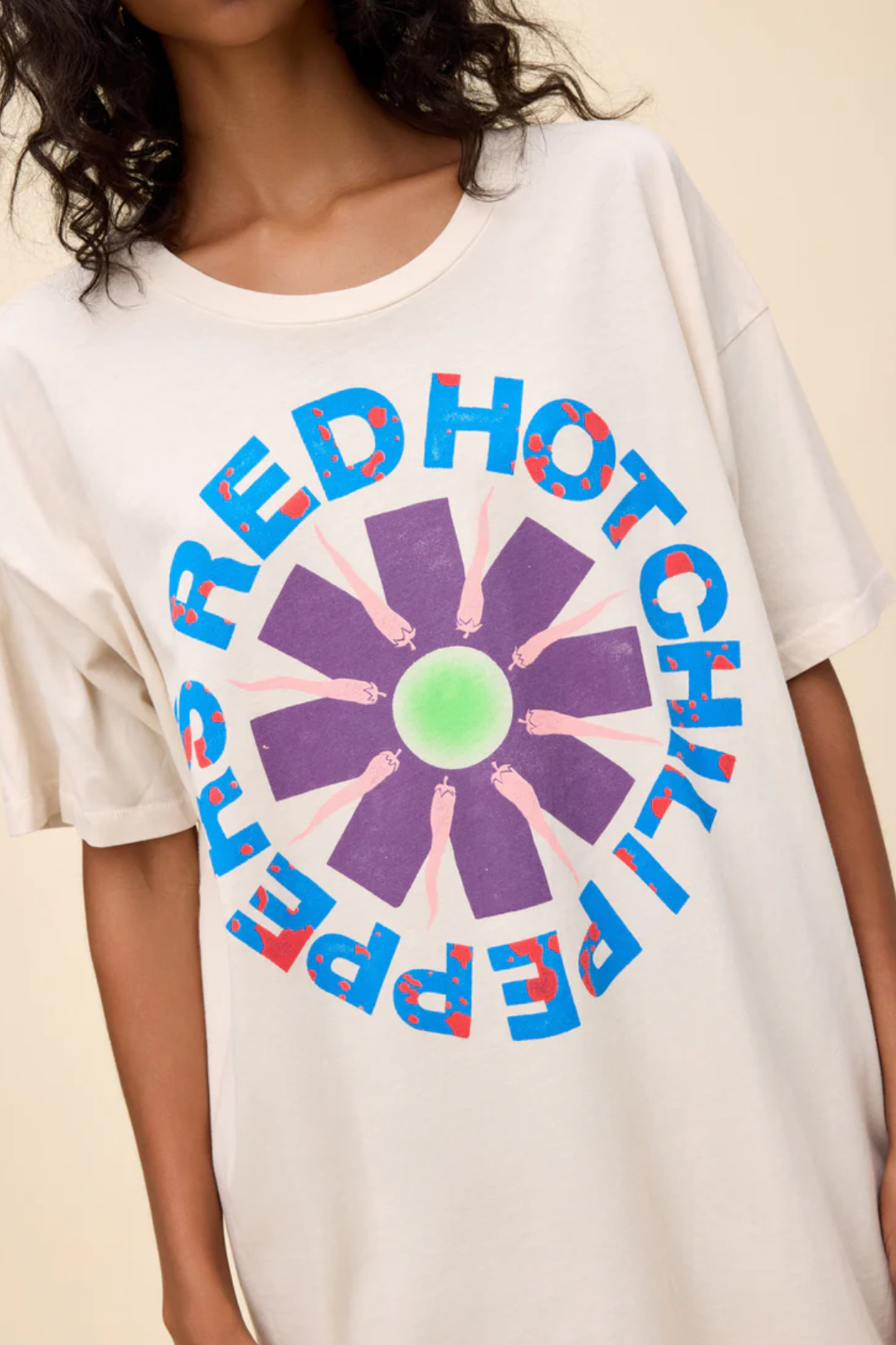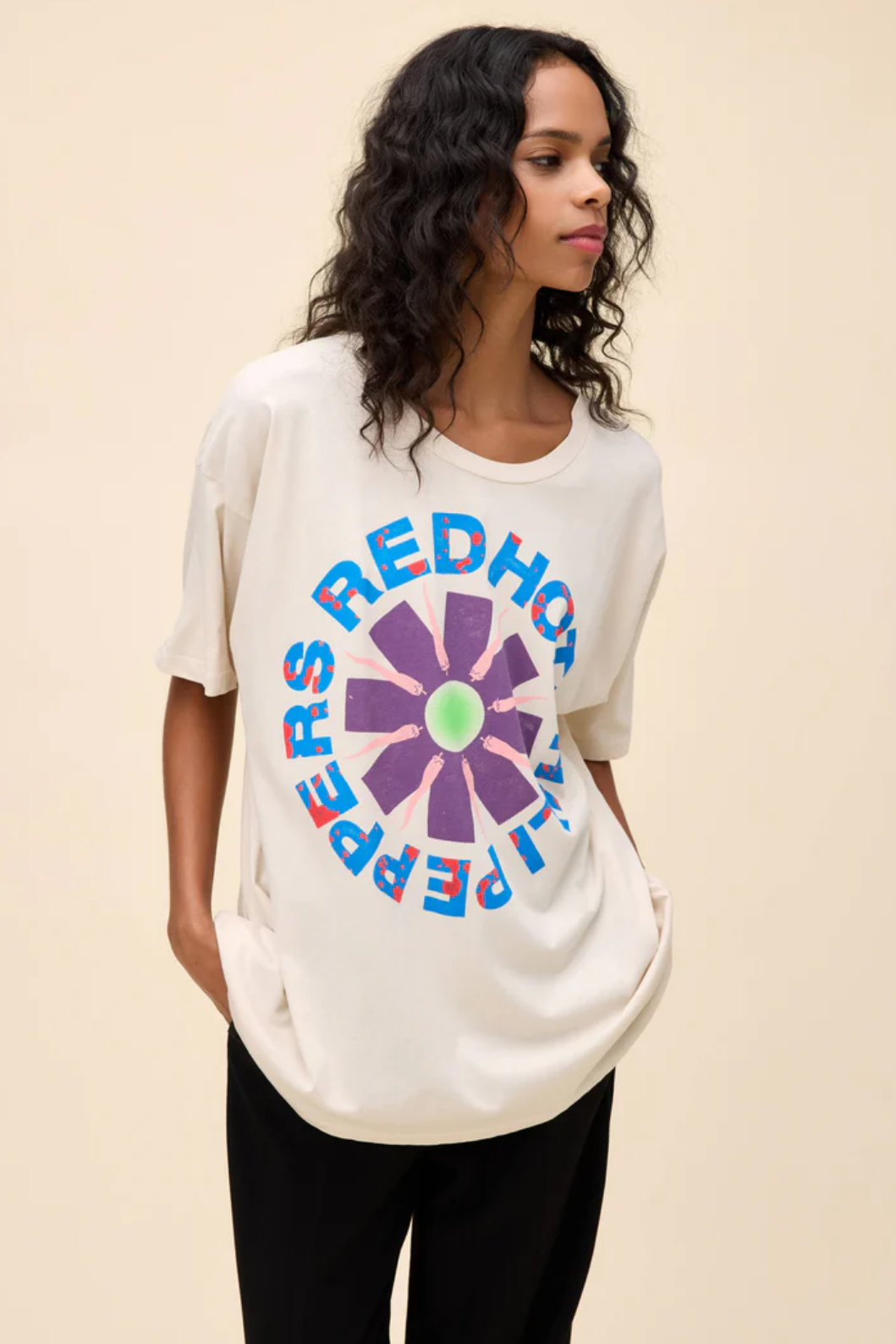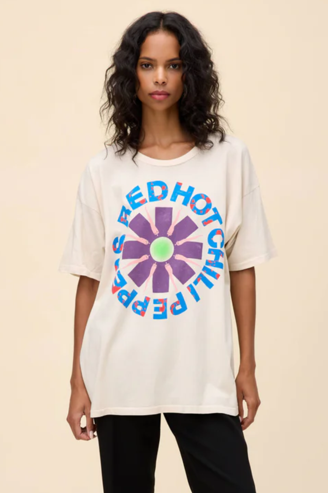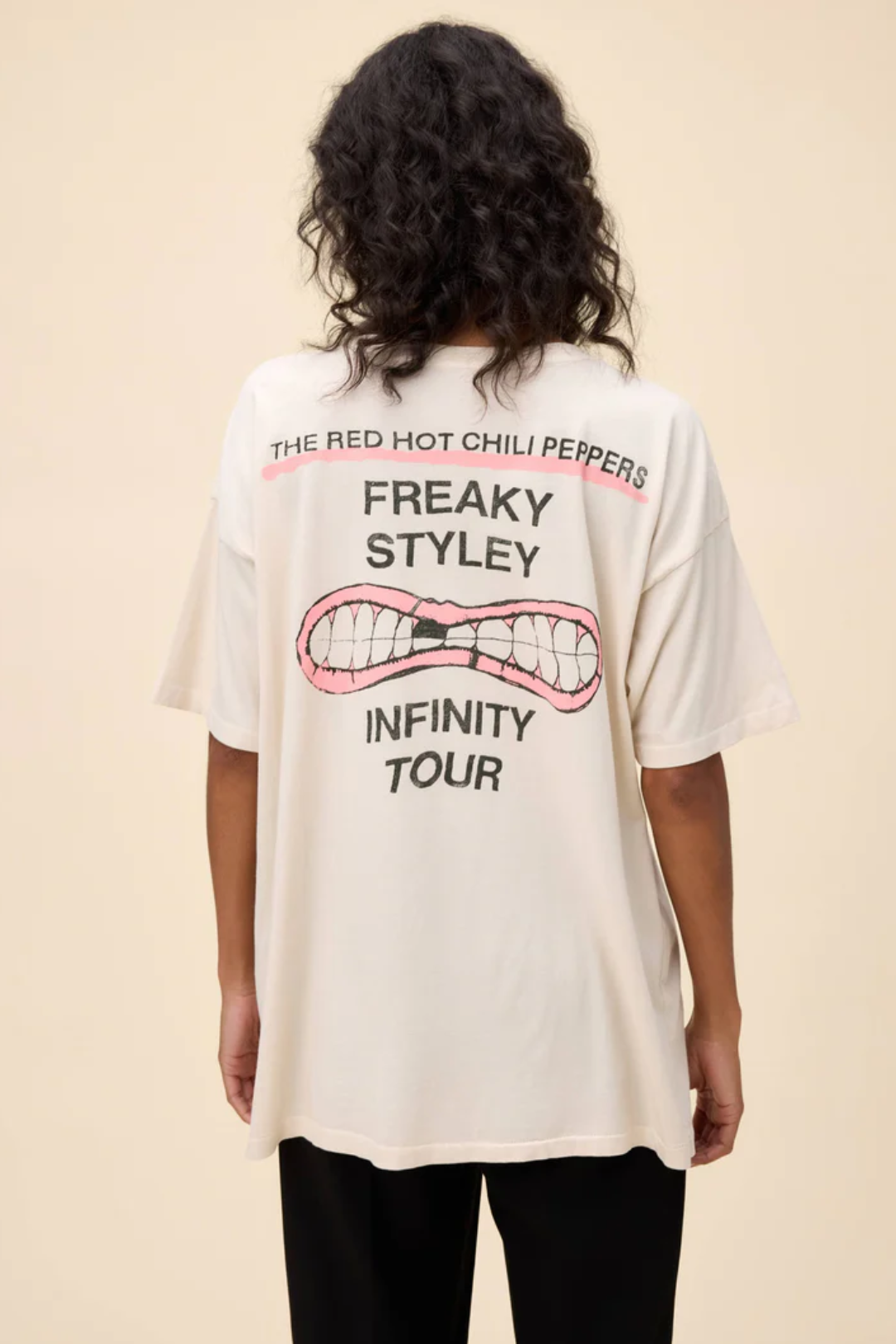 Stylish and fun, this Red Chili Hot Peppers Freaky Tee is the perfect year-round staple. Featuring their iconic asterisk logo with the band's name graphics on the front and their recognizable infinity smile slapped on the back. Perfect for weekend getaways, daily errands, going to music festivals, or just chillin' at home.