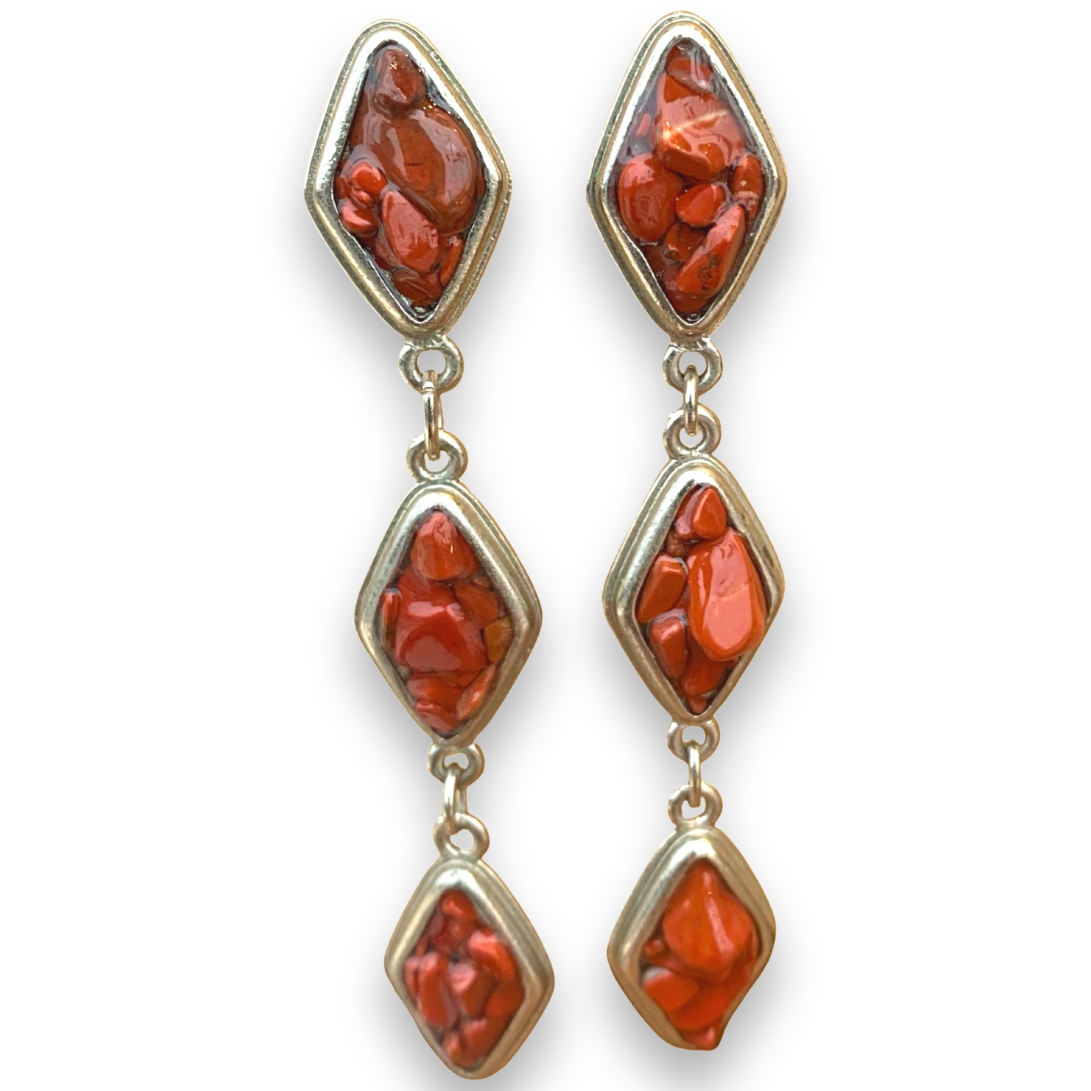 These beautiful natural red Jasper and silver drop earrings feature 3 diamond shaped charms dangling one from the other. There is nature crushed red jasper inlay with resin. Available in 24k or silver finish.