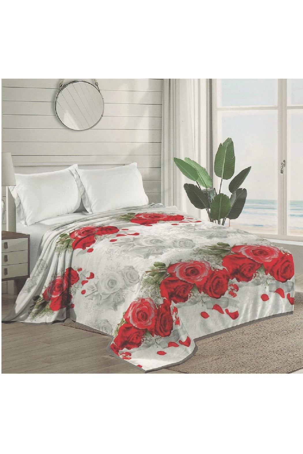 Red Roses Floral Blanket White Base With Gray & Red Roses - King Size