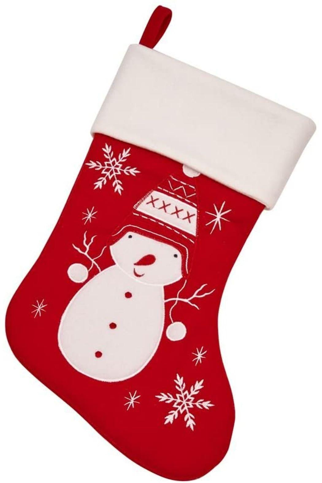 A classic stocking to hang from a fireplace, mantle or shelf. Featuring a snowman surrounded by snowflakes on a red background. Size: 15”.