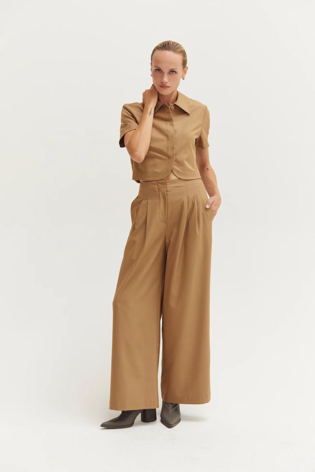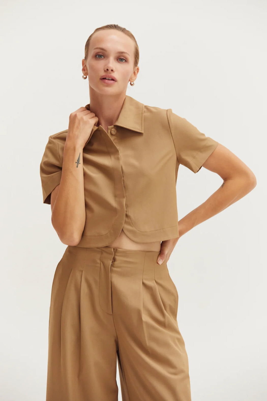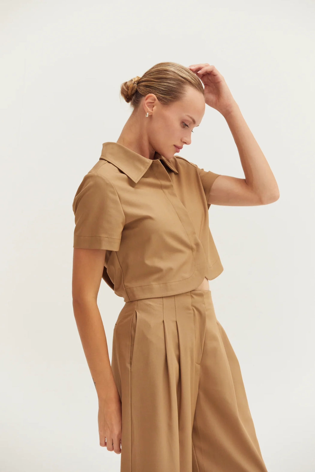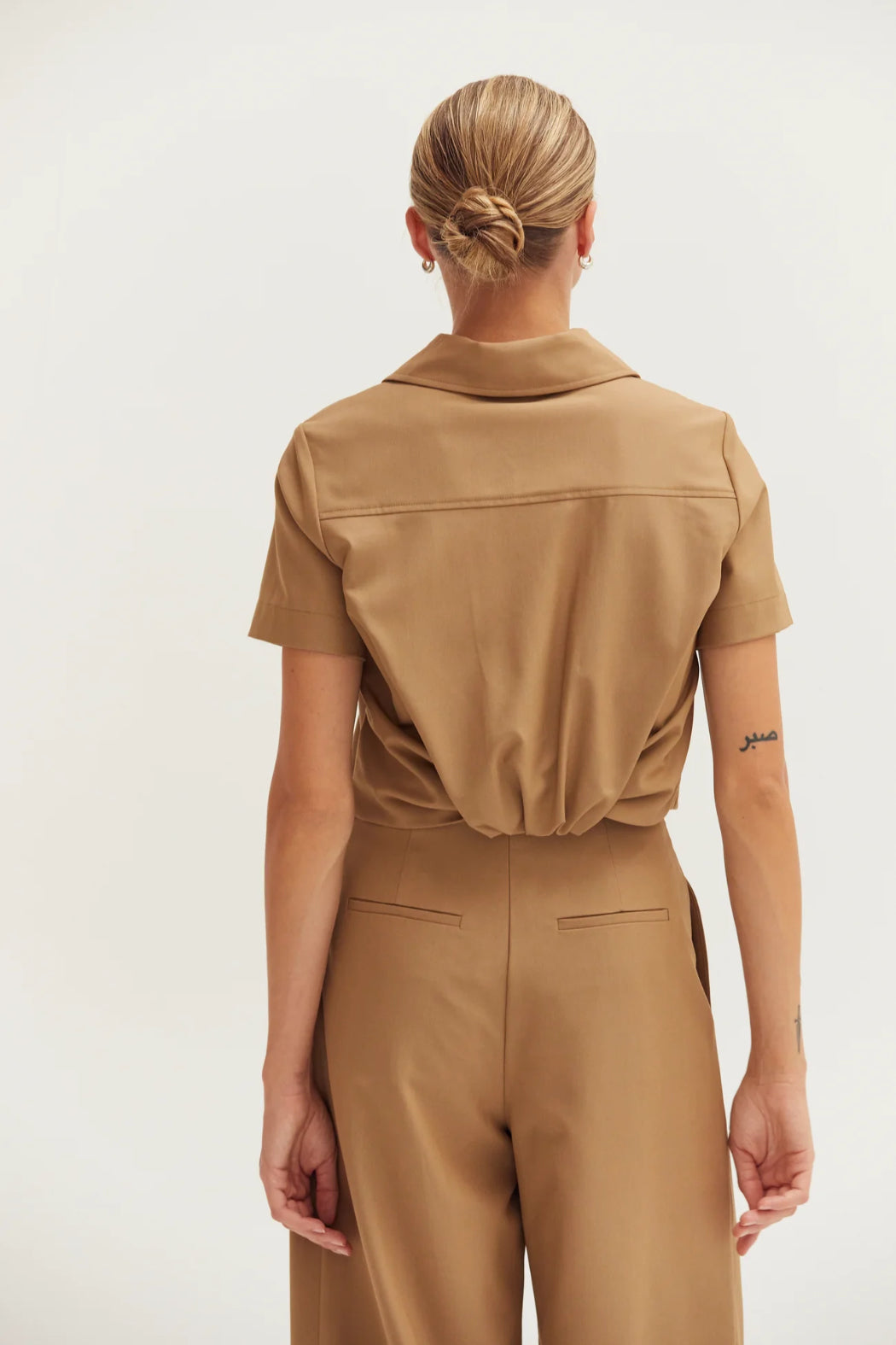 The Reese Short Sleeve Cropped Blazer Top features a collared neckline, short sleeves, front hidden snap button closure with curved hem, and a gathered bubble back detail. Cut in a semi cropped length.