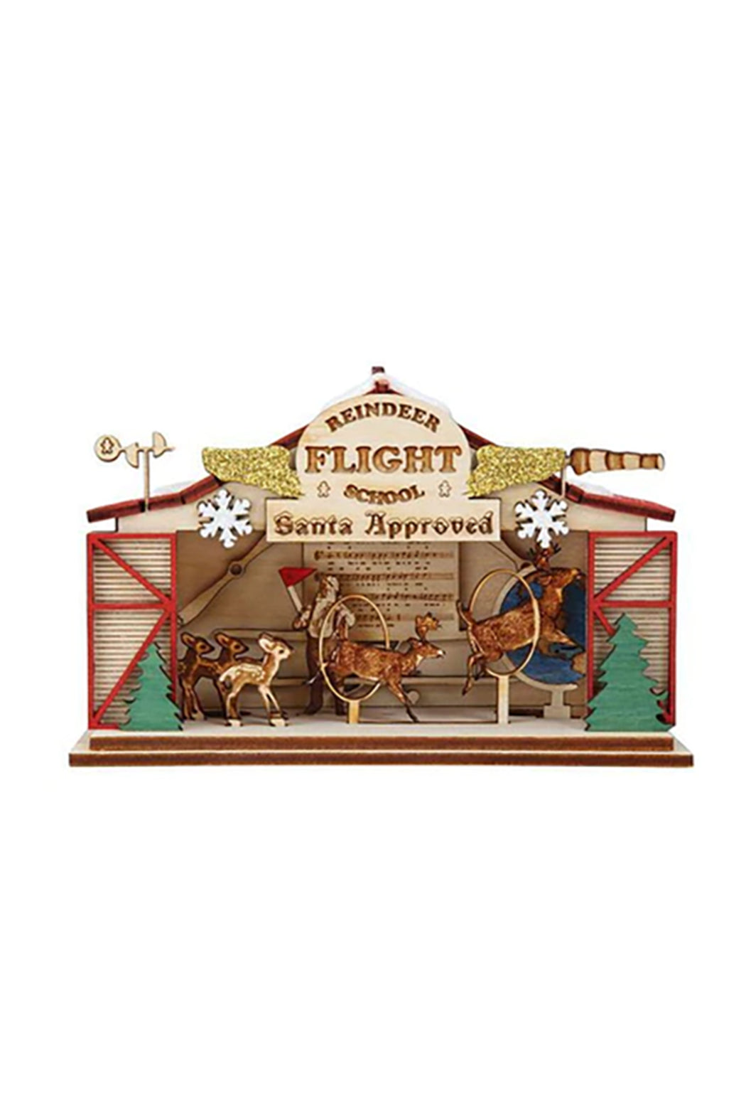 Reindeer Flight School has a small hole on its underside designed to borrow a standard bulb from your tree to light up the cottage. Upon lighting your cottage, you will immediately discover the first of many secrets, the beautifully crafted scene inside. What direction is the wind blowing? How many reindeer are learning to fly? What song do the reindeer have to learn before graduation? 2.25 X 5.25 X 3.5