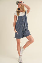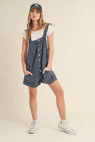 This washed romper features adjustable tying straps with large eyelet hardware for a comfortable and stylish fit. The relaxed fit, along with front and back pockets, makes this romper both functional and cute. With a front button up placket, this romper is a must-have for any casual wardrobe.