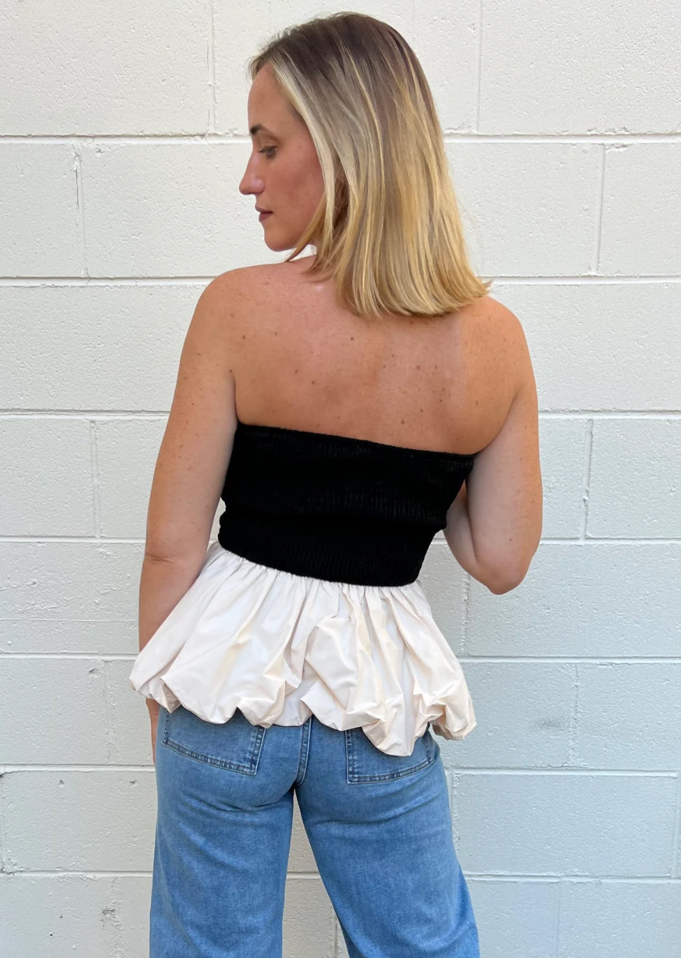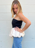 This top will stop traffic!! A strapless bubble hem top featuring a ruched bodice with contrast coloring. We love it paired with denim or black trousers and faux leather bottoms.