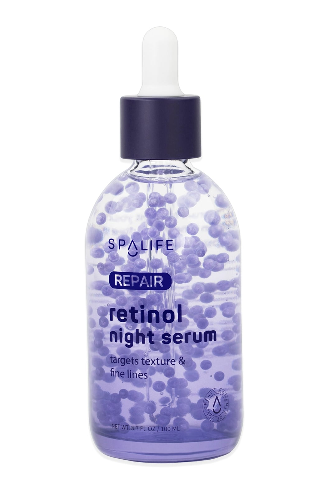 This Repair Retinol Night Serum is a lightweight evening treatment that helps target texture and fine lines while you sleep. The clear gel features purple encapsulated beads suspended in a glass dropper bottle for precise application. My Spa Life formulated this serum to visibly smooth skin and support nightly renewal with retinol. Keep it in your nighttime routine layered under moisturizer for best results.