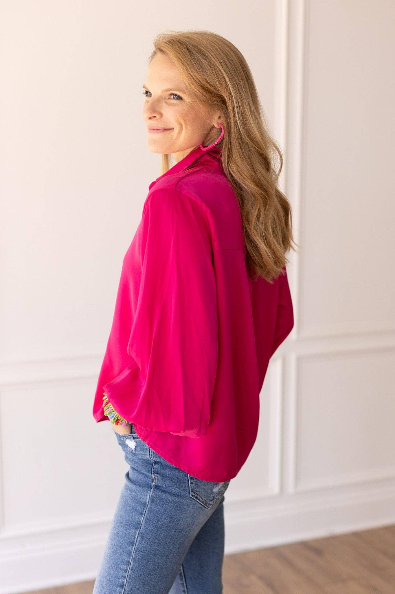Retro Reverie Balloon-Sleeve Blouse in Fuchsia: Fuchsia