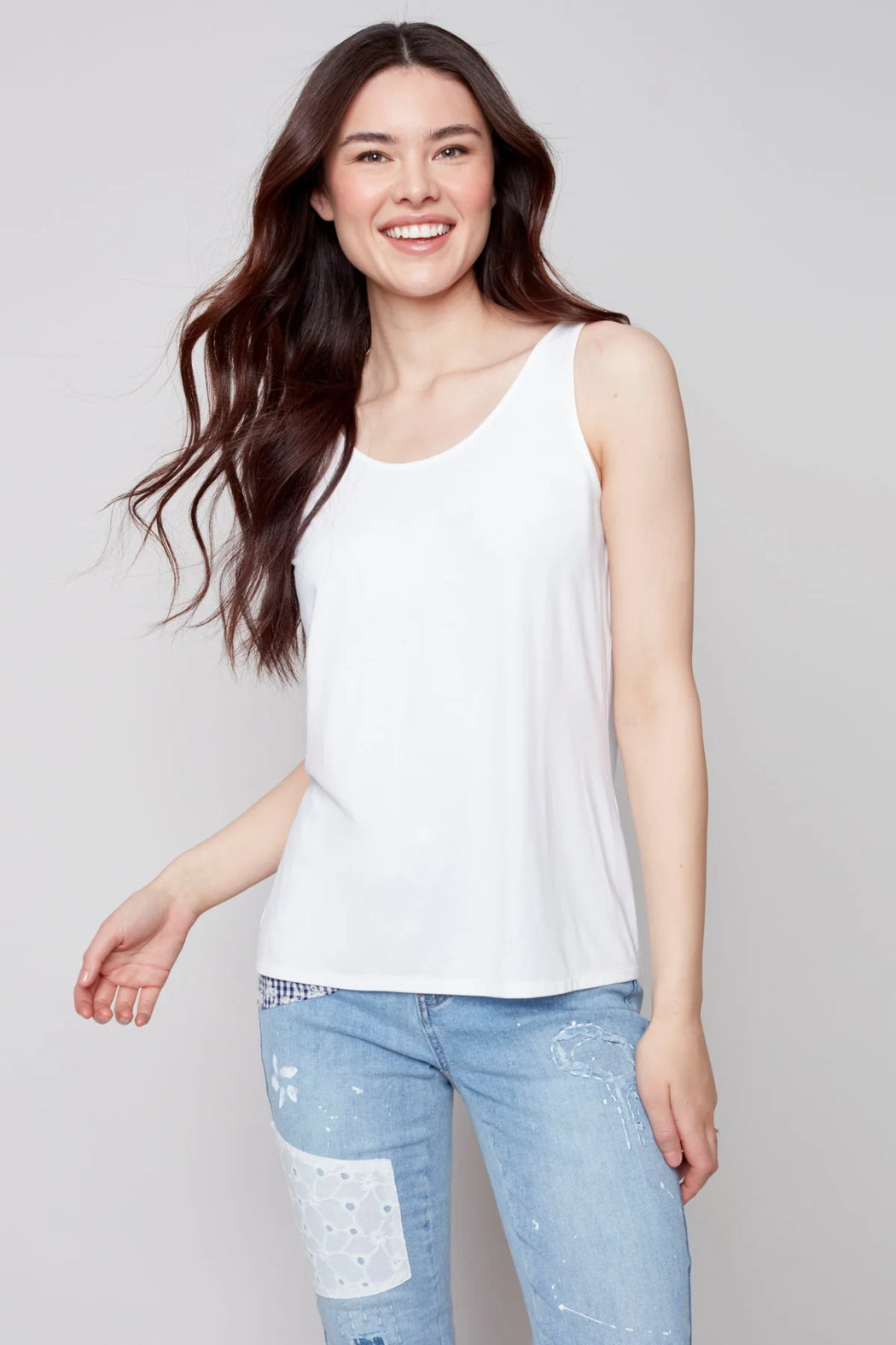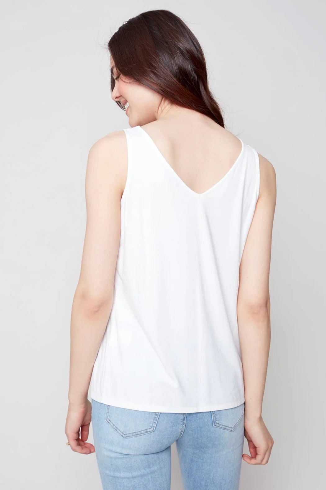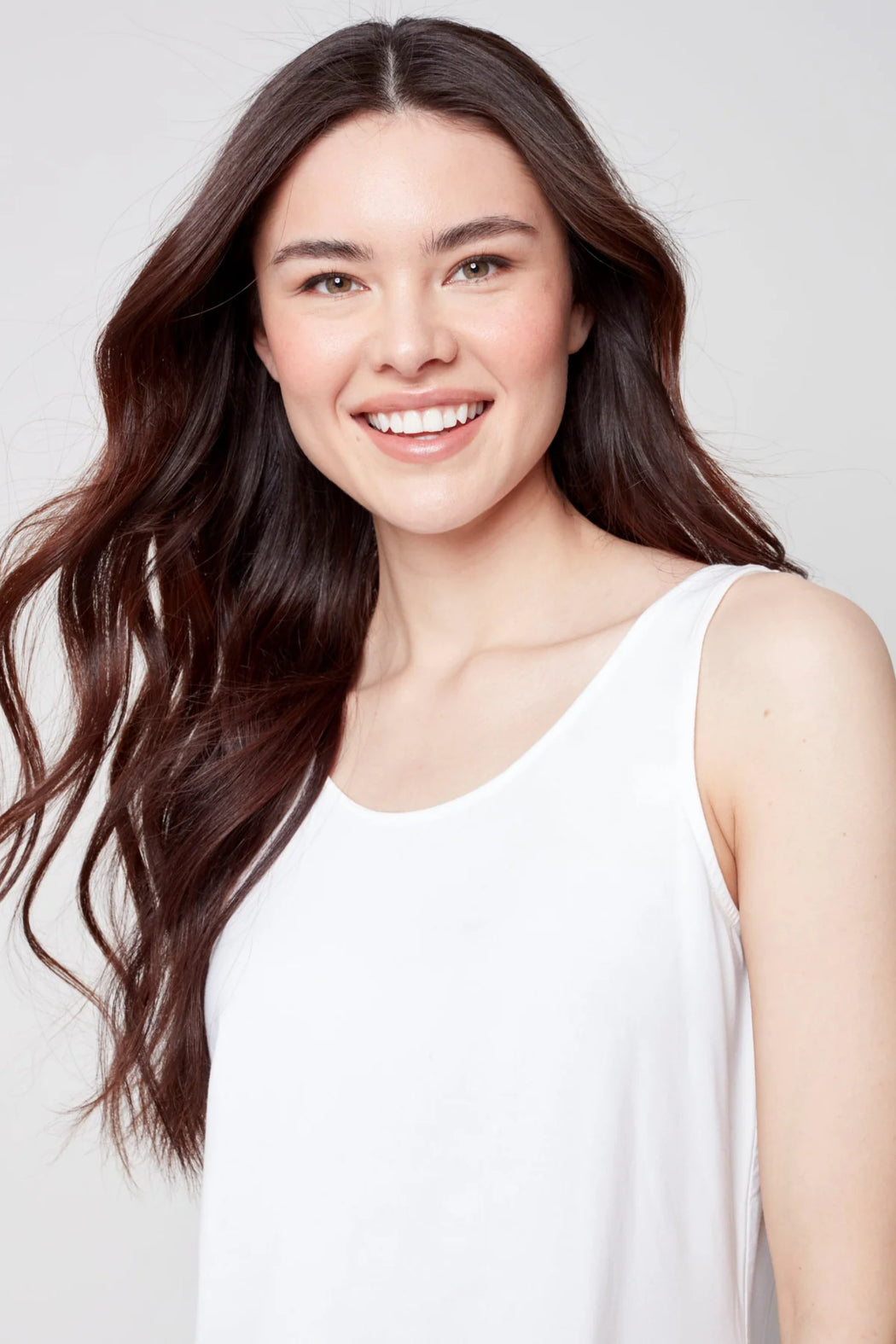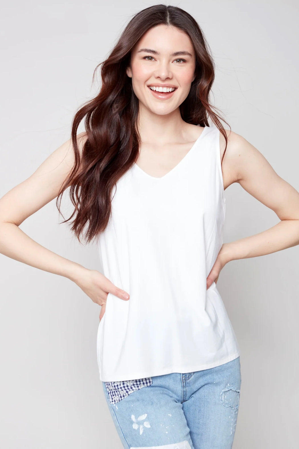 Stock up on this versatile tank top for women – it’s reversible, meaning you can wear it with the front scoop neckline, or the other side’s V neckline. New day, new shirt! Start your day fresh in this White women’s top.