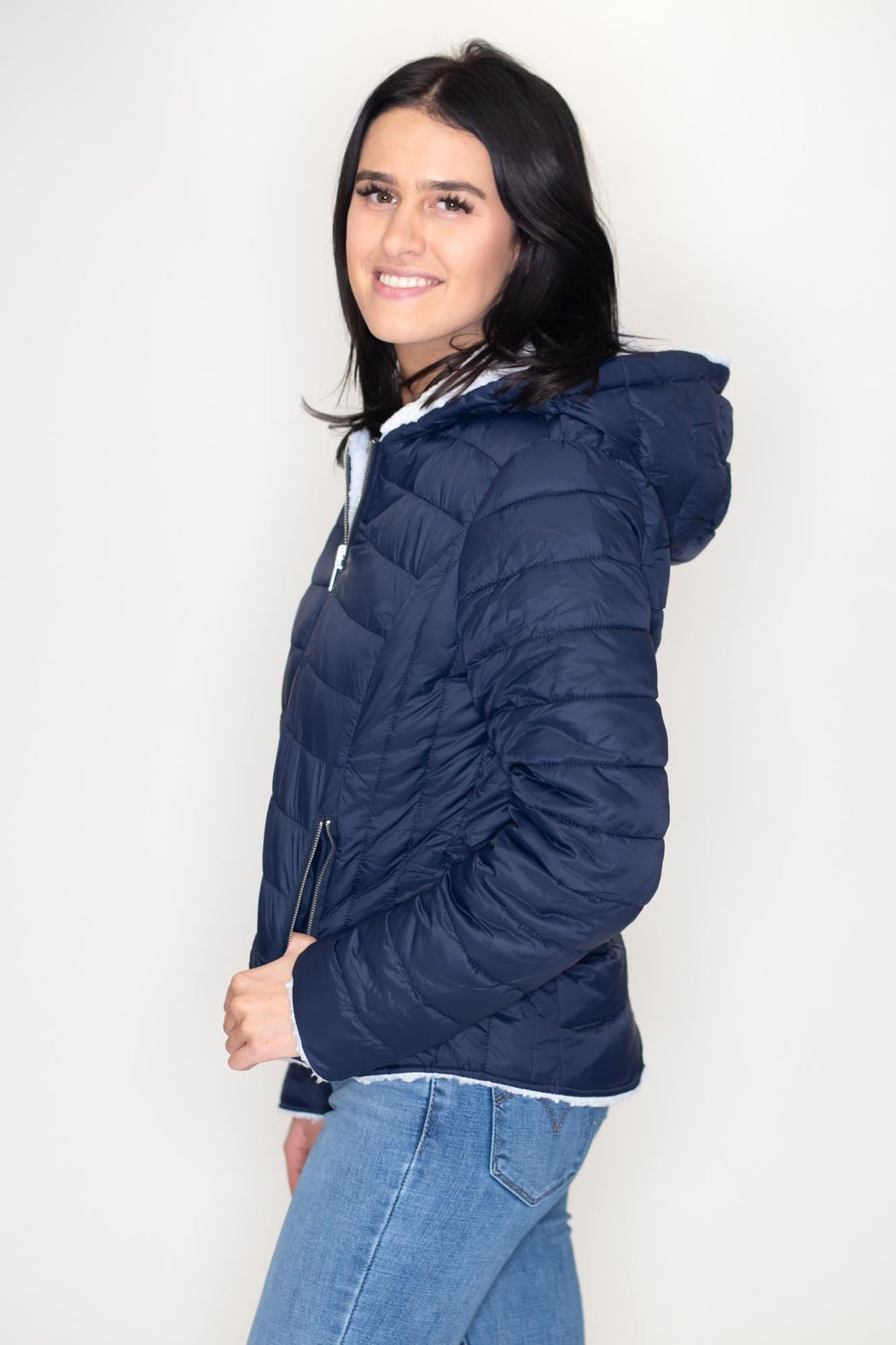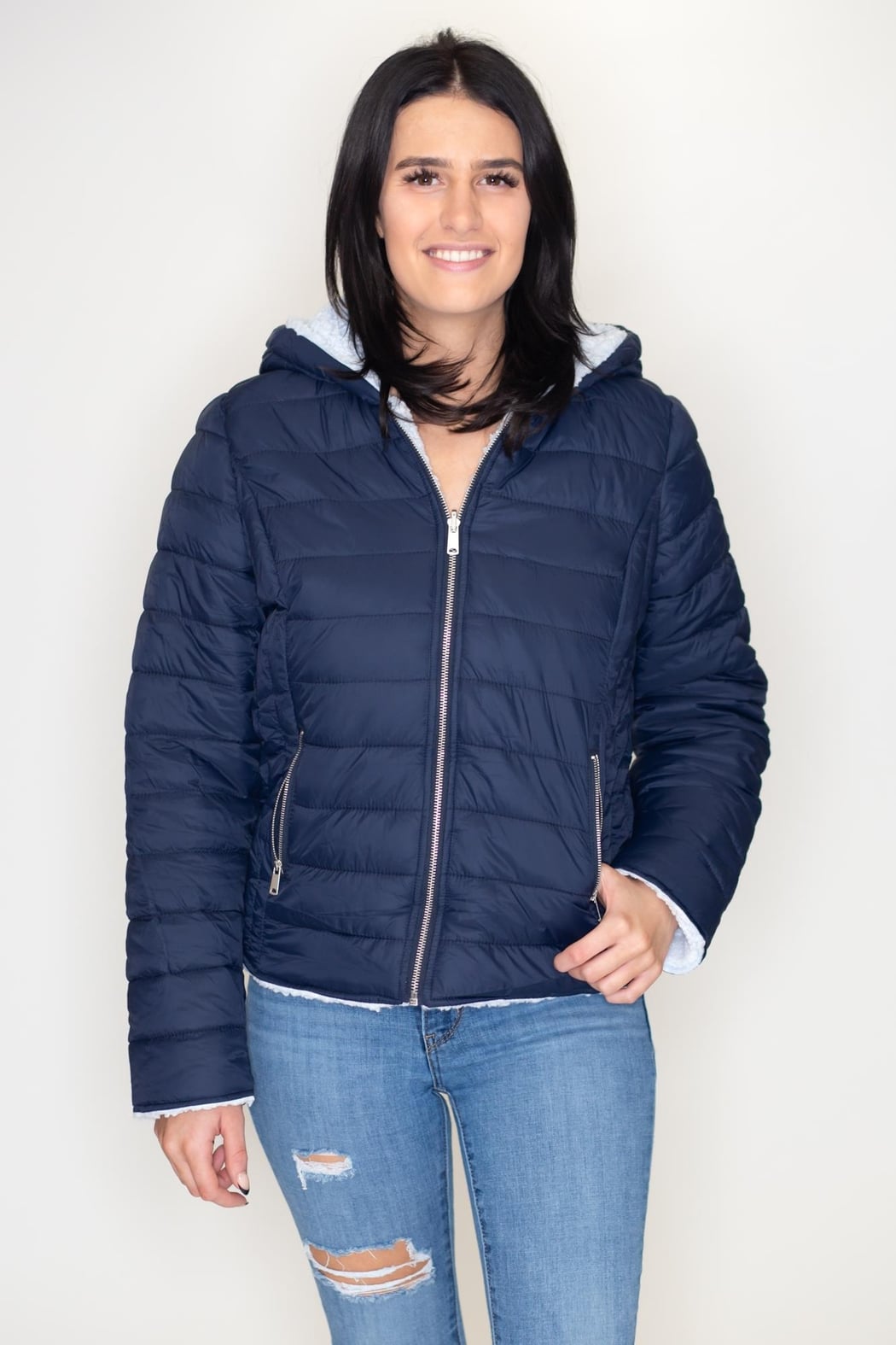 Reversible faux sherpa fleece puffer hooded jacket with 2 side zipper pockets and front zipper closure.