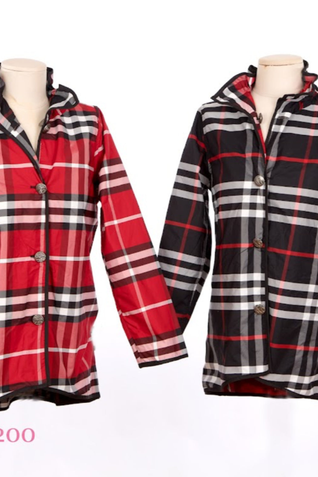 Water Repellant and Reversible Rain Coat Jacket. Four Button closing. Collar stands up as Designer has put thin wire in Collar. Buttons are Different on both sides. A Fabulous Addition to any Wardrobe. A Classic!