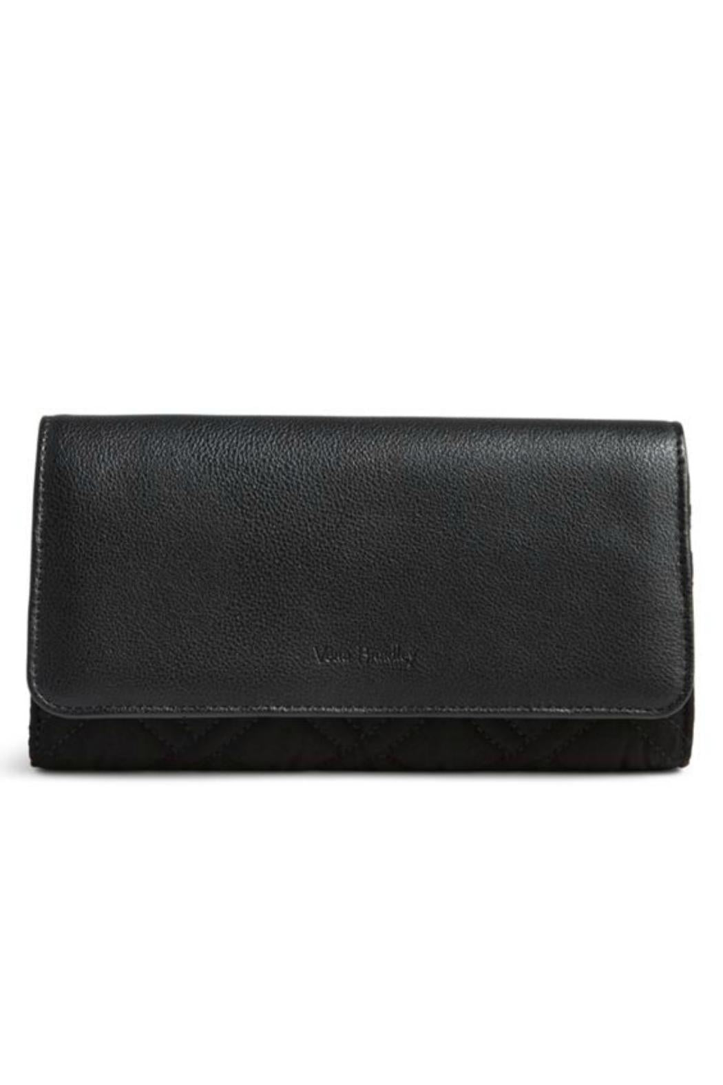 Meet the "ultimate"; the Vera Bradley "RFID Audrey" wallet in Classic Black Microfiber/Vegan Leather Combo. The beautiful basket weave quilted microfiber is colorful and lightweight, while the vegan leather front flap adds a powerful classic punch. Provides RFID protection for credit and debit cards. Exterior zip pocket on back. Two pleated compartments with 12 credit card slip pockets, two large bill pockets, and a center zip pocket. Hidden pin snap closure. Find other Classic Black bags and accessories on the "Mimi's Gift Gallery" boutique page. Now, what else may we do for you today? ------- Dimensions are 7 ¾" wide x 4" high x 1 ½" deep