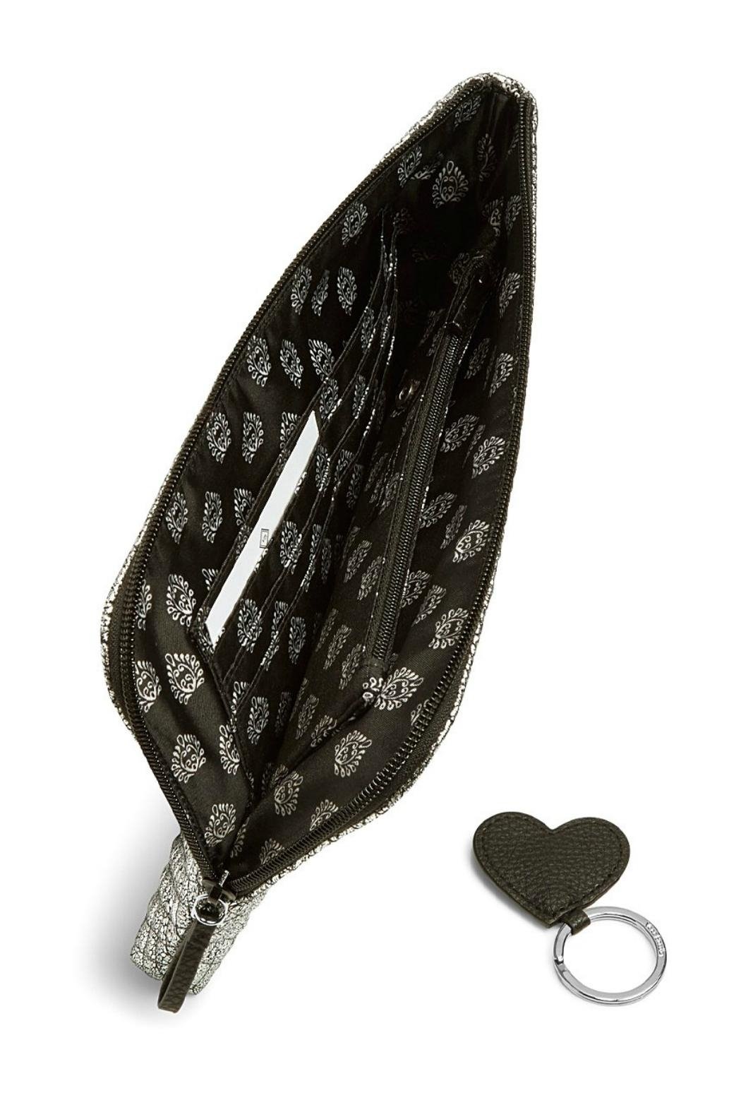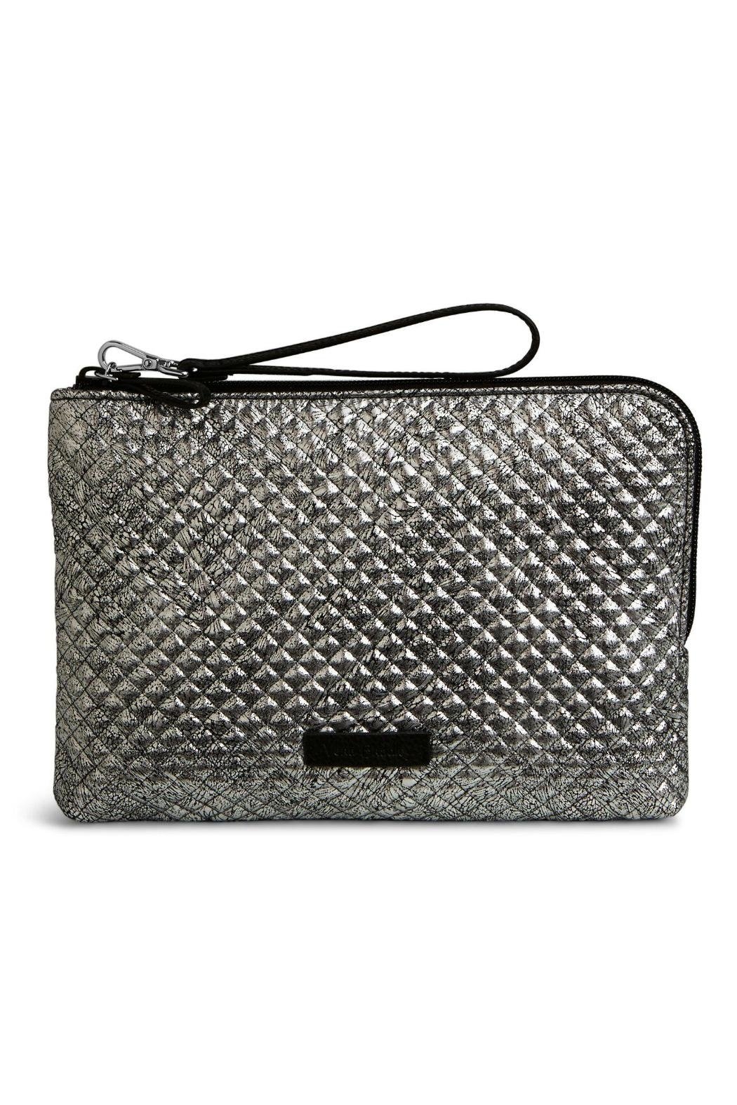 Meet the Vera Bradley Iconic RFID Wristlet in Mist! This signature-printed wristlet promises peace-of-mind on the fly with streetwise RFID protection for your credit and debit cards. The slim, purse-friendly design keeps every card and coin in order. The back zip pocket has plenty of room for your phone. Inside, there are six card slips, a cash or checkbook slip, a zip compartment, and a slip pocket behind that. There is also a snap-in removeable heart shaped key ring. Zip closure with silver tone hardware. This black and silver diamond quilted bag is so stunning, it is perfect for a special occasion, but you'll love it so much, you'll end up carrying it every day! ------- Dimensions: 10.5'' Wide x 7'' High with a 7" vegan leather wrist strap.