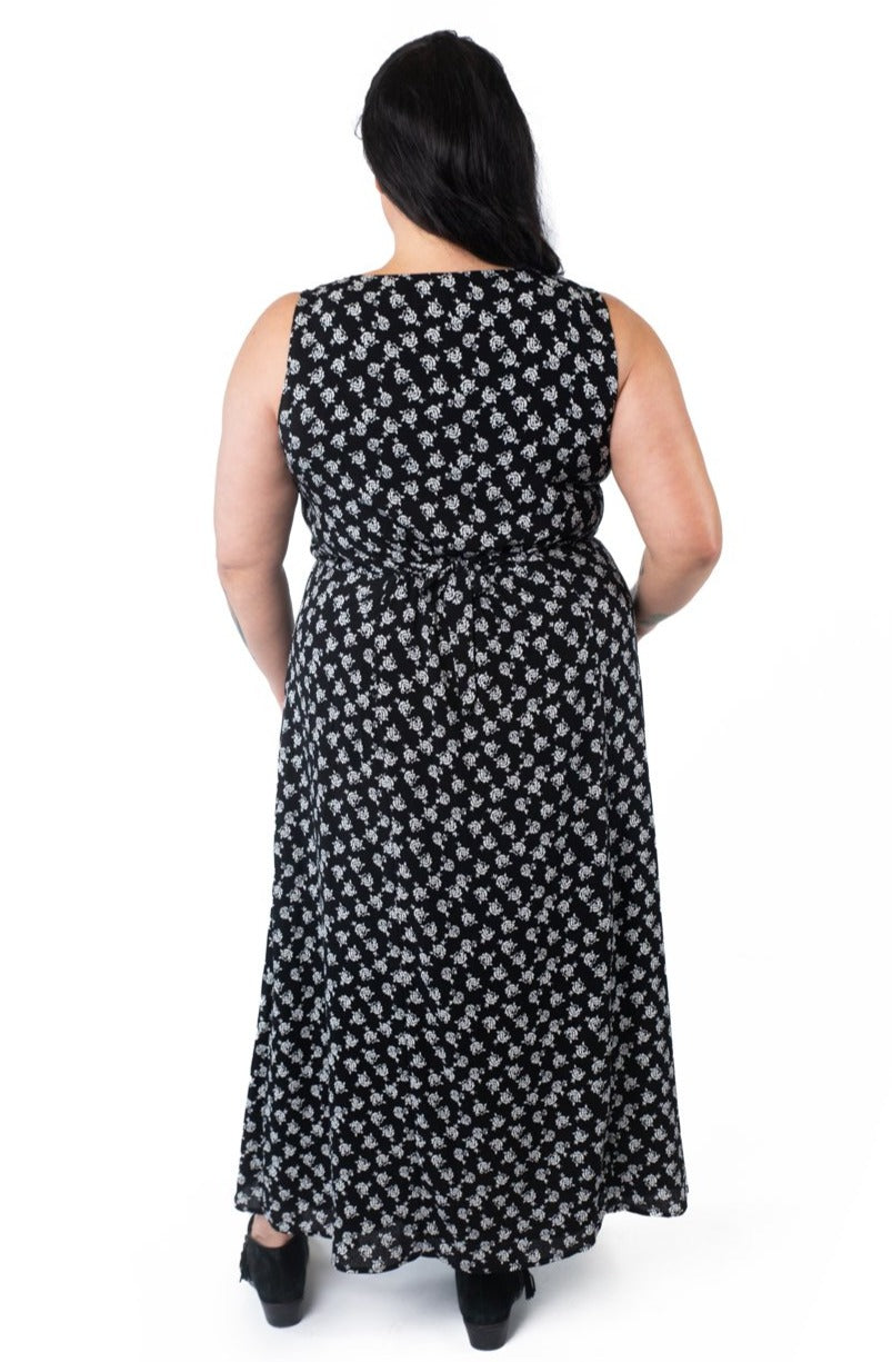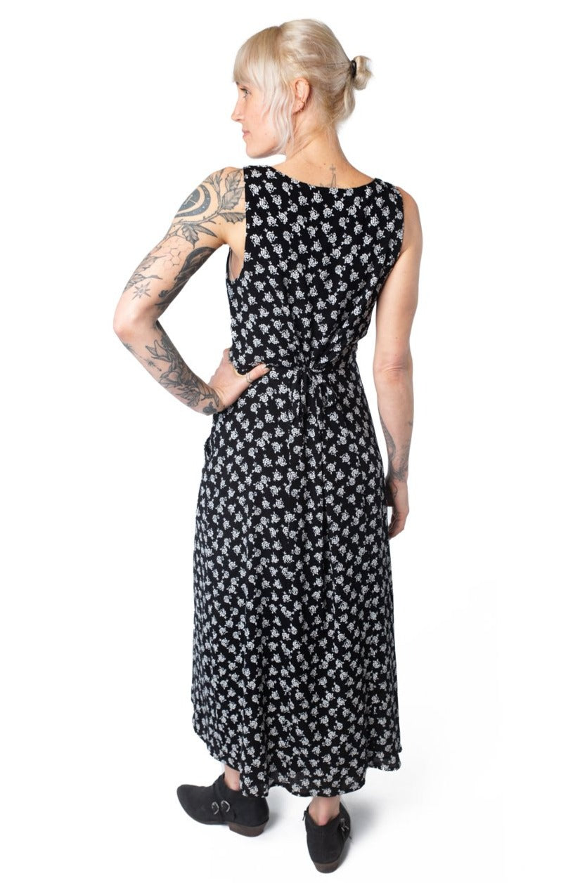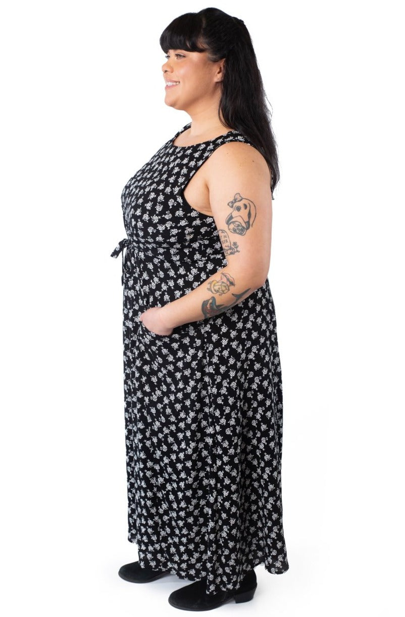 The Rhiannon dress is long and elegant with a little added whimsy with the 2 pairs of optional front or side ties. A bit of elastic sewn into the front of the highwasit for ease. Bust dart comes up from the high waist allowing a slip on fit. Big inset pockets for everything you need. Sleeveless with roomy armholes for comfort. Can be worn with a cropped long sleeve top underneath in colder weather.