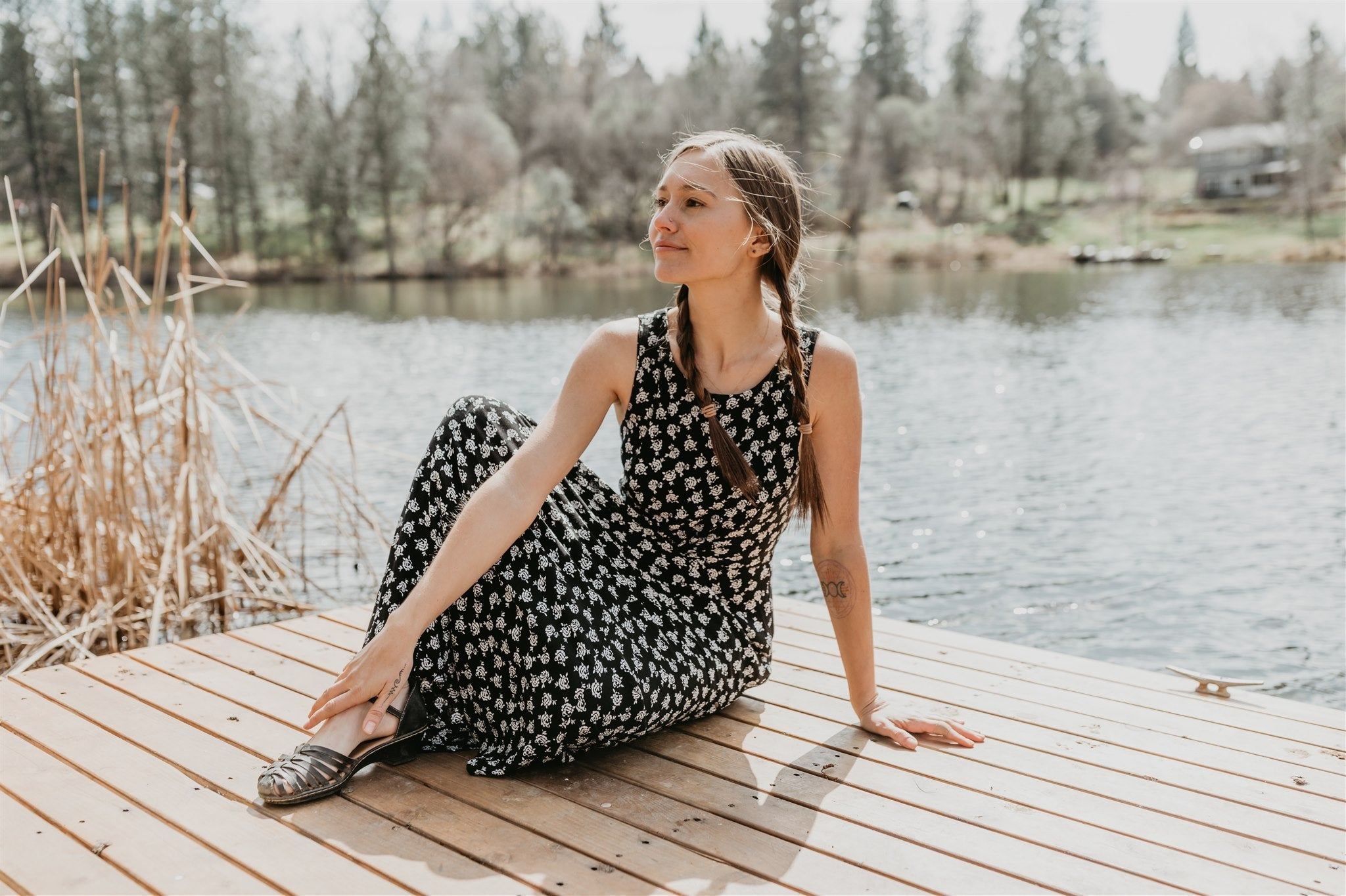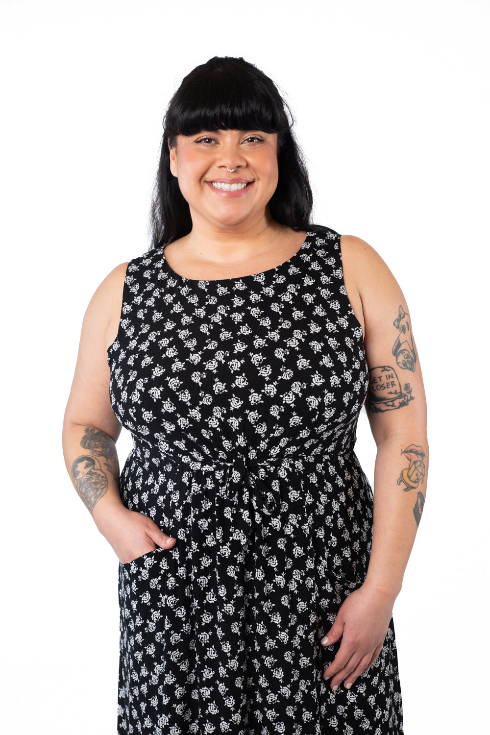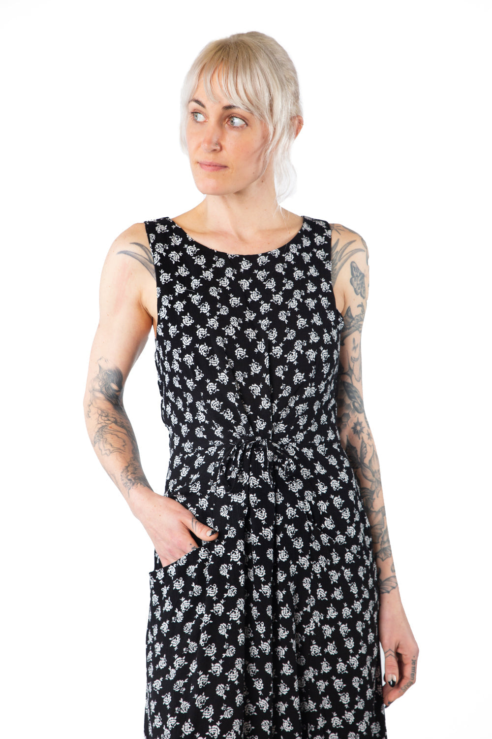 The Rhiannon dress is long and elegant with a little added whimsy with the 2 pairs of optional front or side ties. A bit of elastic sewn into the front of the highwasit for ease. Bust dart comes up from the high waist allowing a slip on fit. Big inset pockets for everything you need. Sleeveless with roomy armholes for comfort. Can be worn with a cropped long sleeve top underneath in colder weather.