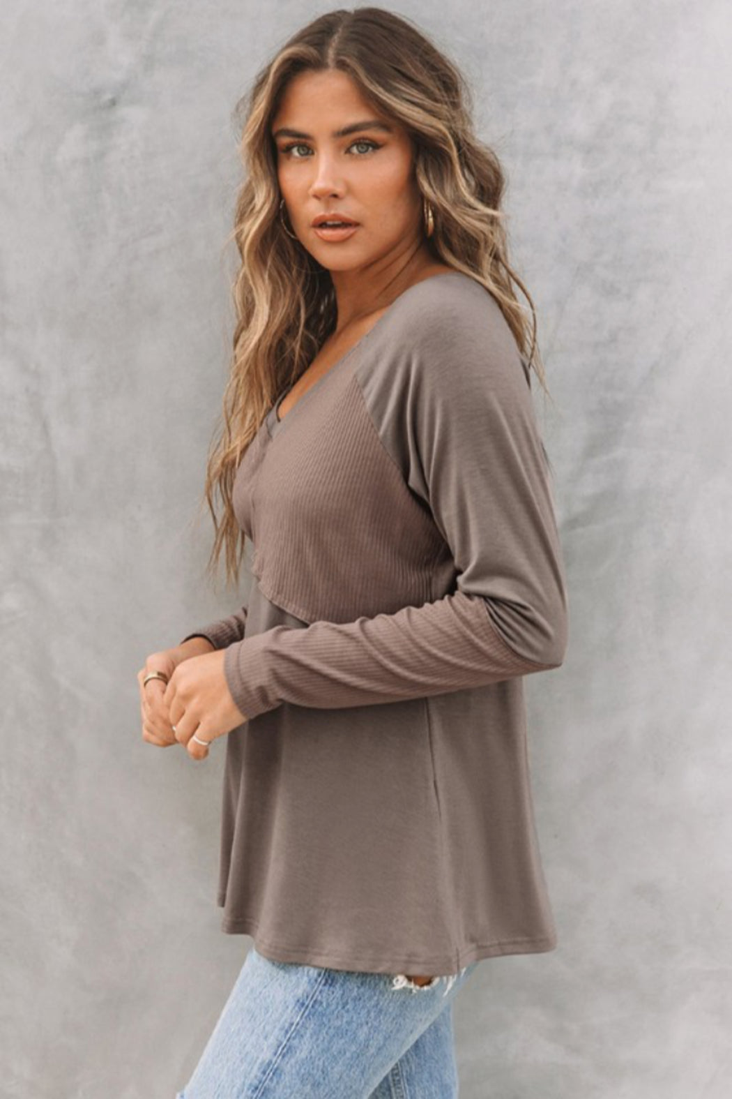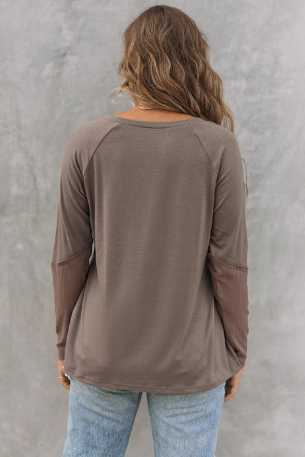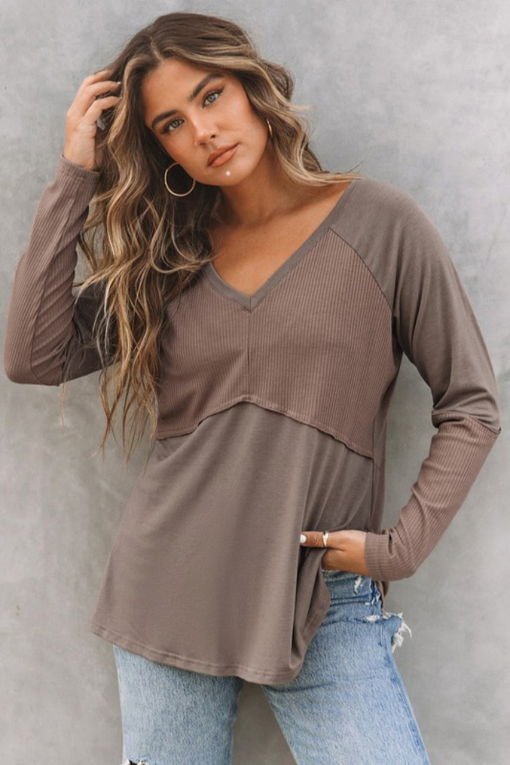This long sleeve top features a v neckline and ribbed patches on the sleeves and top front. Pairs great with your favorite jeans.