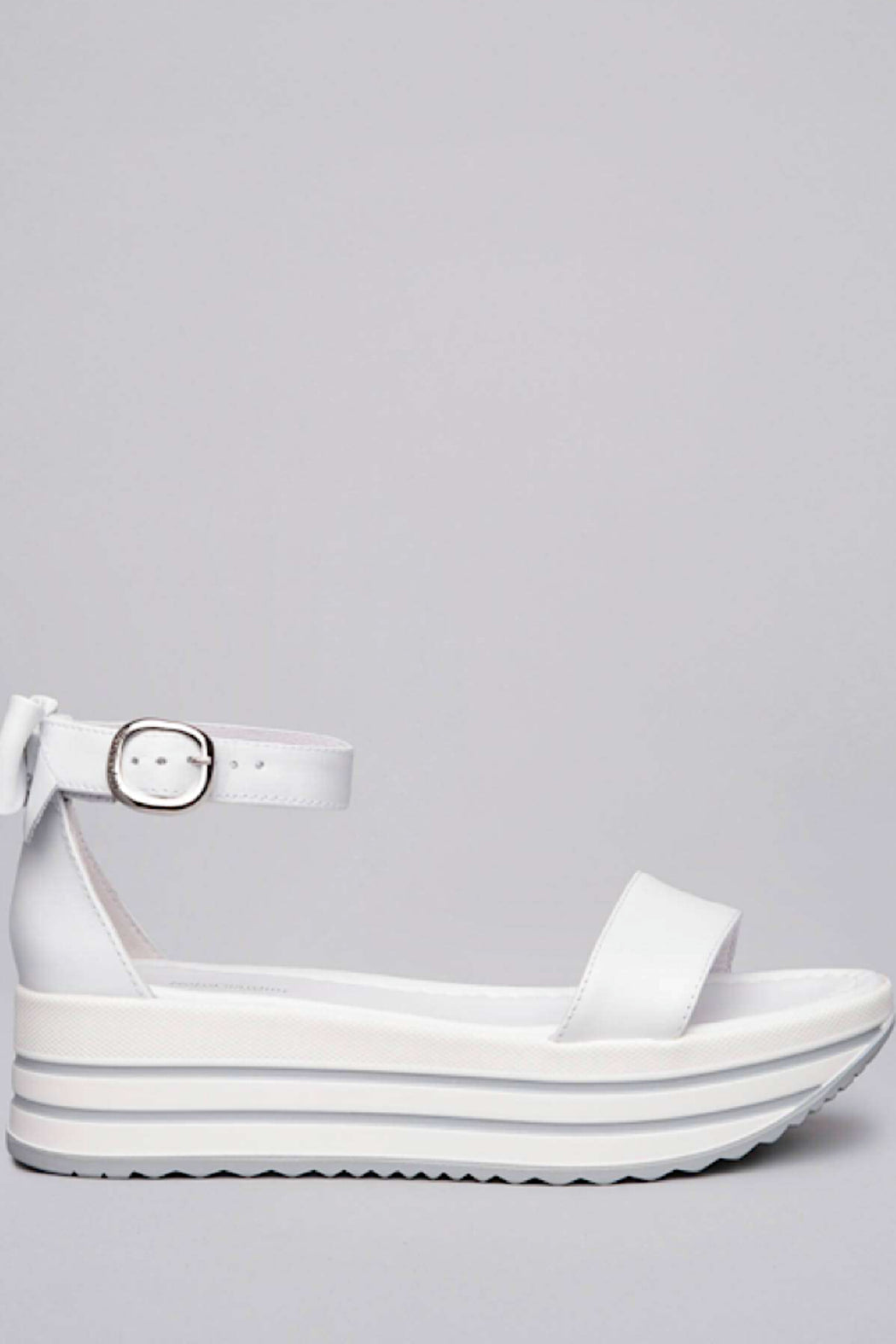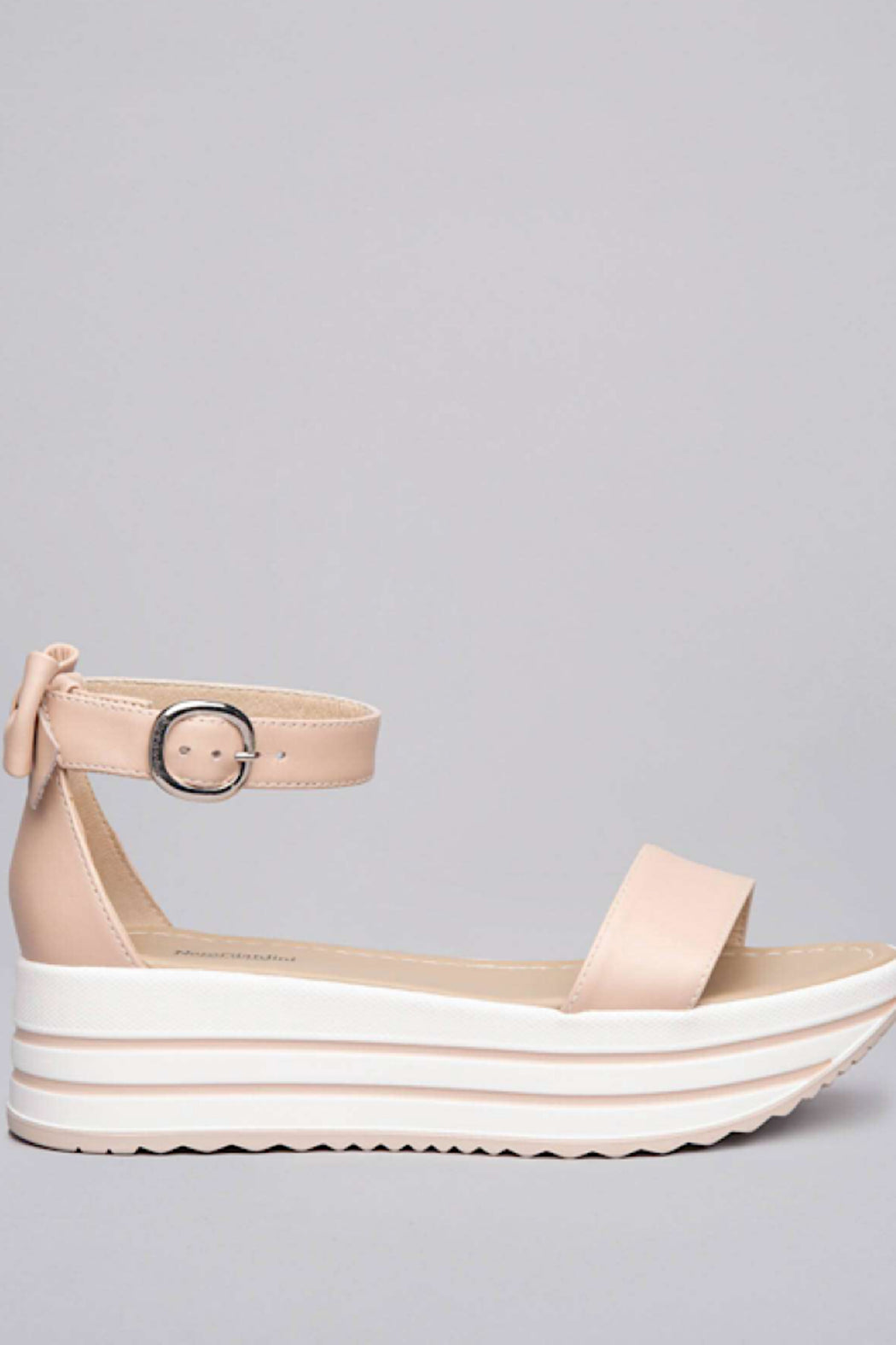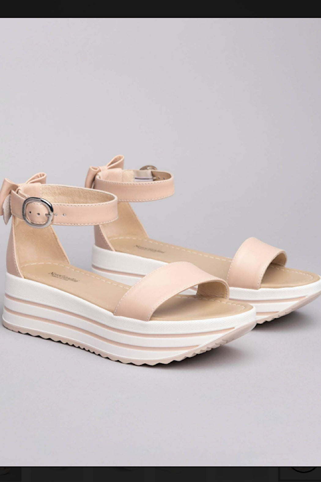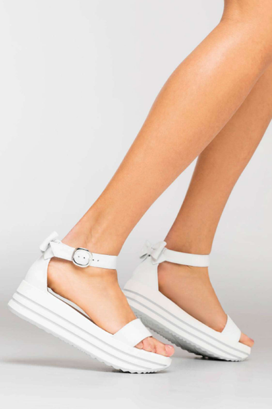 Leather sandals with ankle strap and leather bow at the back. Two-tone sole on 4.5 cm platform. Minimal design for a romantic fashion look.